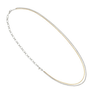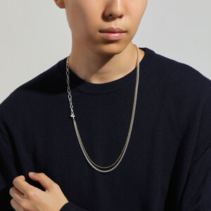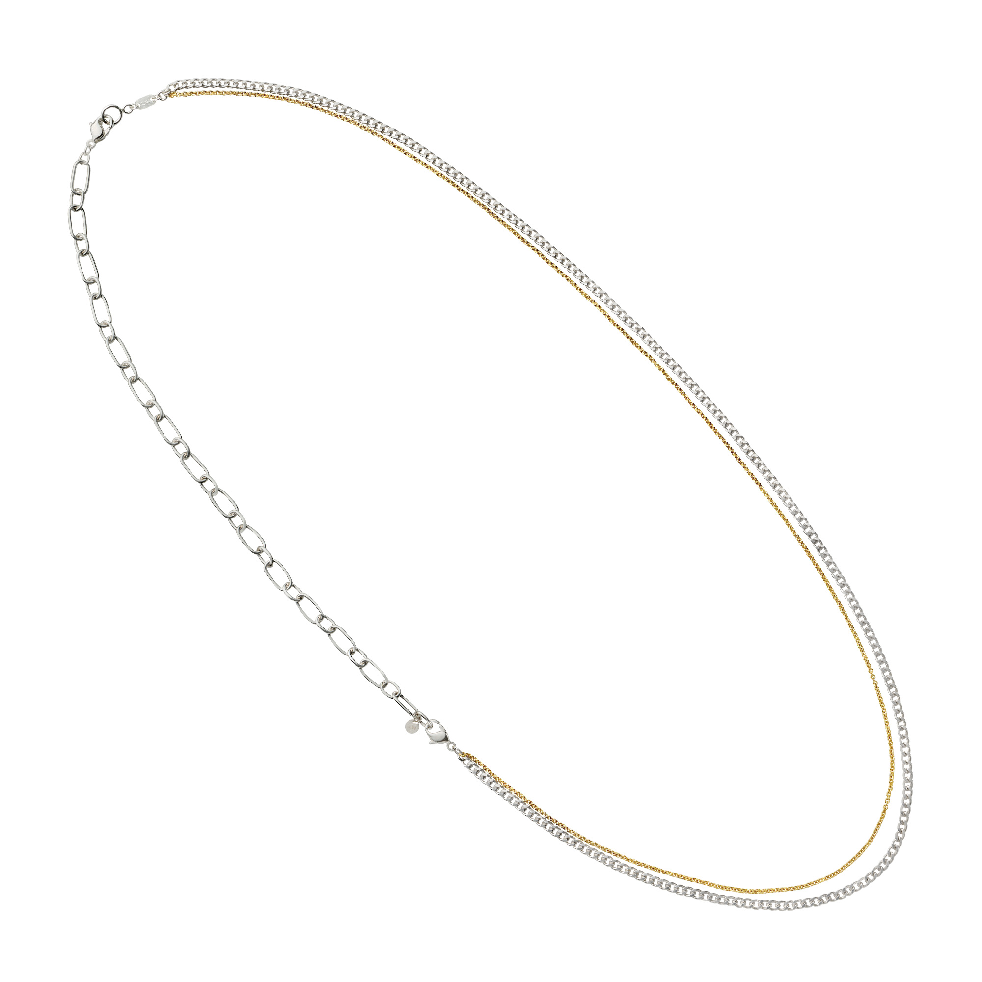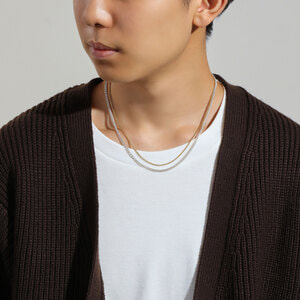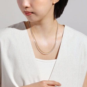 アズキチェーンと喜平チェーンが2連になっているネックレスは、差のついた2本が付かず離れずの絶妙な距離感でデザインされていて、程よいボリュームでありながら抜け感があり使いやすい仕様。