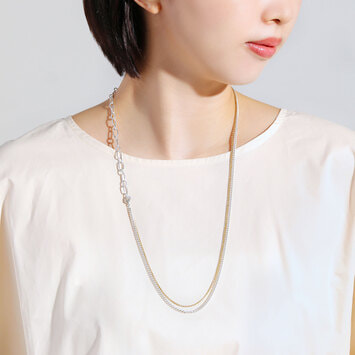 ロングネックレスの状態ではアシンメトリーなチェーンの切り替えがデザイン性の高いネックレス。