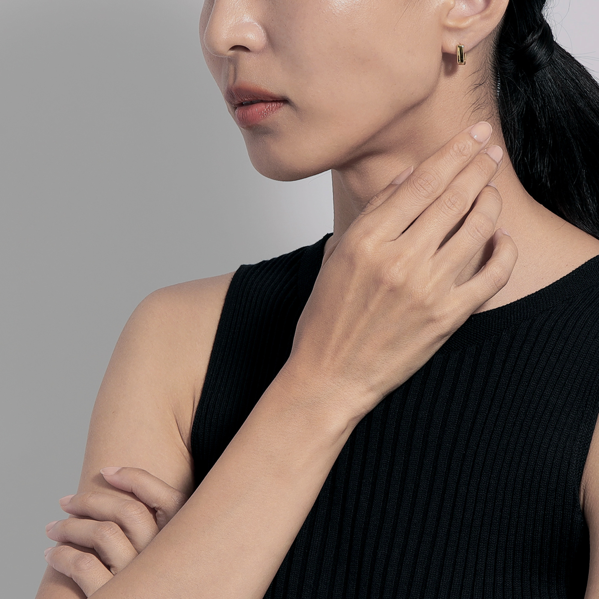スクエア型がモダンでシャープな印象のキャッチレスピアス。