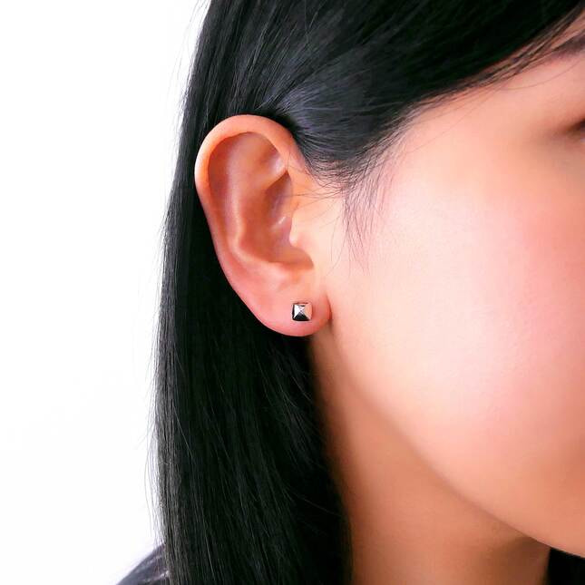 ピラミッド状の立体感が表裏楽しめるシルバーのスタッズピアス(片耳用)。