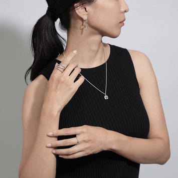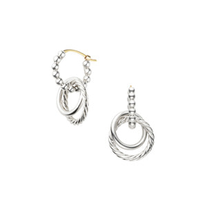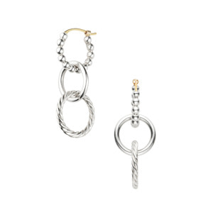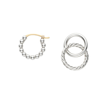 下がりのパーツは取り外しができ、ベーシックにフープだけで楽しんだり、長めに下げたりまとめてボリュームを出したりと、コーディネートに合わせて色々なアレンジを楽しめるデザインです。