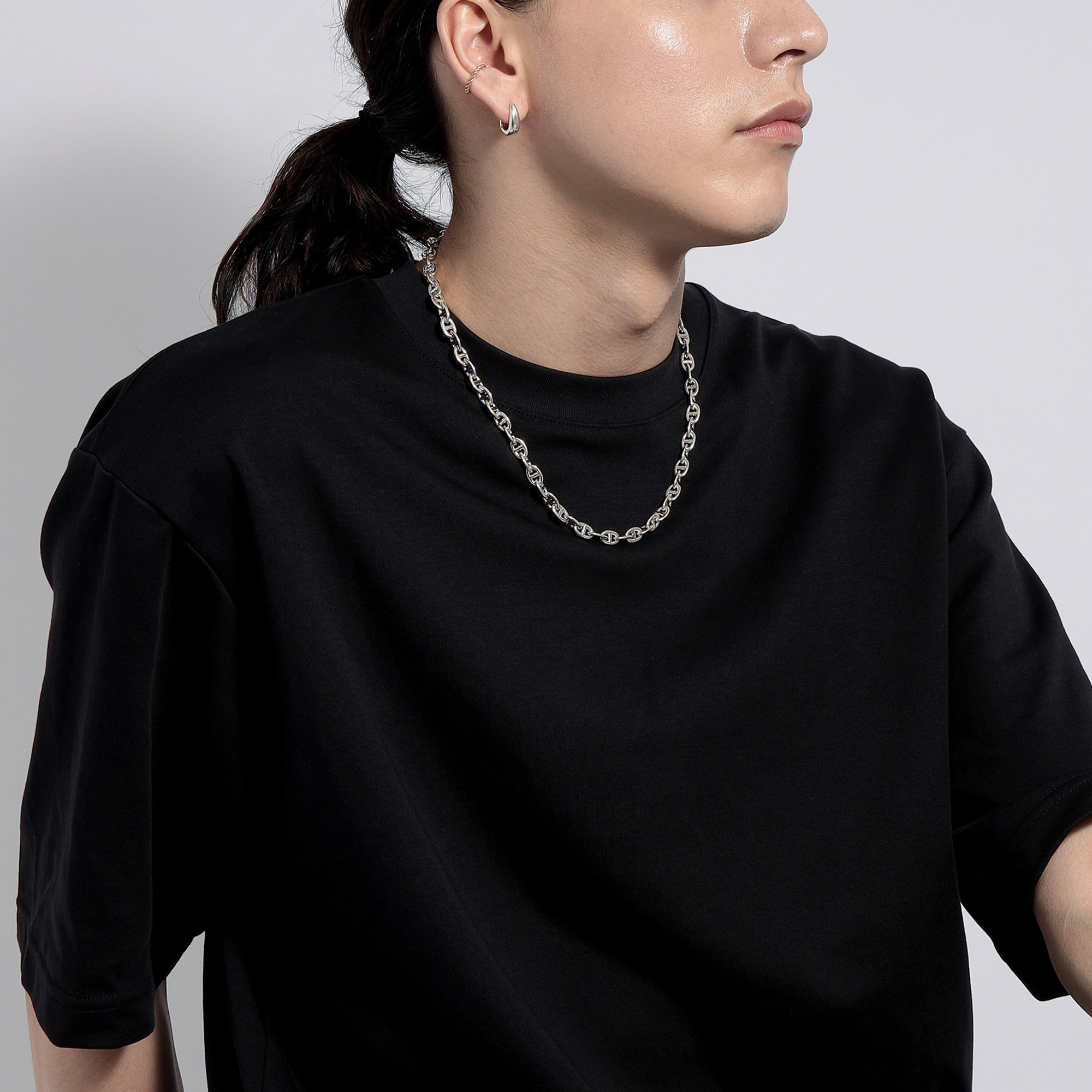 正面はたっぷりとした地金感が魅力の立体感を感じられ、後ろ側はスッキリとしたボリュームに抑えることで、バランスの強弱と着け心地の良さにこだわったデザインに。