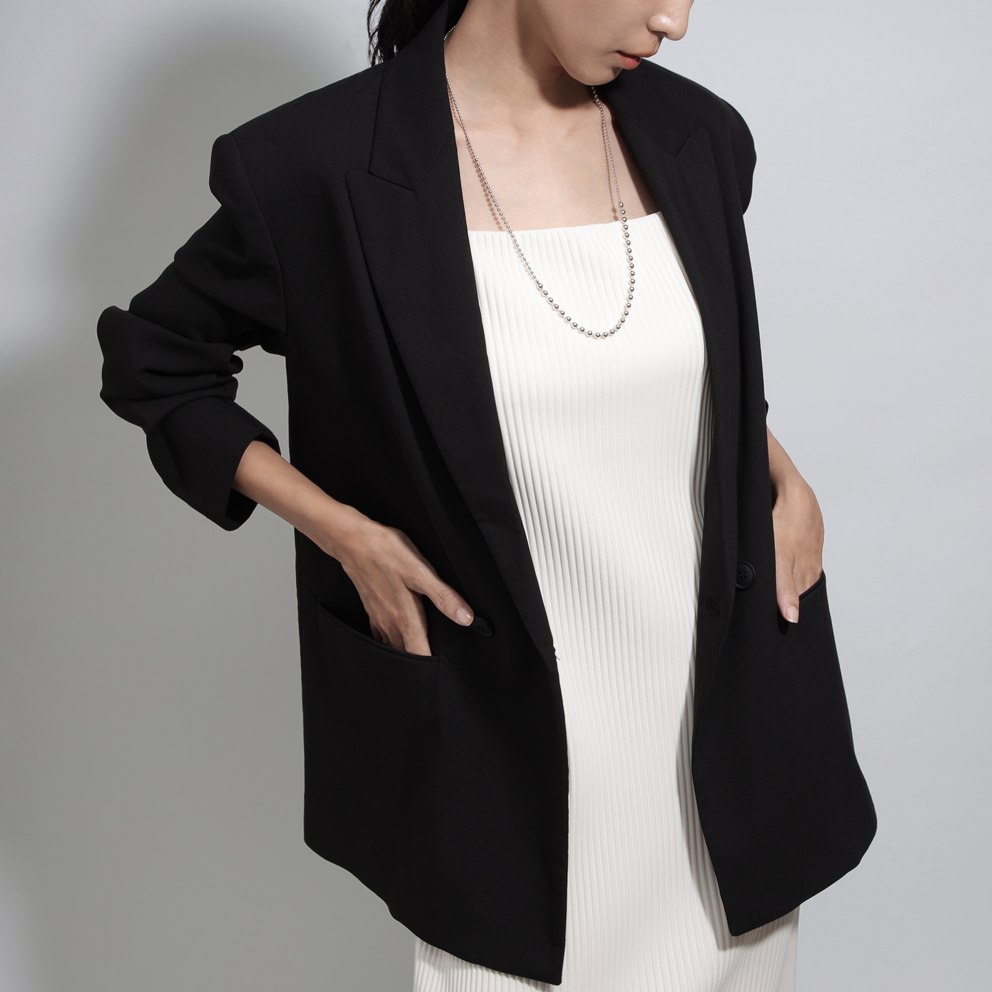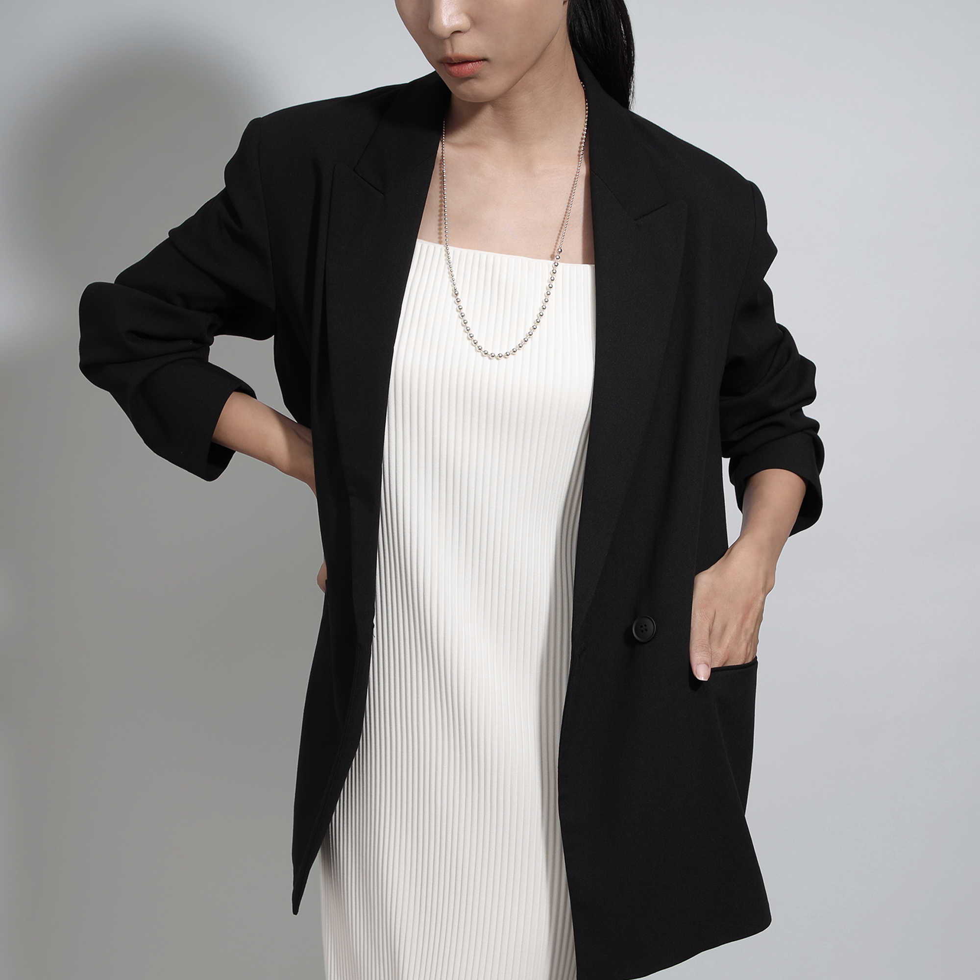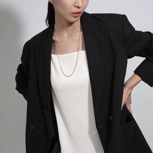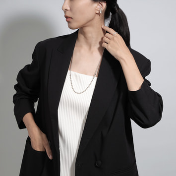 70cmのネックレスは1本で存在感があり、インパクトのある粒感が装いのポイントに。