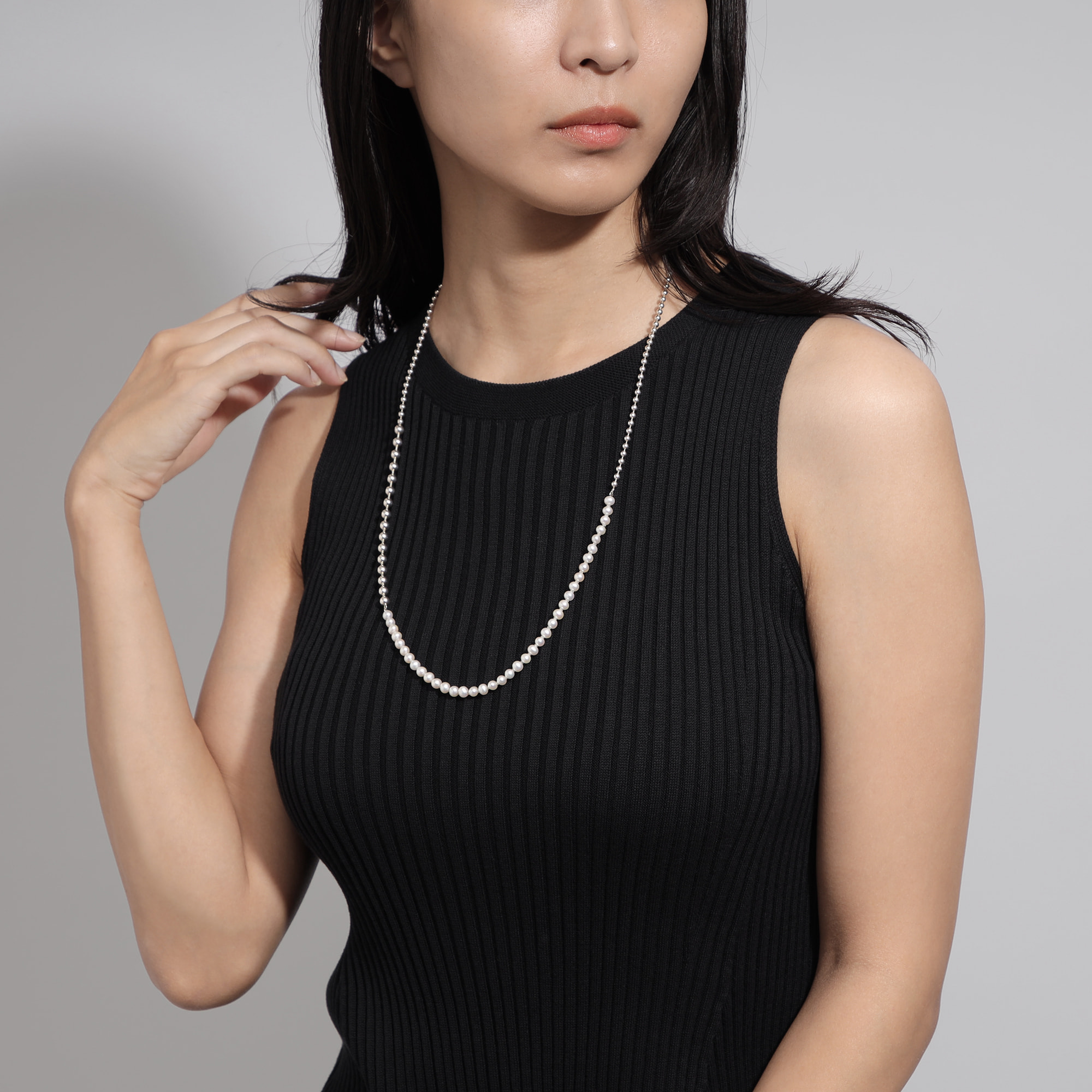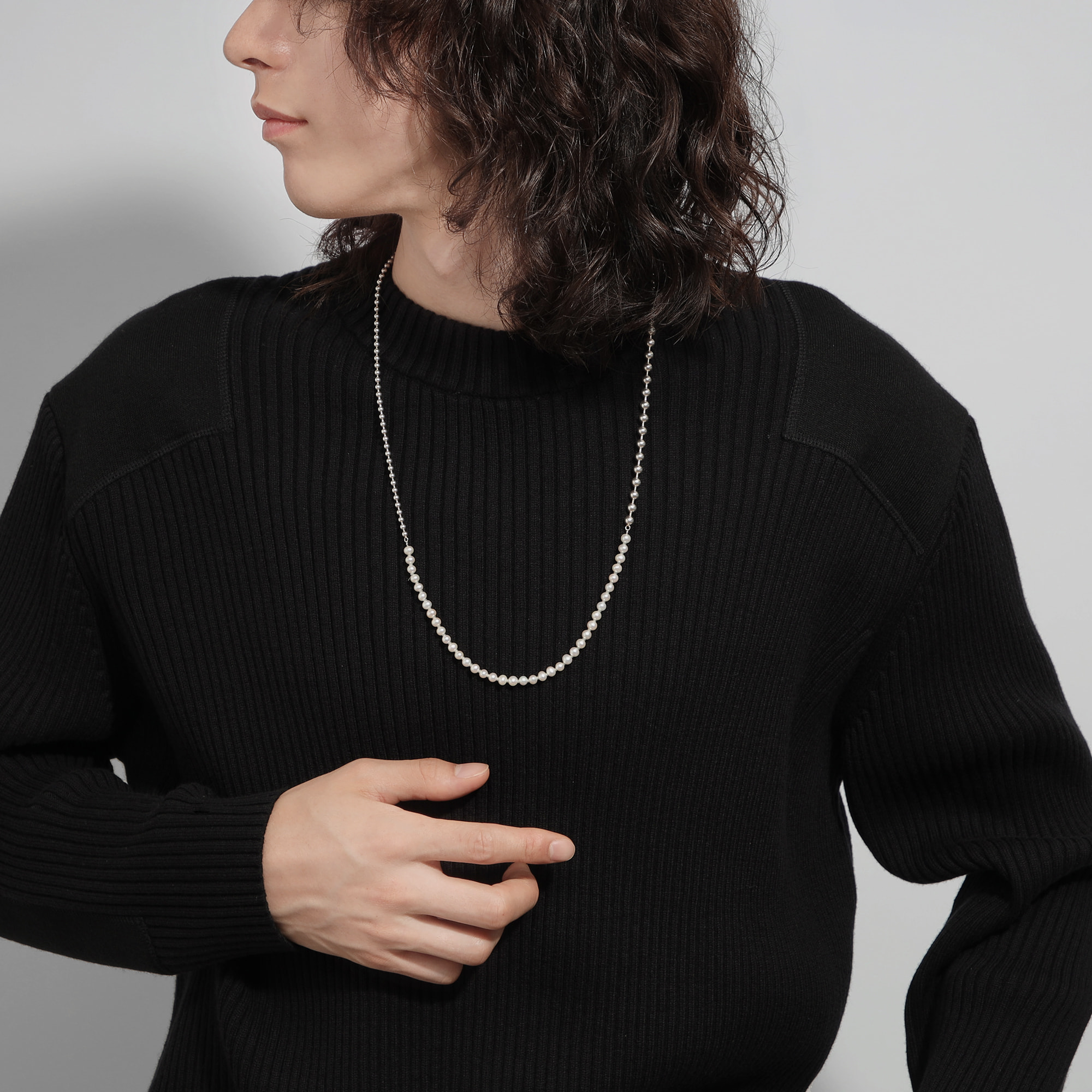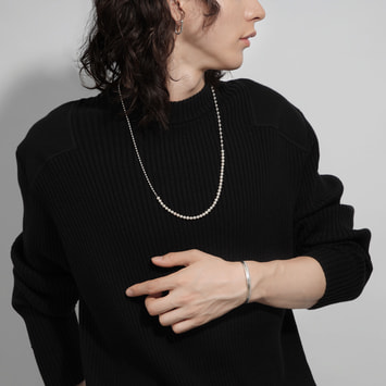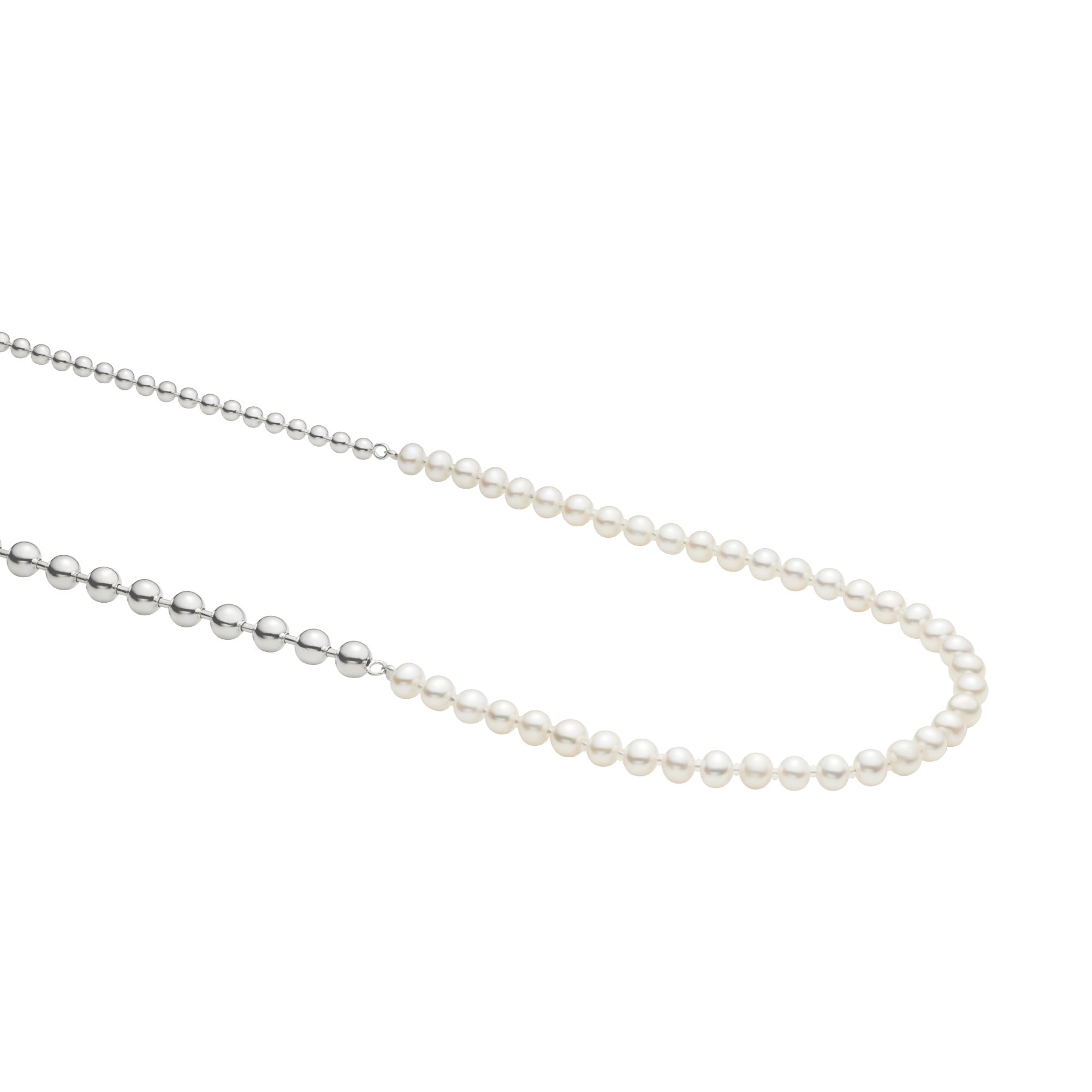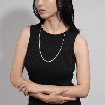 フォーマルな印象のパールネックレスもシルバーボールとのハイブリットスタイルなら、どんな服装にも合わせられる万能アイテムです。