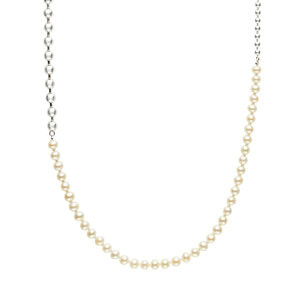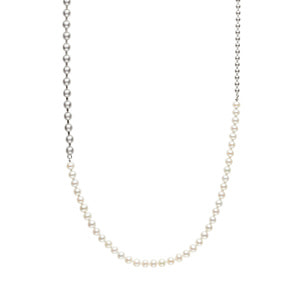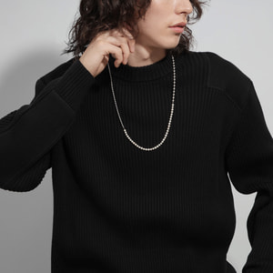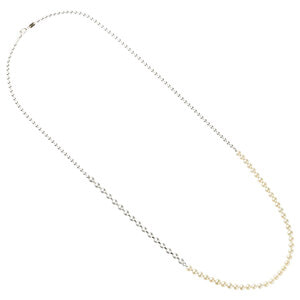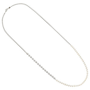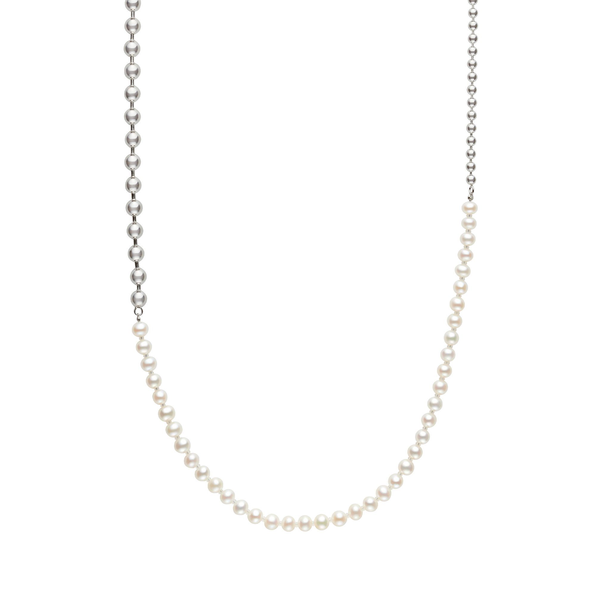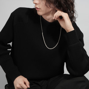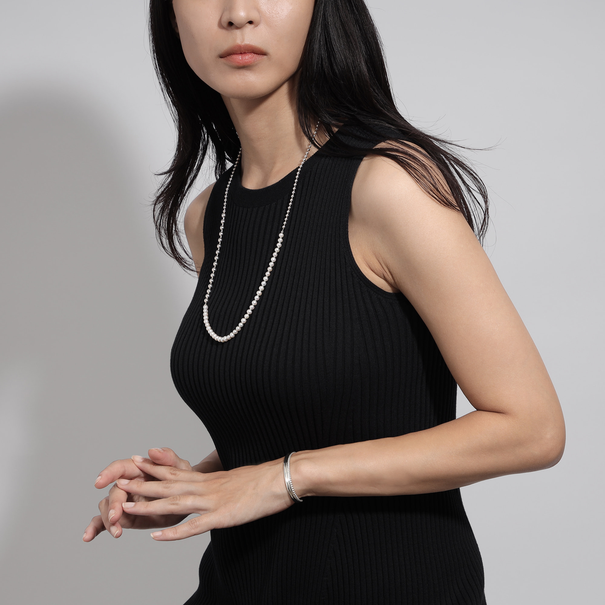 フォーマルな印象のパールネックレスもシルバーボールとのハイブリットスタイルなら、どんな服装にも合わせられる万能アイテムです。