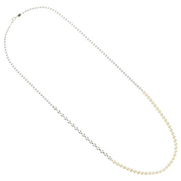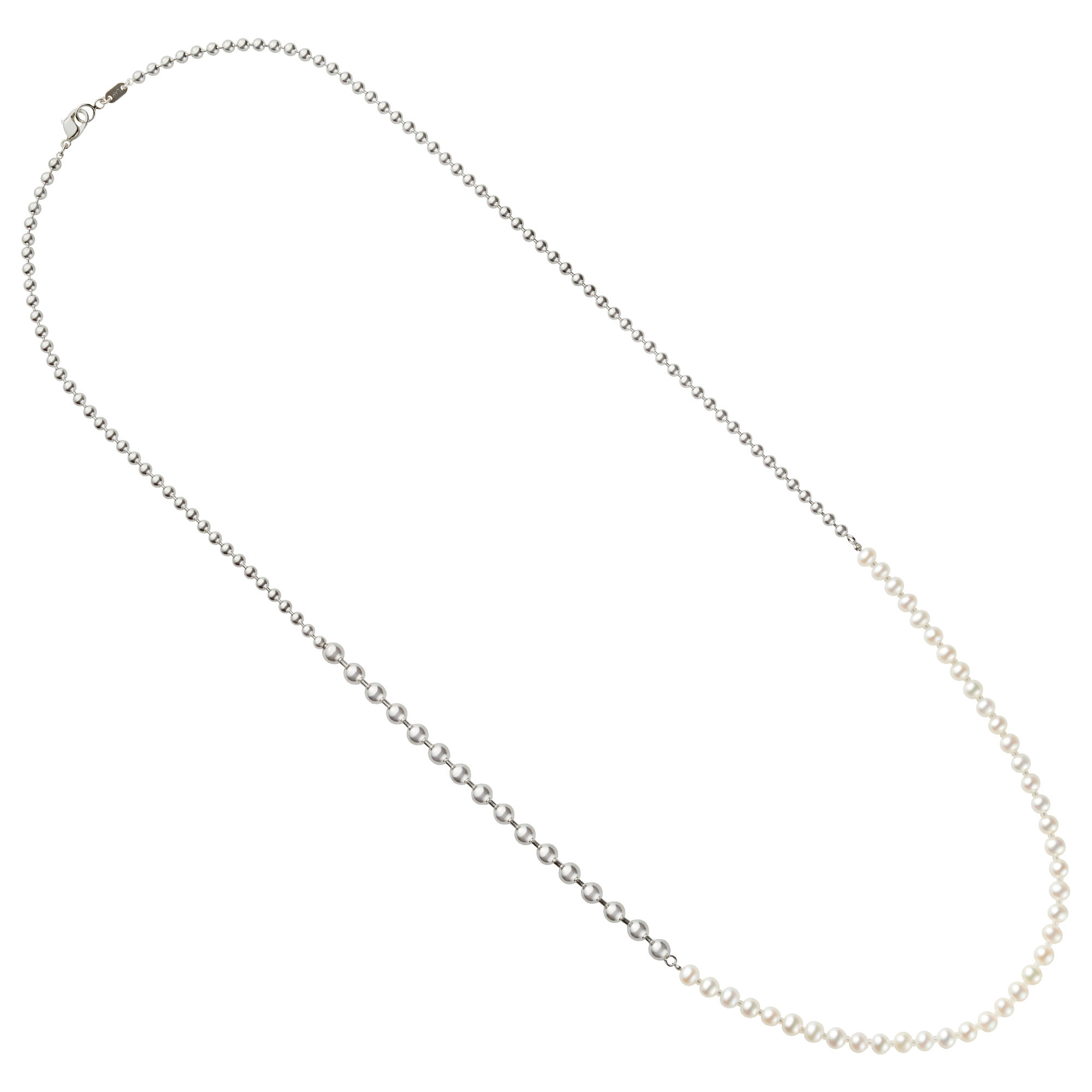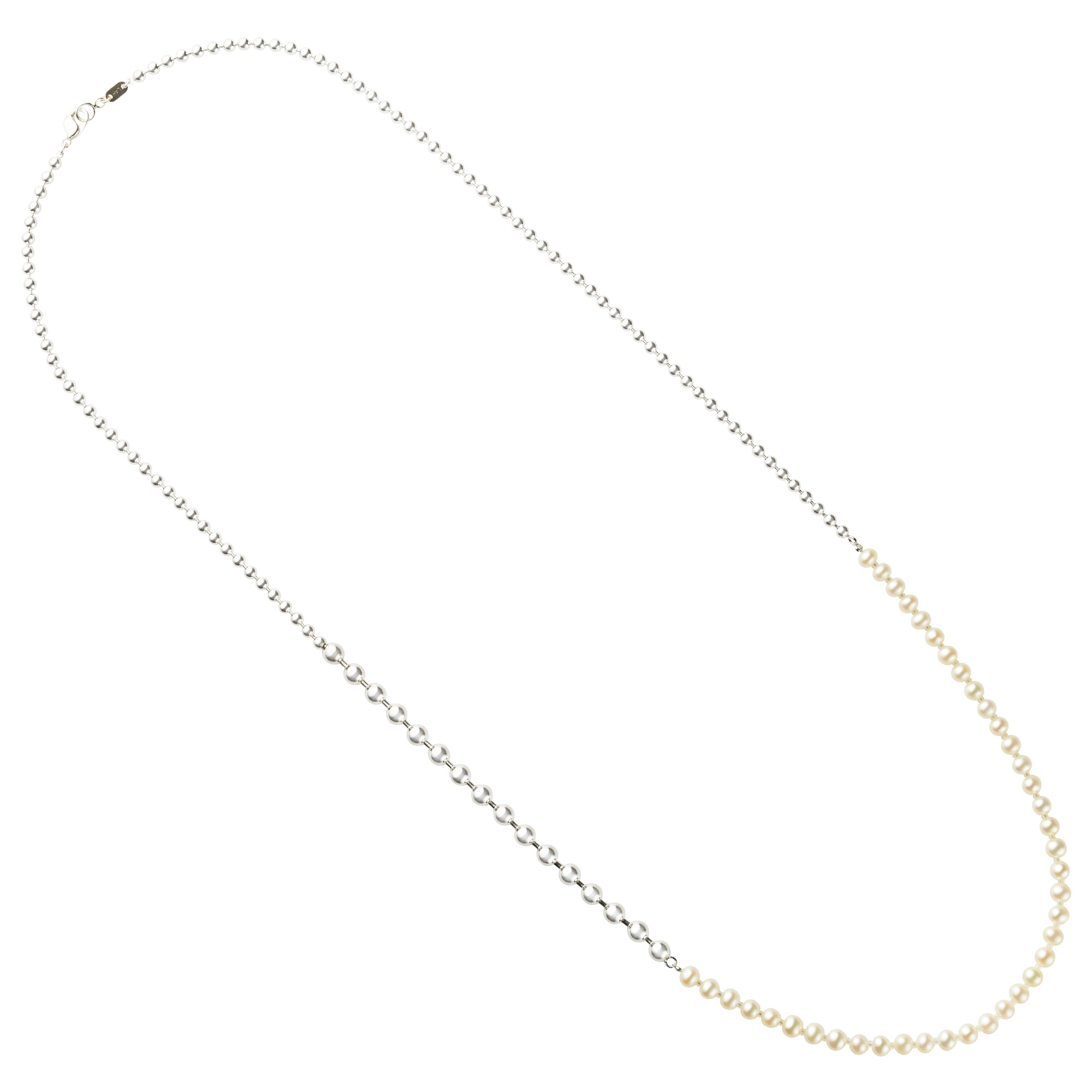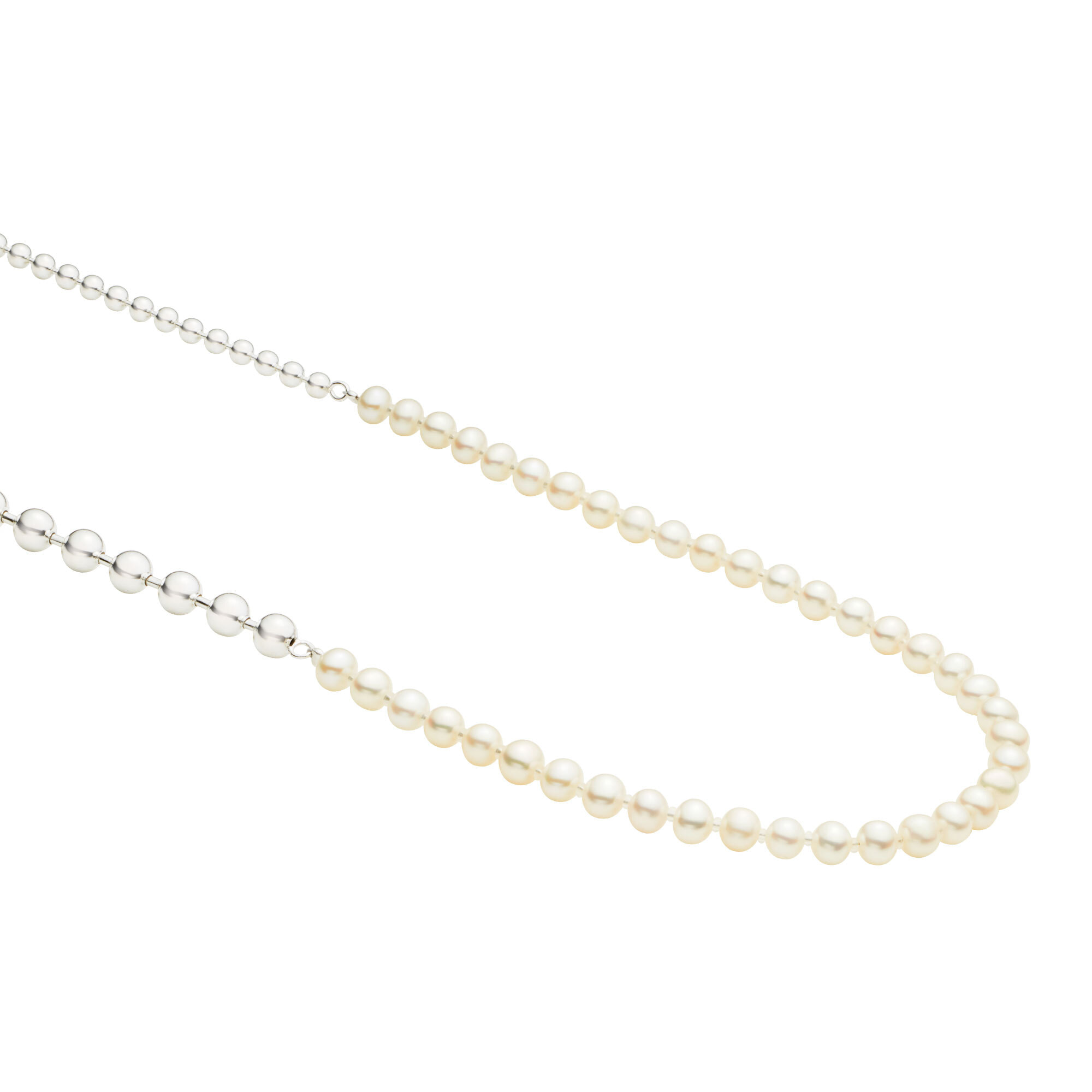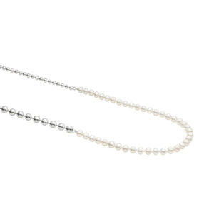 大きさの違うシルバーのボールと淡水パールをアシンメトリーに配したロングタイプのネックレス。