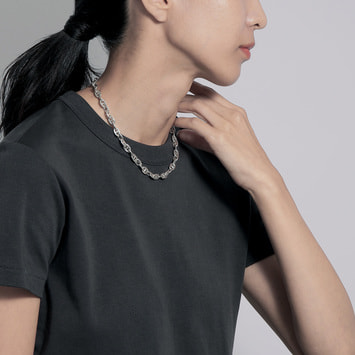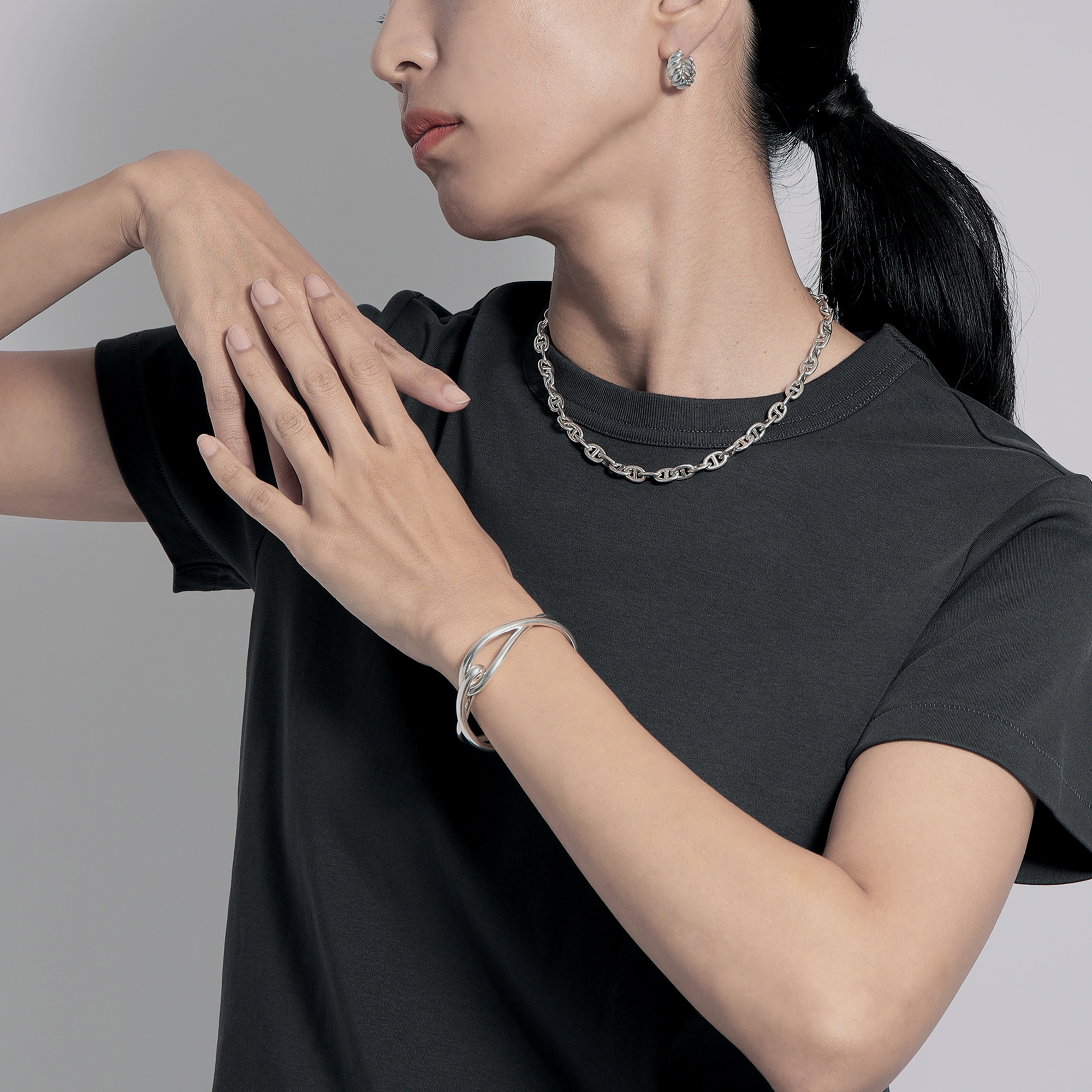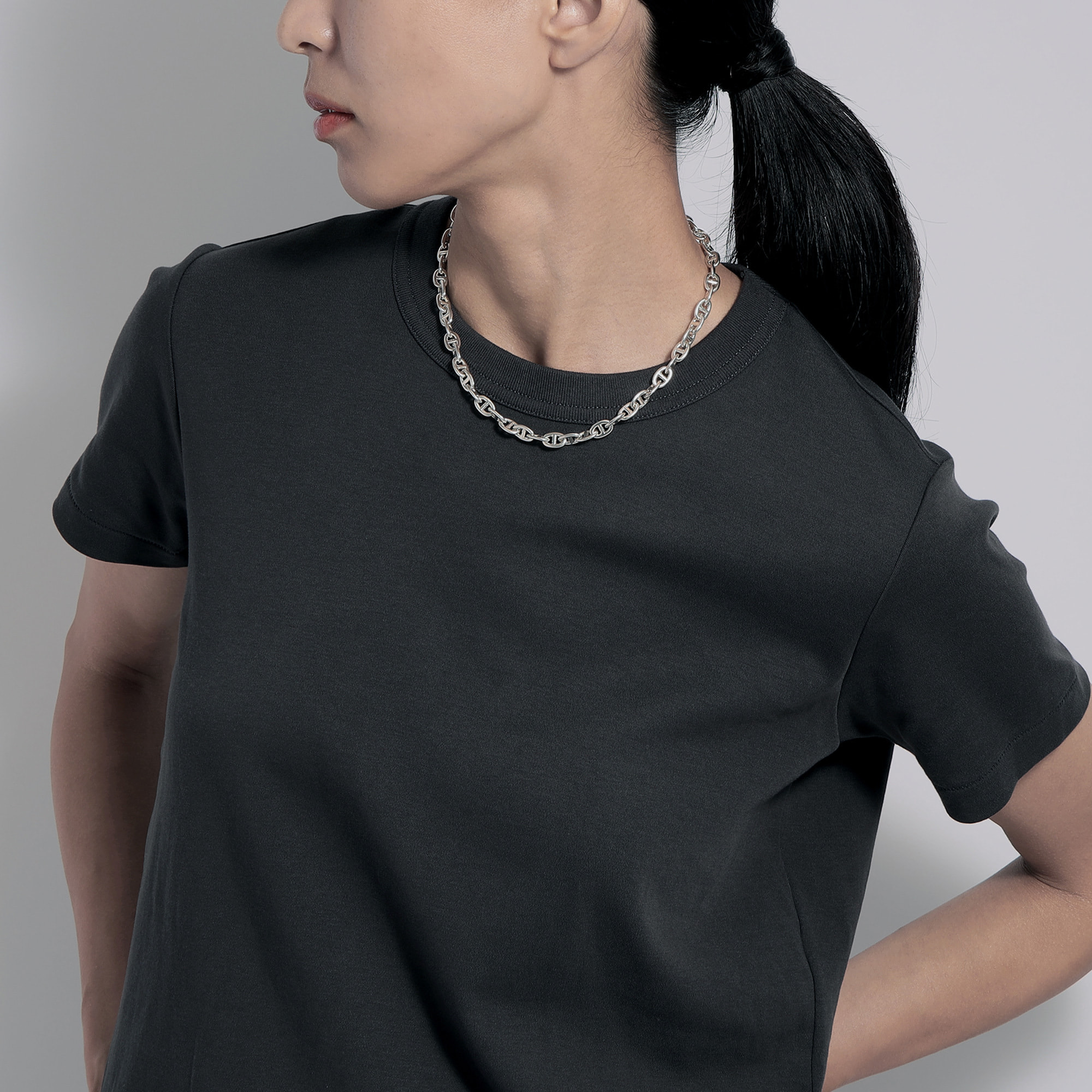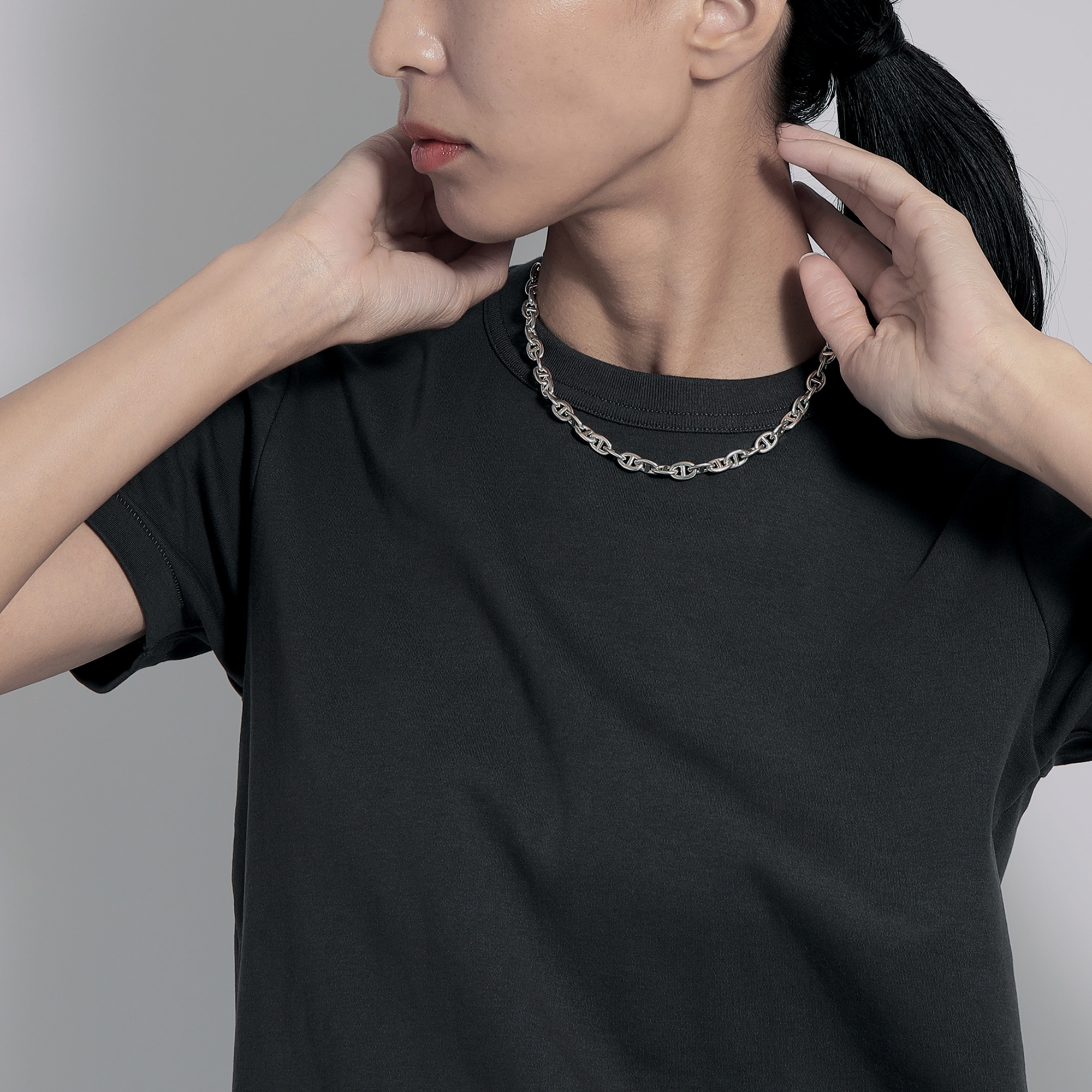 首周りの繊細な肌に直接触れるアイテムだからこそ、1コマずつ丁寧に磨きを入れた肌触りの良い仕上げに拘り、しっとりと身体に寄り添うネックレスに仕上げました。