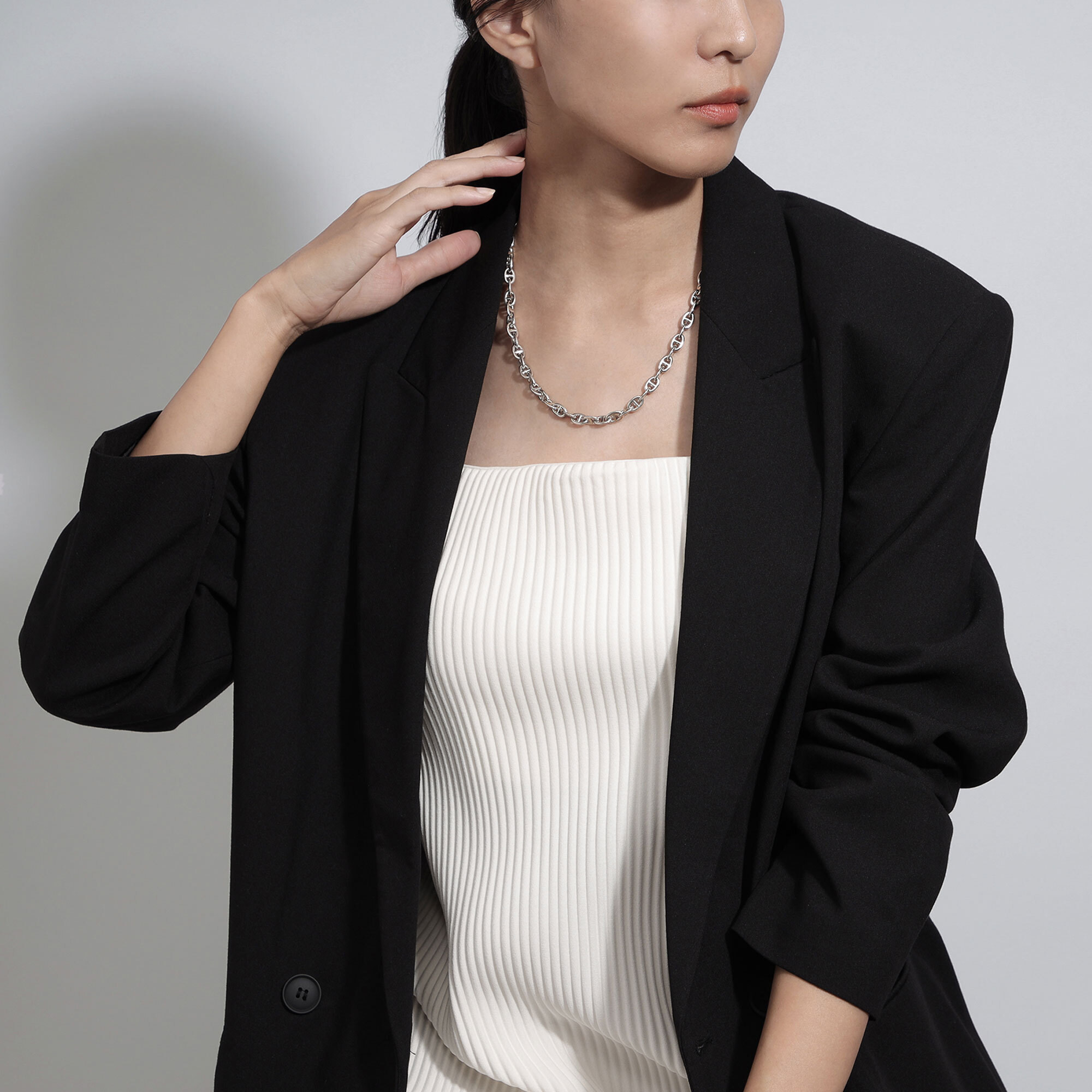 首周りの繊細な肌に直接触れるアイテムだからこそ、1コマずつ丁寧に磨きを入れた肌触りの良い仕上げに拘り、しっとりと身体に寄り添うネックレスに仕上げました。