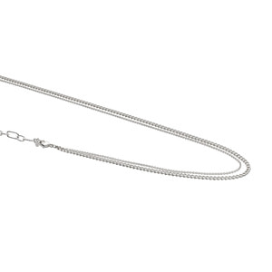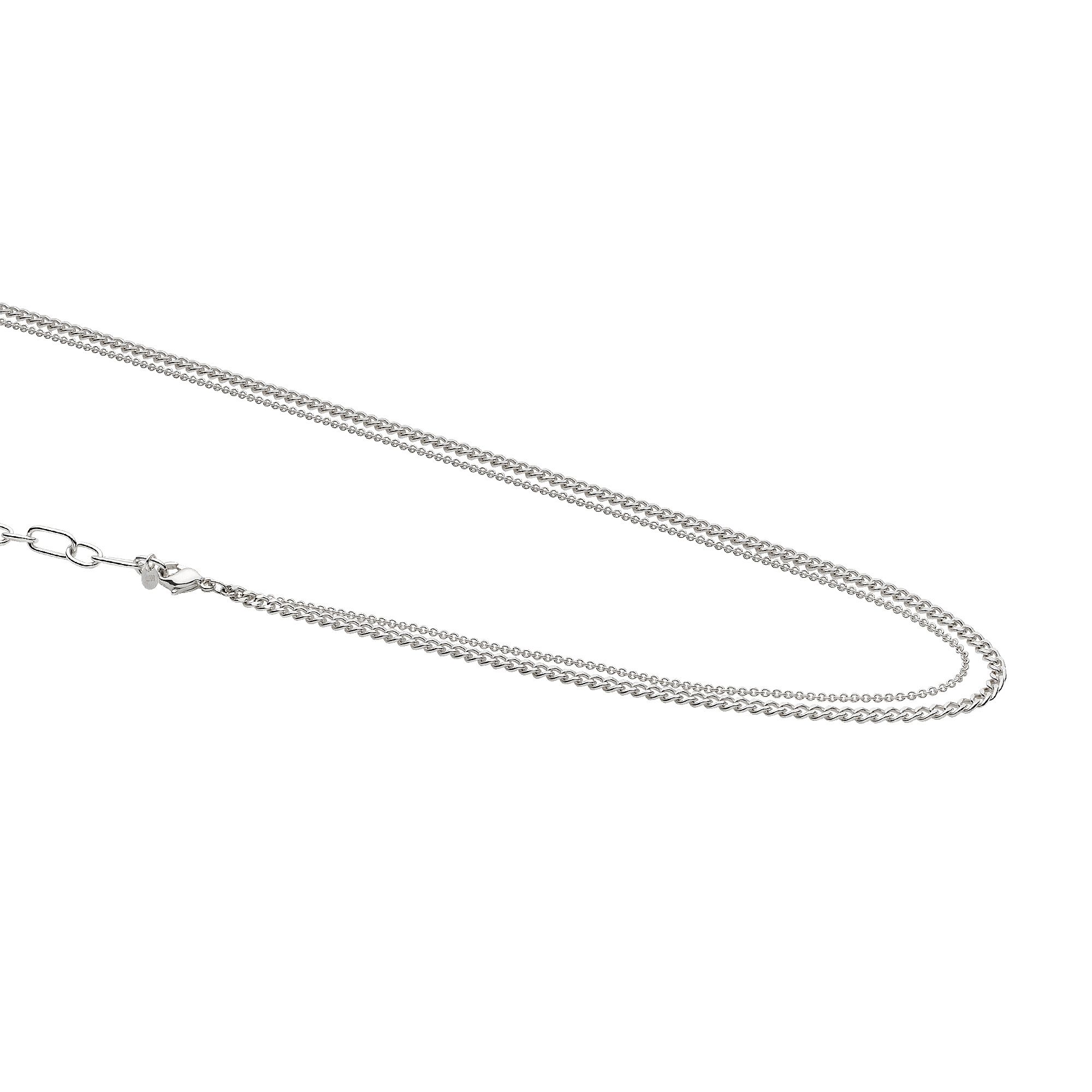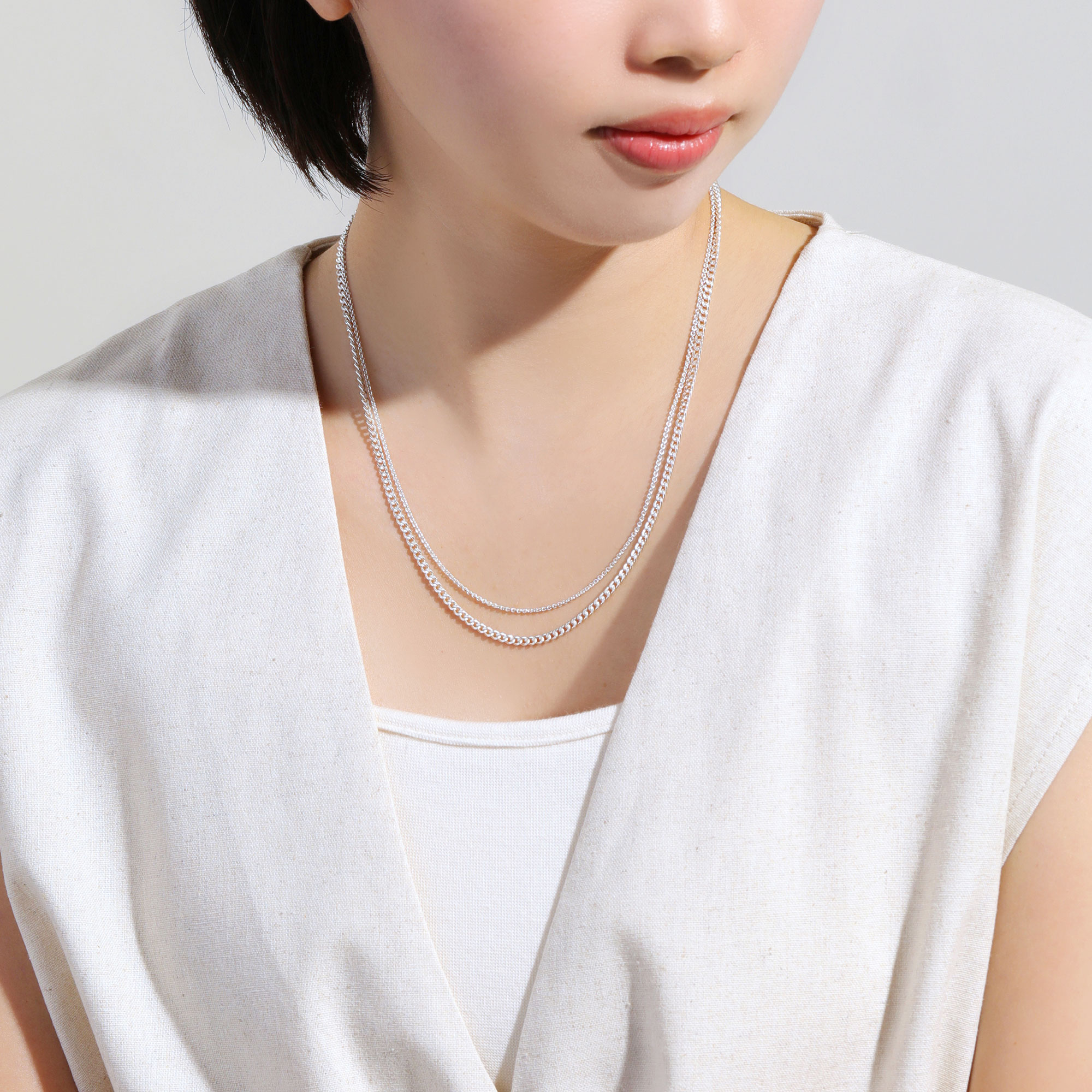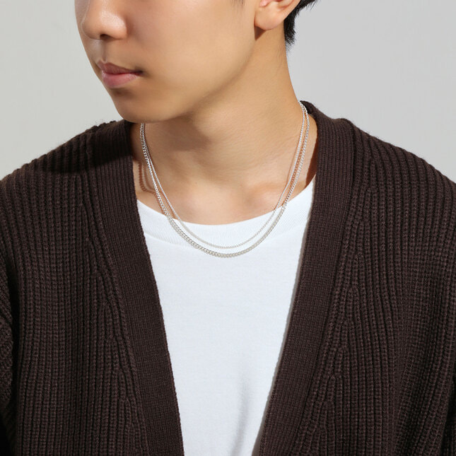アズキチェーンと喜平チェーンが2連になっているネックレスは、差のついた2本が付かず離れずの絶妙な距離感でデザインされていて、程よいボリュームでありながら抜け感があり使いやすい仕様。