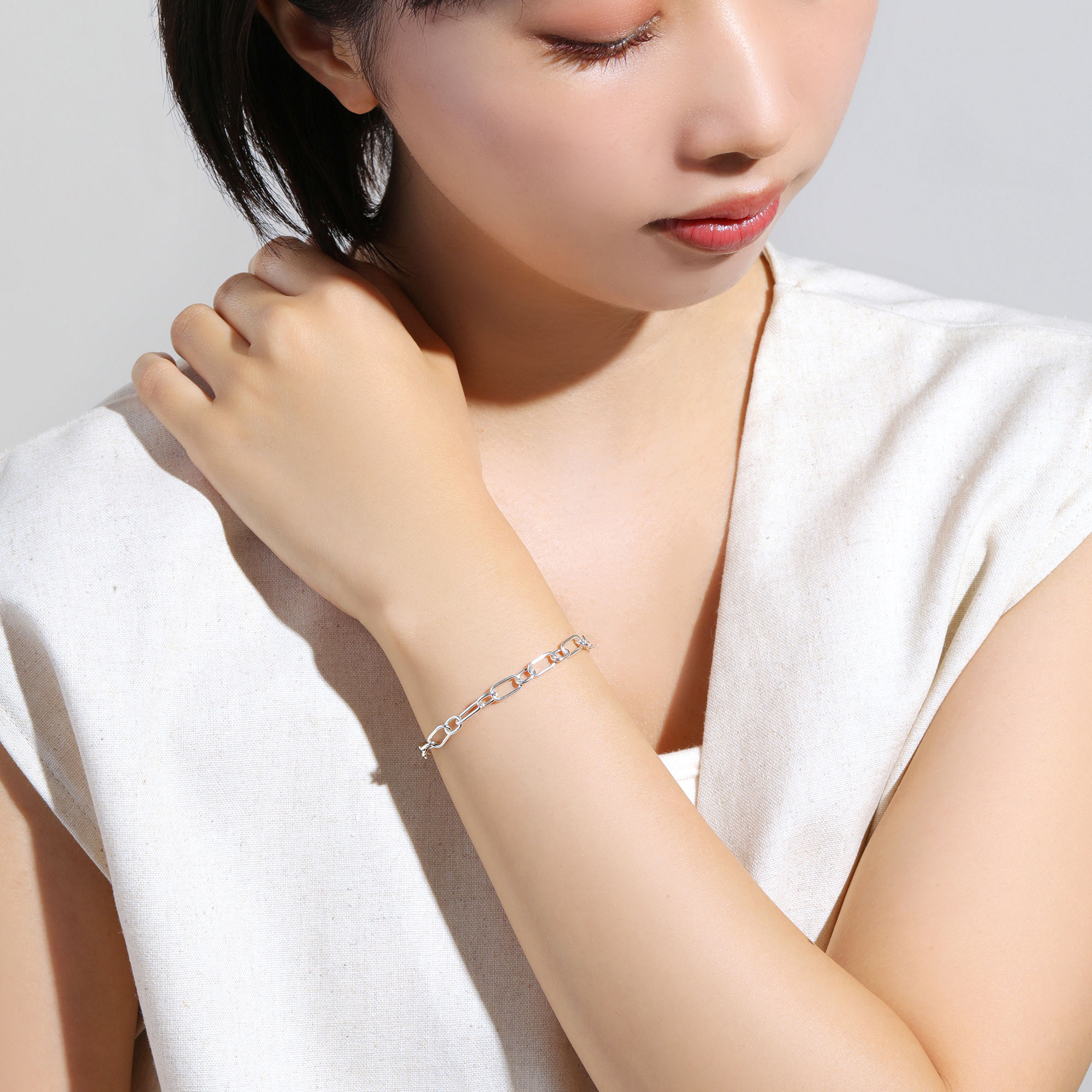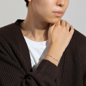 ロング&ショートのコマがニュアンスのあるチェーンなので、1本でサラッと着けて頂いても存在感のあるブレスレットです。