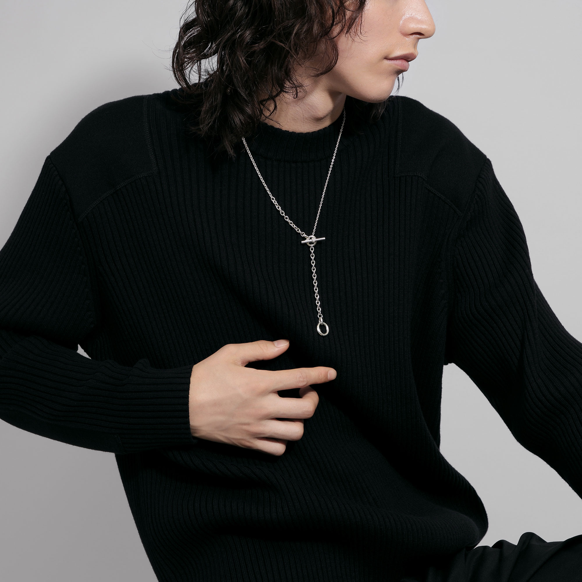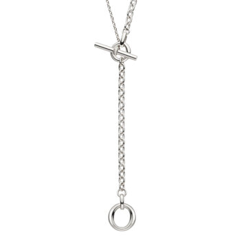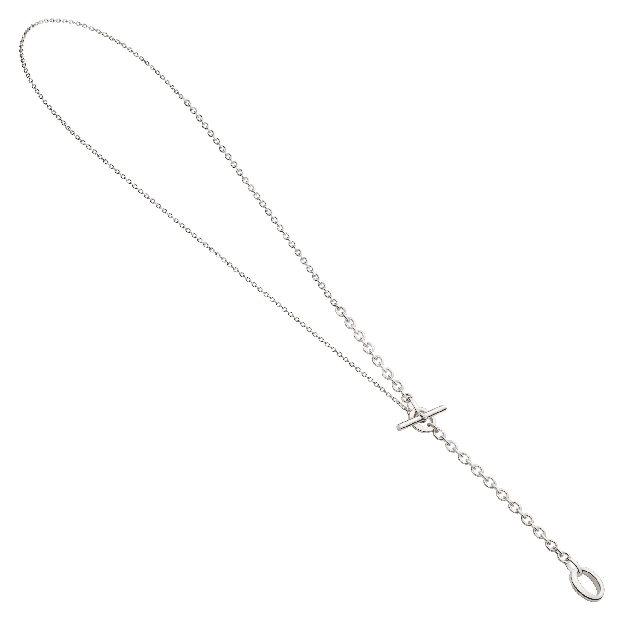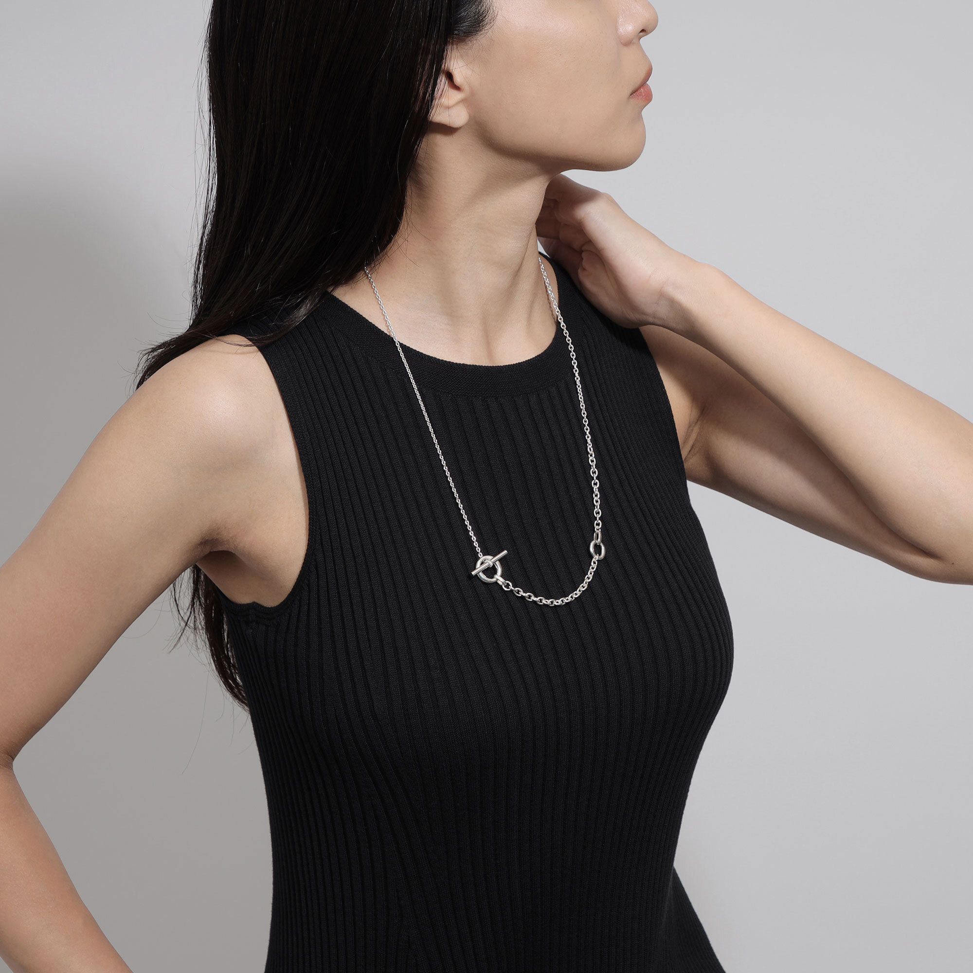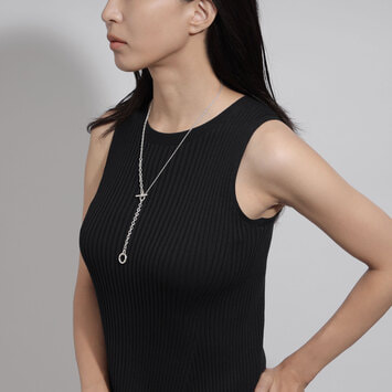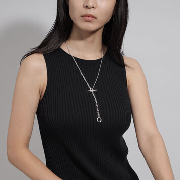 メイルズチェーンのコマをネックレスのデザインの一部に取り入れ、その輪にTバーのクラスプを組み合わせたマントル金具がデザインのポイントになった2wayネックレス。