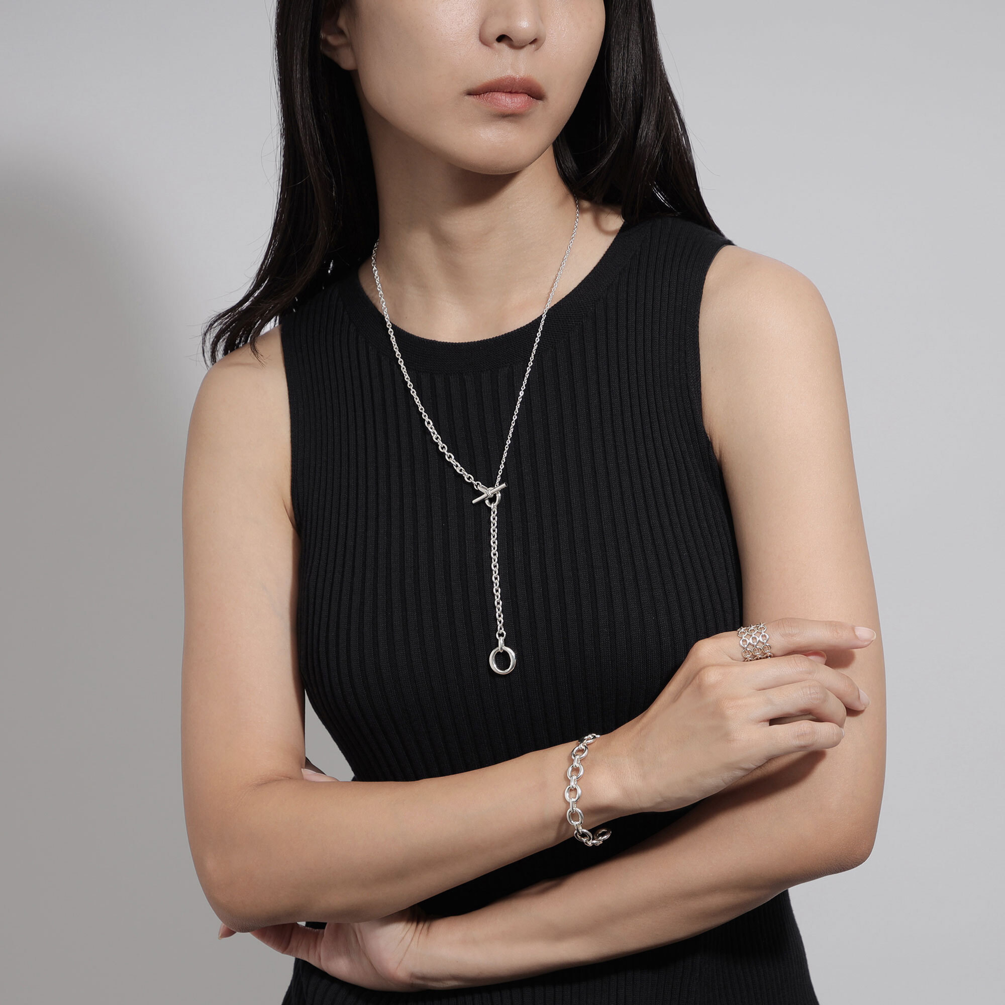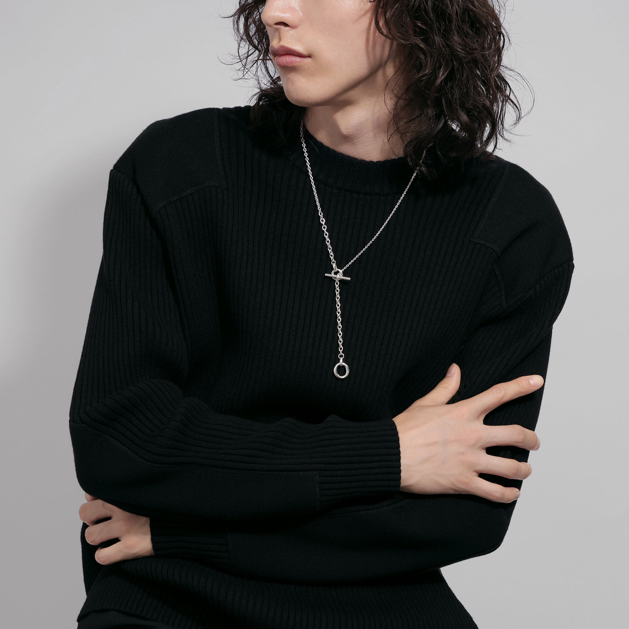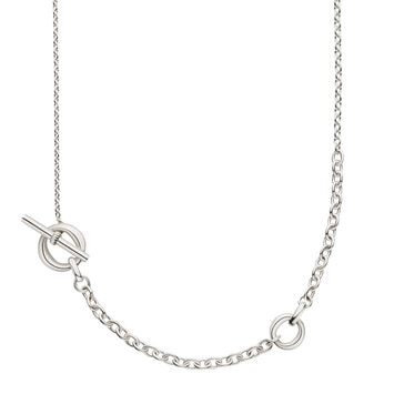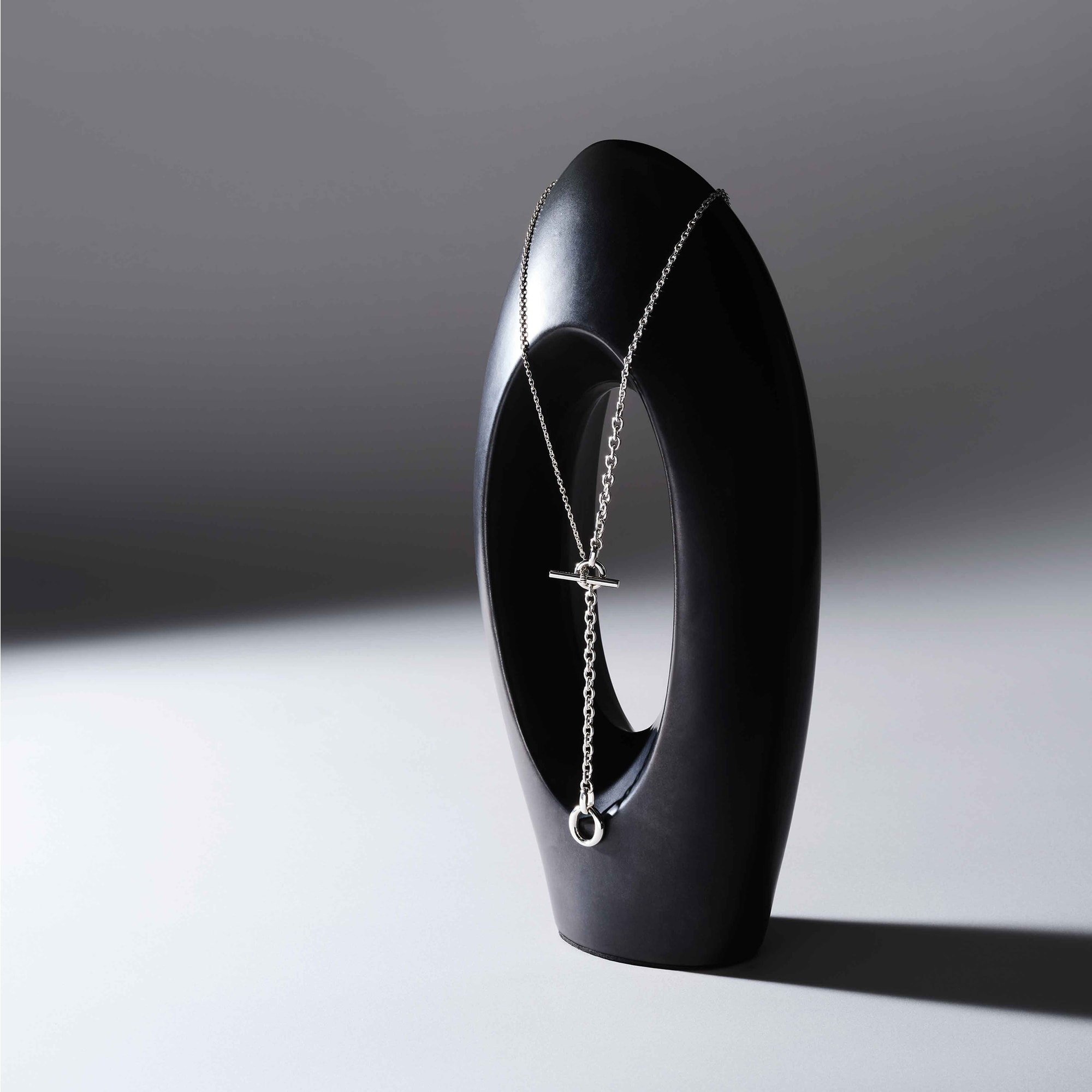 メイルズチェーンのコマをネックレスのデザインの一部に取り入れ、その輪にTバーのクラスプを組み合わせたマントル金具がデザインのポイントになった2wayネックレス。