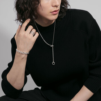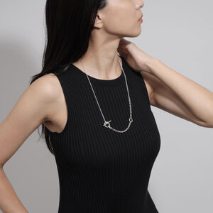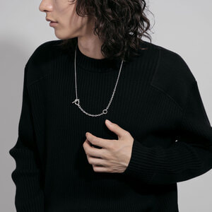 アシンメトリーになる様に配置された太さの違うチェーンが、スタイリングの主役になるネックレスです。
