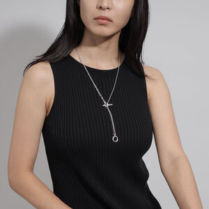 マントル金具で留めると55cmのY字ネックレスに、デザインされたトップのチャームにTバーを通すと65cmのネックレスとしてお使いいただけます。