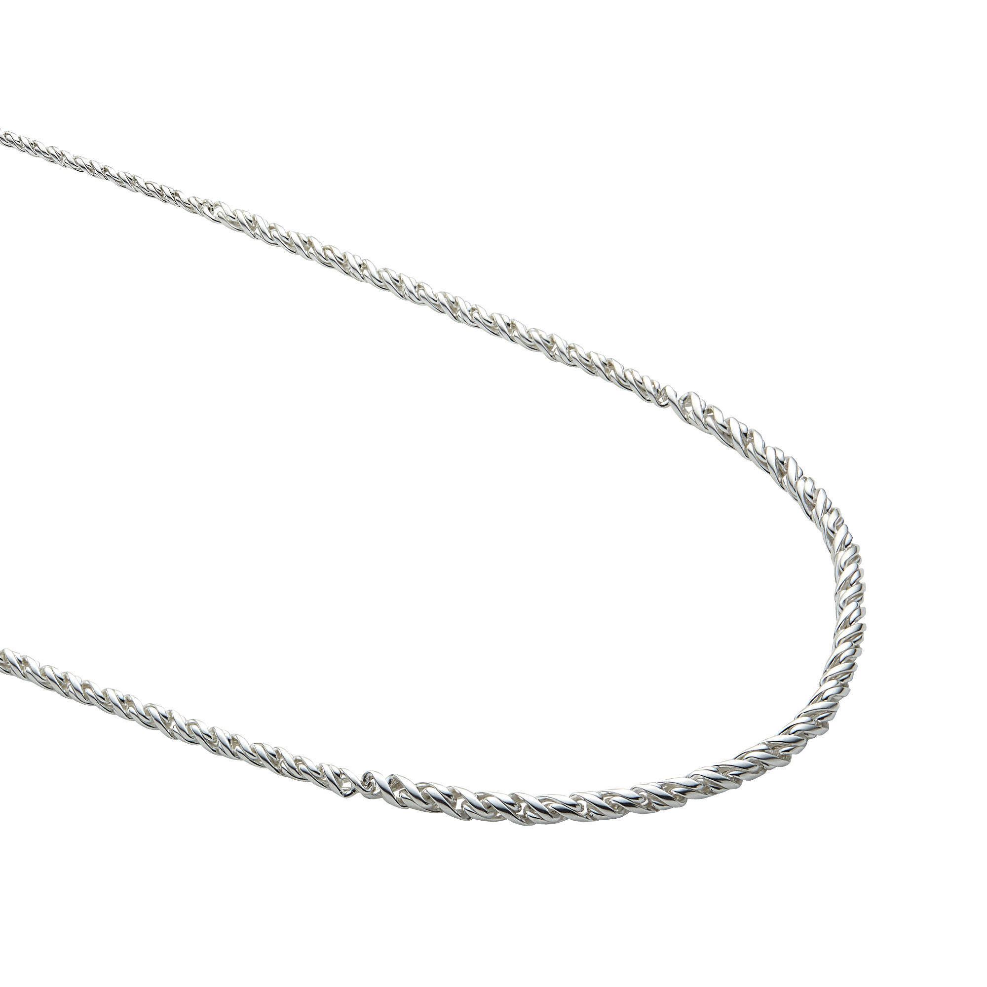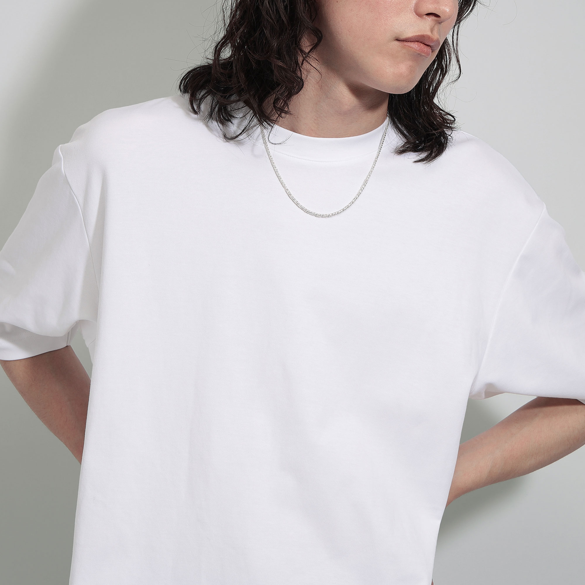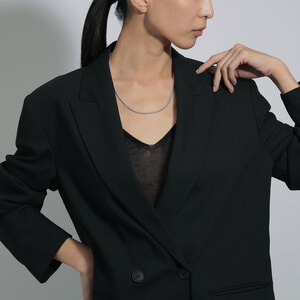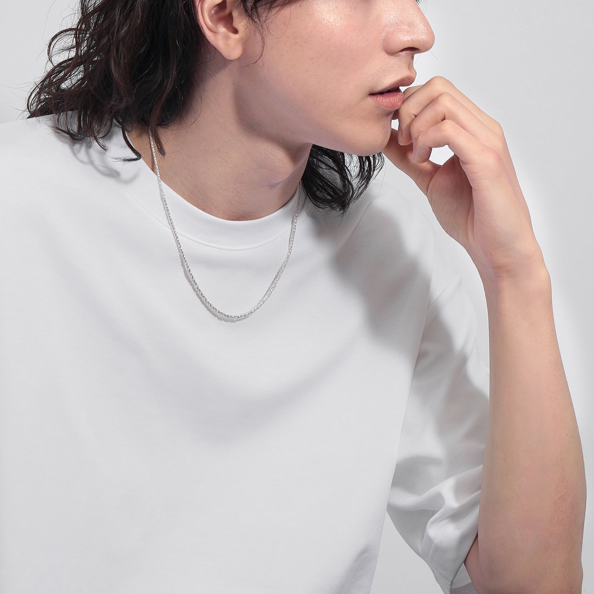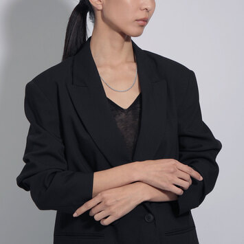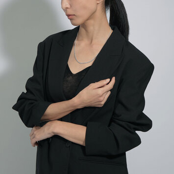 同じデザインのスクリューチェーンをサイズグラデーションに組み立てることで、トップにはボリュームがありつつ首周りがすっきりとする仕様に。
