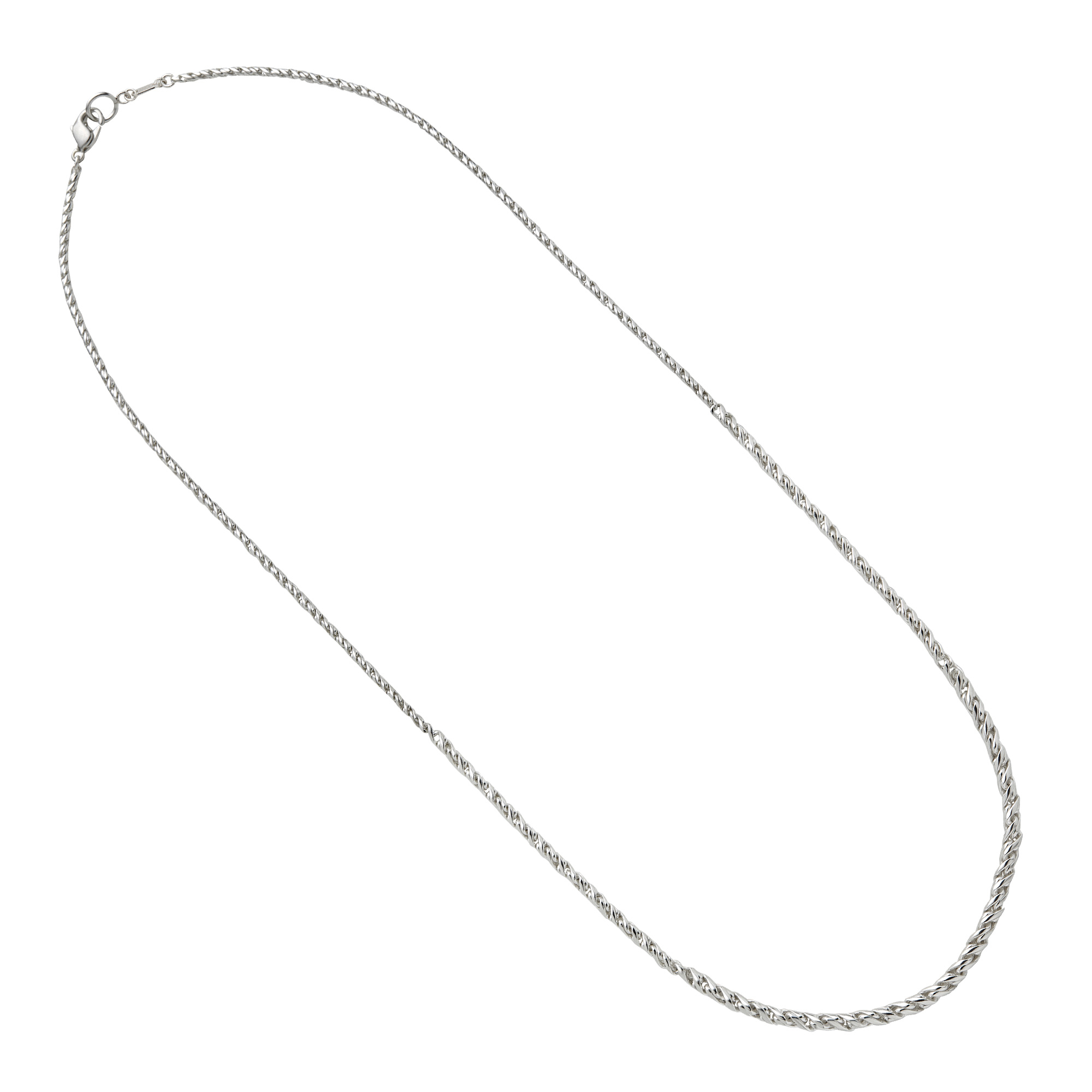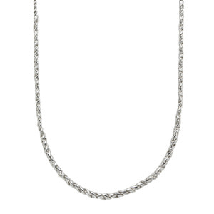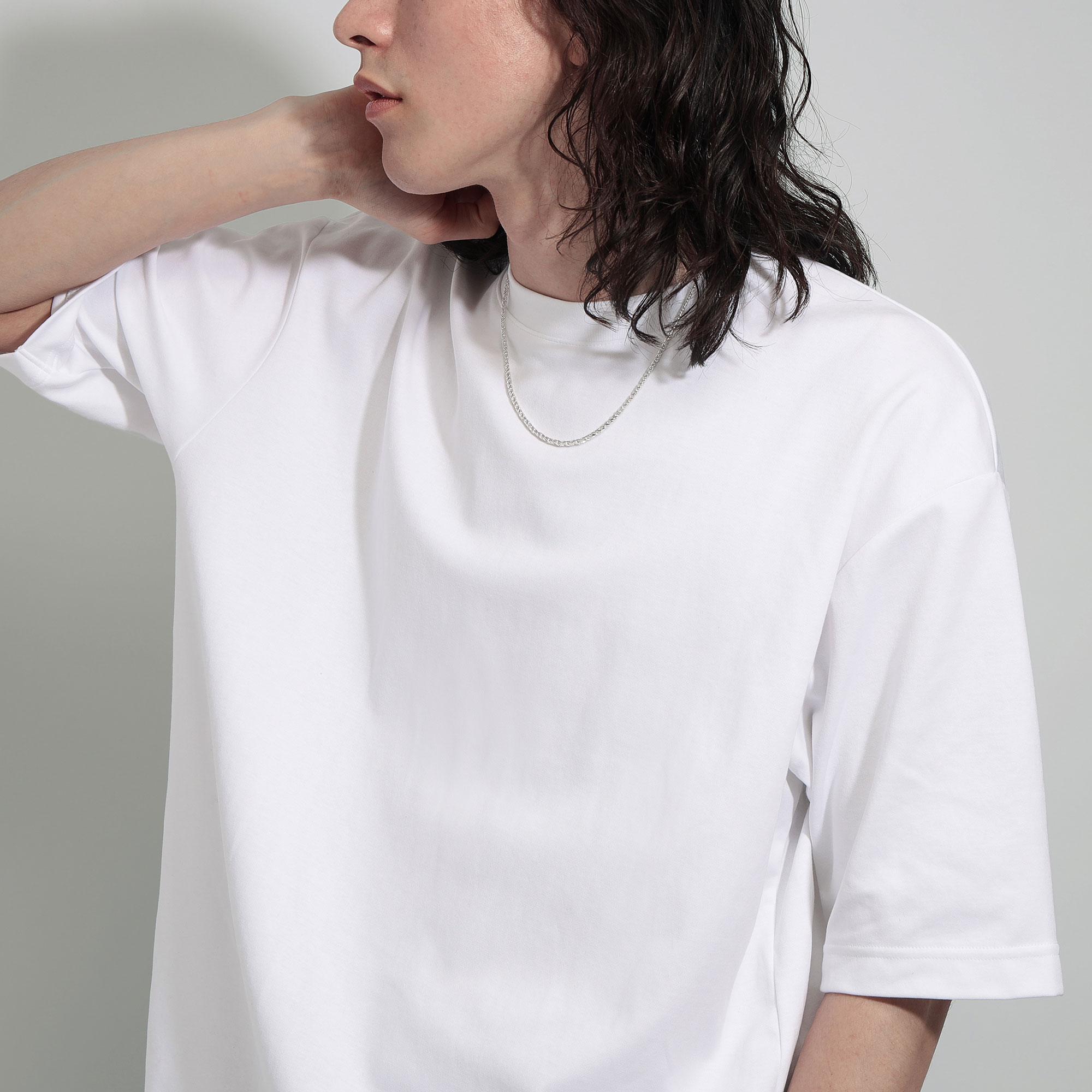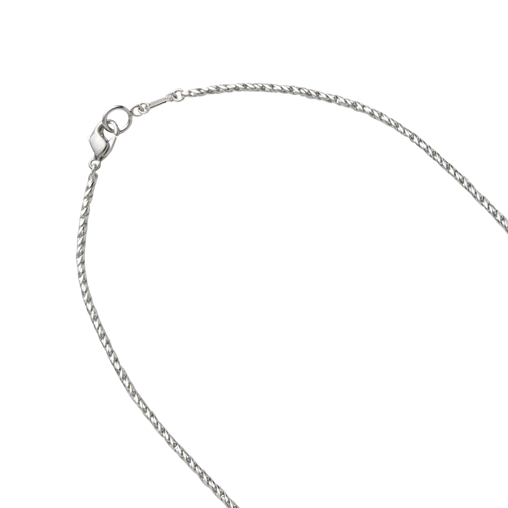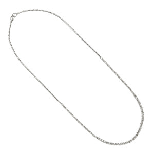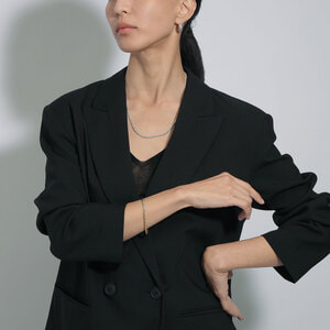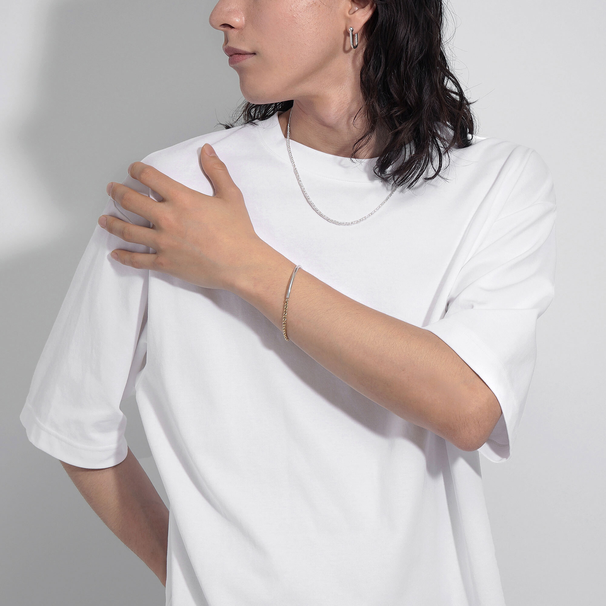 同じデザインのスクリューチェーンをサイズグラデーションに組み立てることで、トップにはボリュームがありつつ首周りがすっきりとする仕様に。