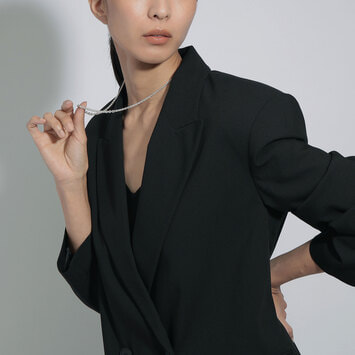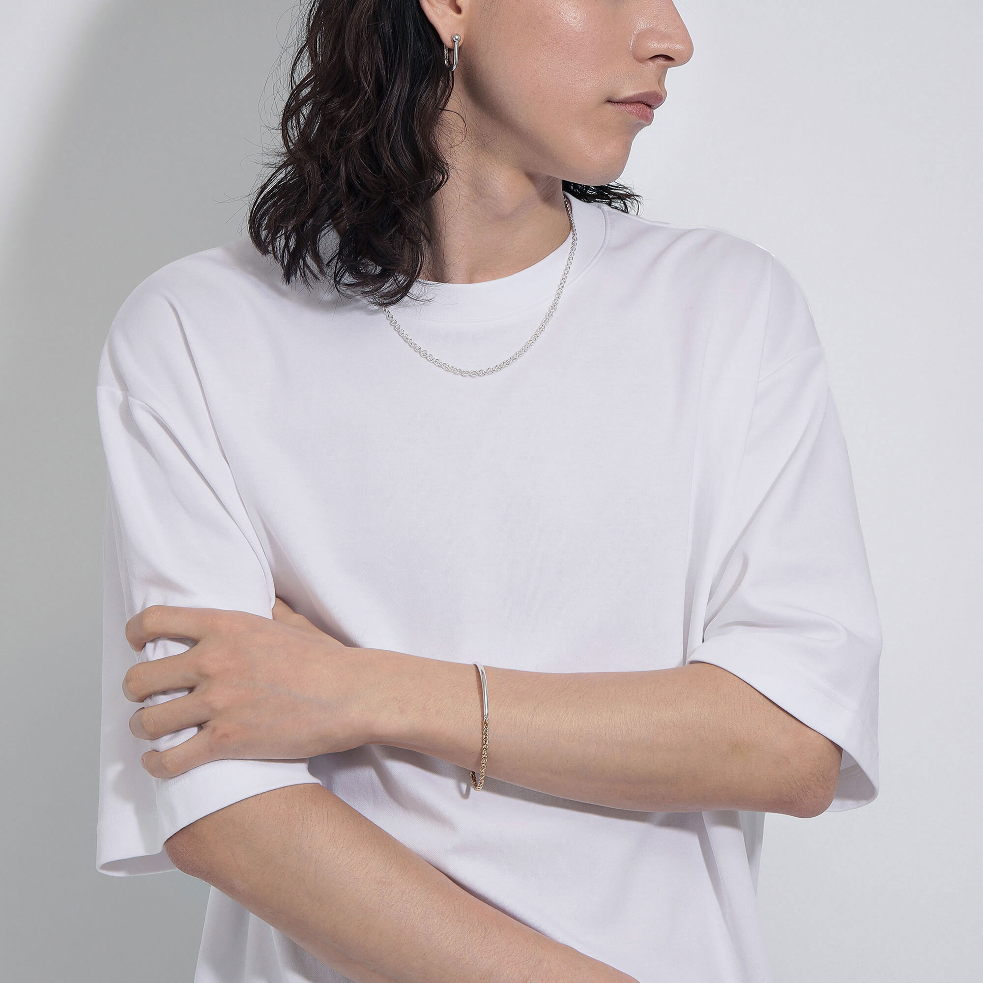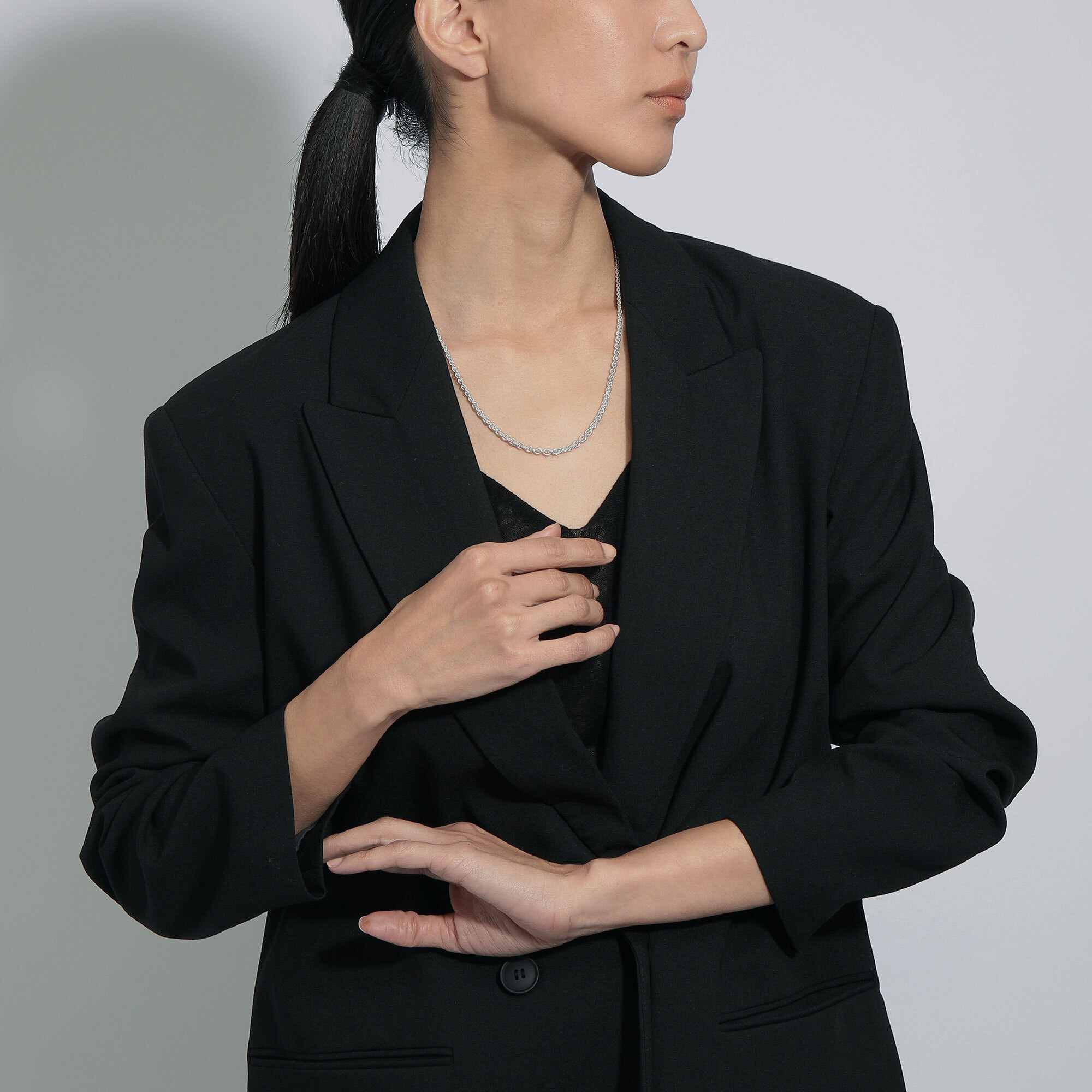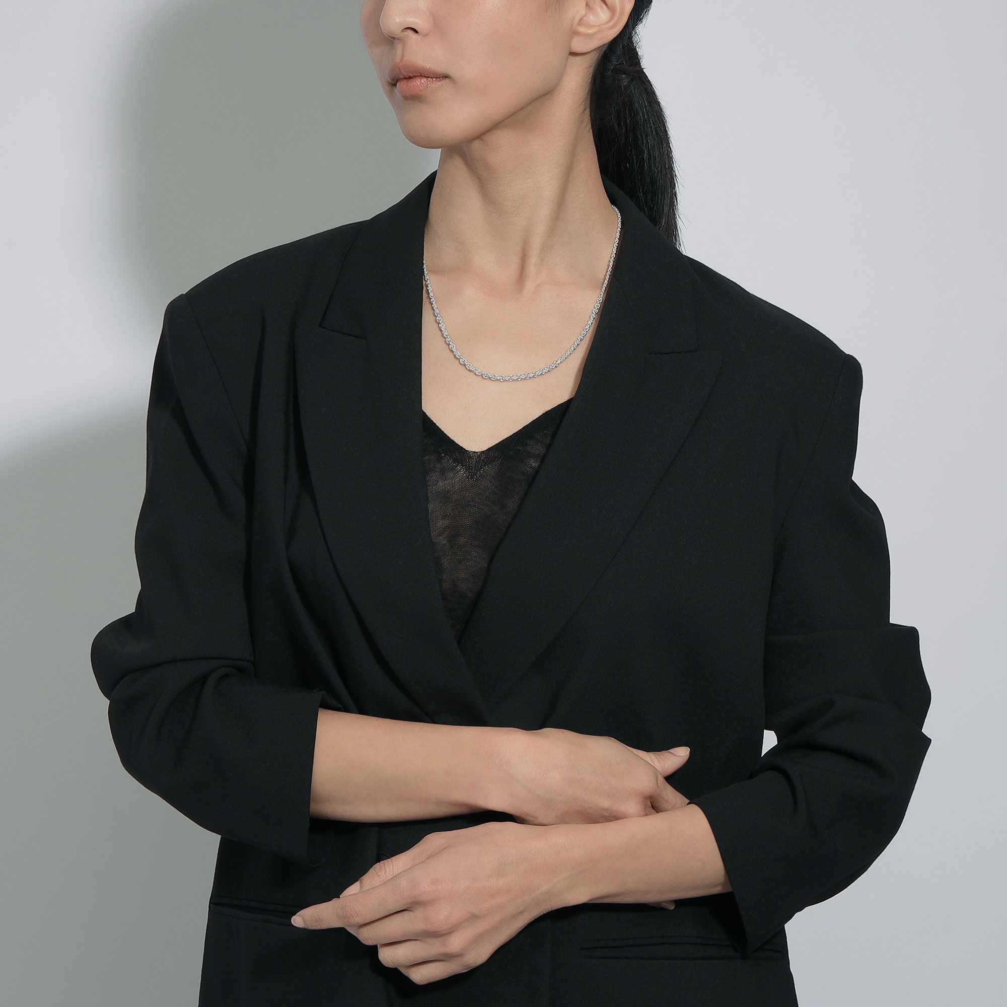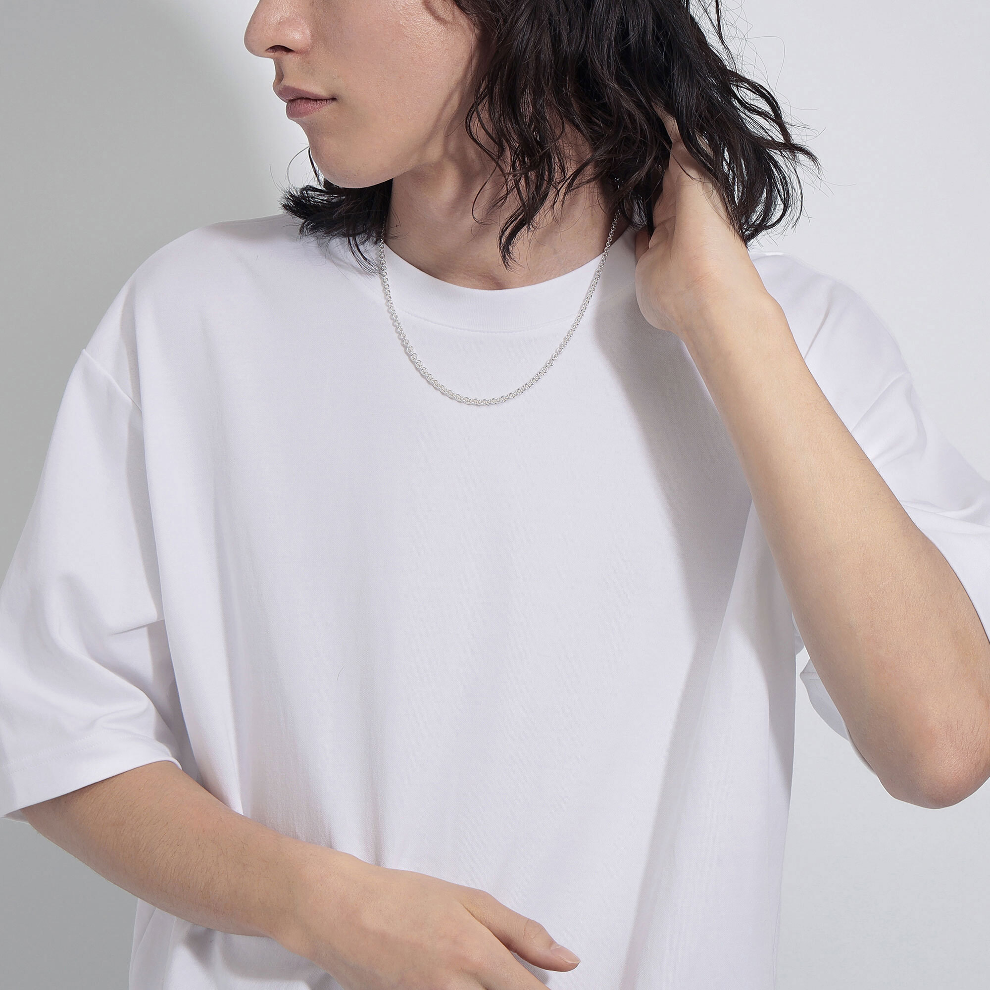 同じデザインのアズキチェーンをサイズグラデーションに組み立てることで、トップにはボリュームがありつつ首周りがすっきりとする仕様に。