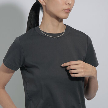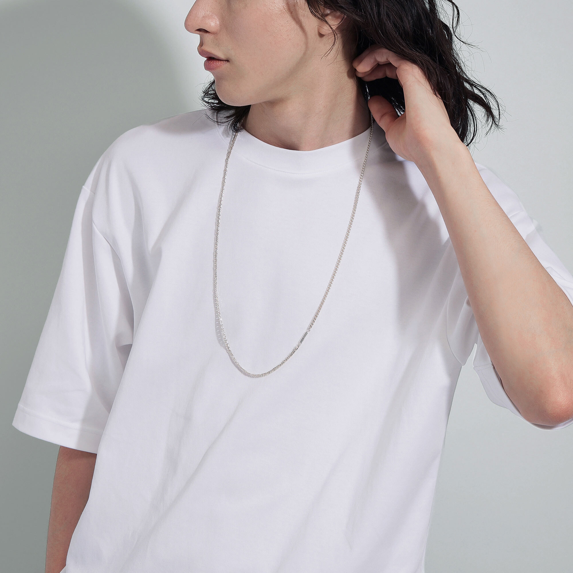 それぞれのチェーンネックレスは、重ね着けができるように長さが違う仕様に。