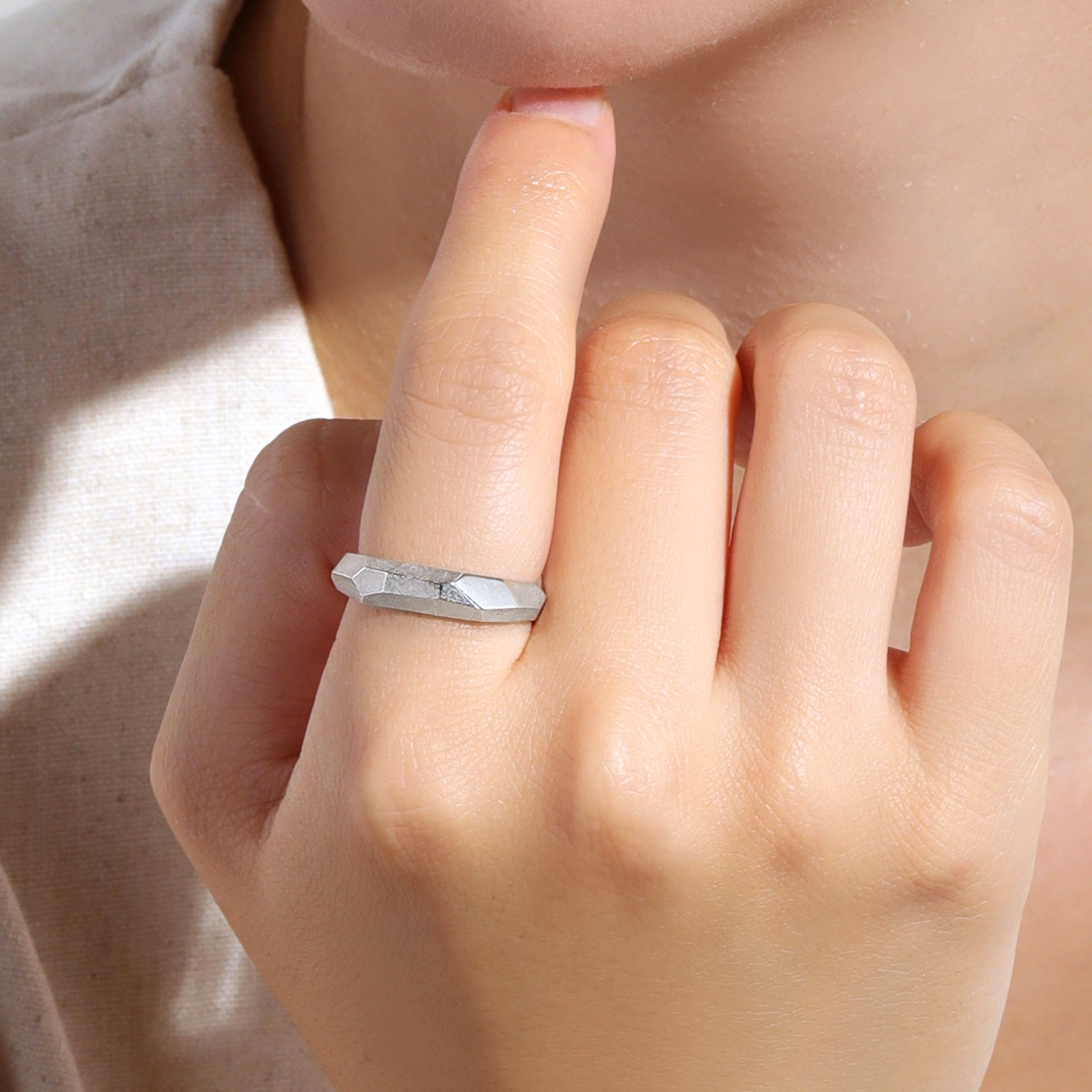 ランダムな形でカットが施されたデザインのリング。
