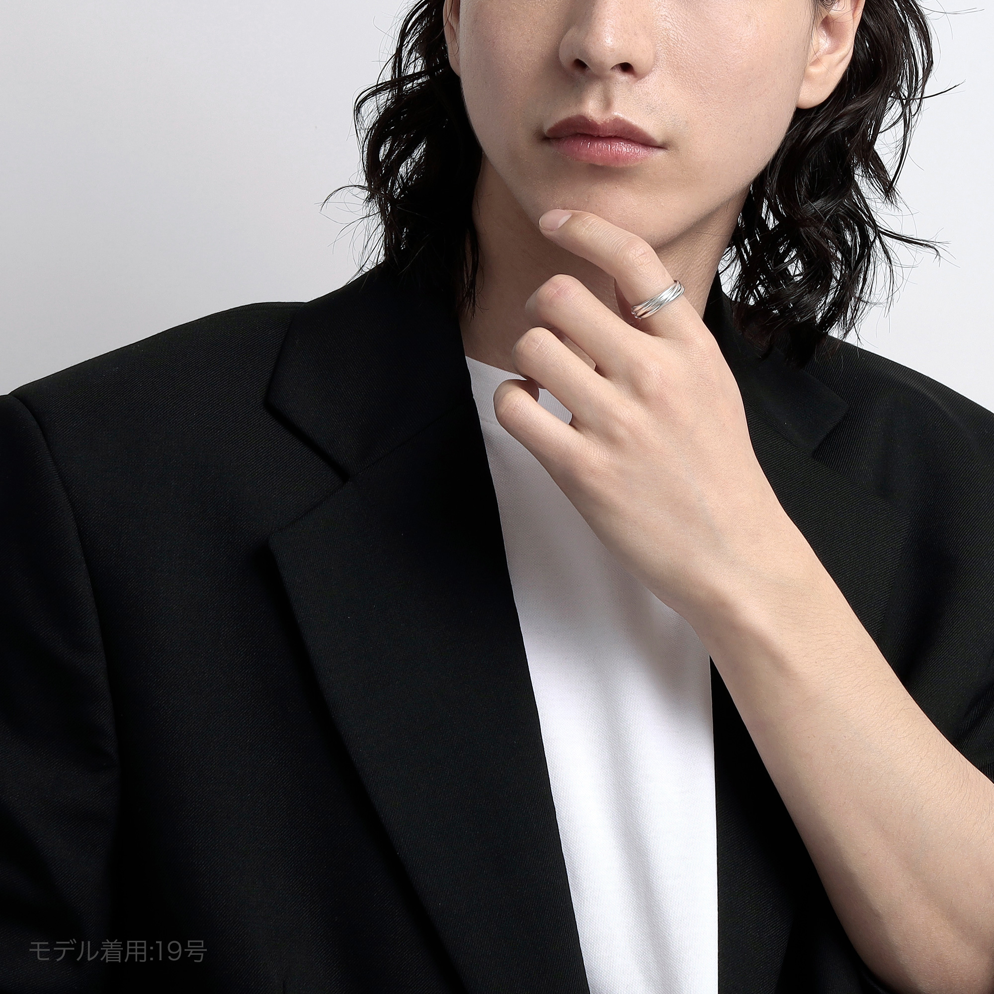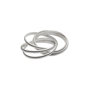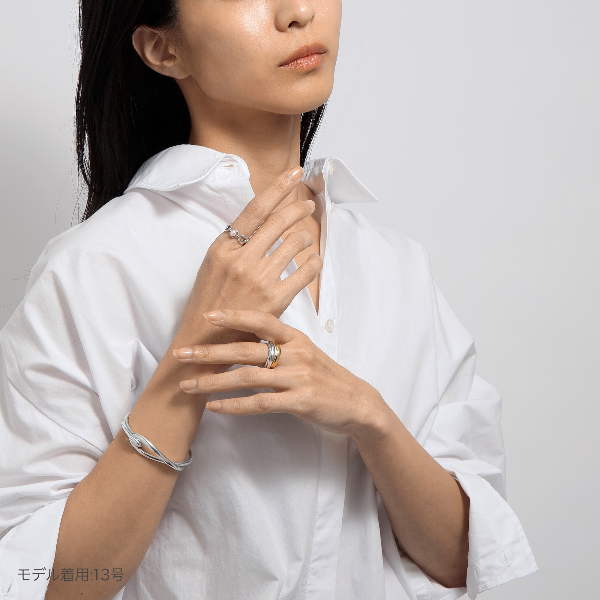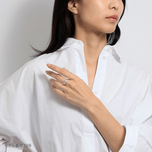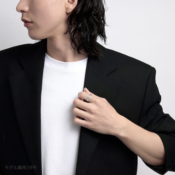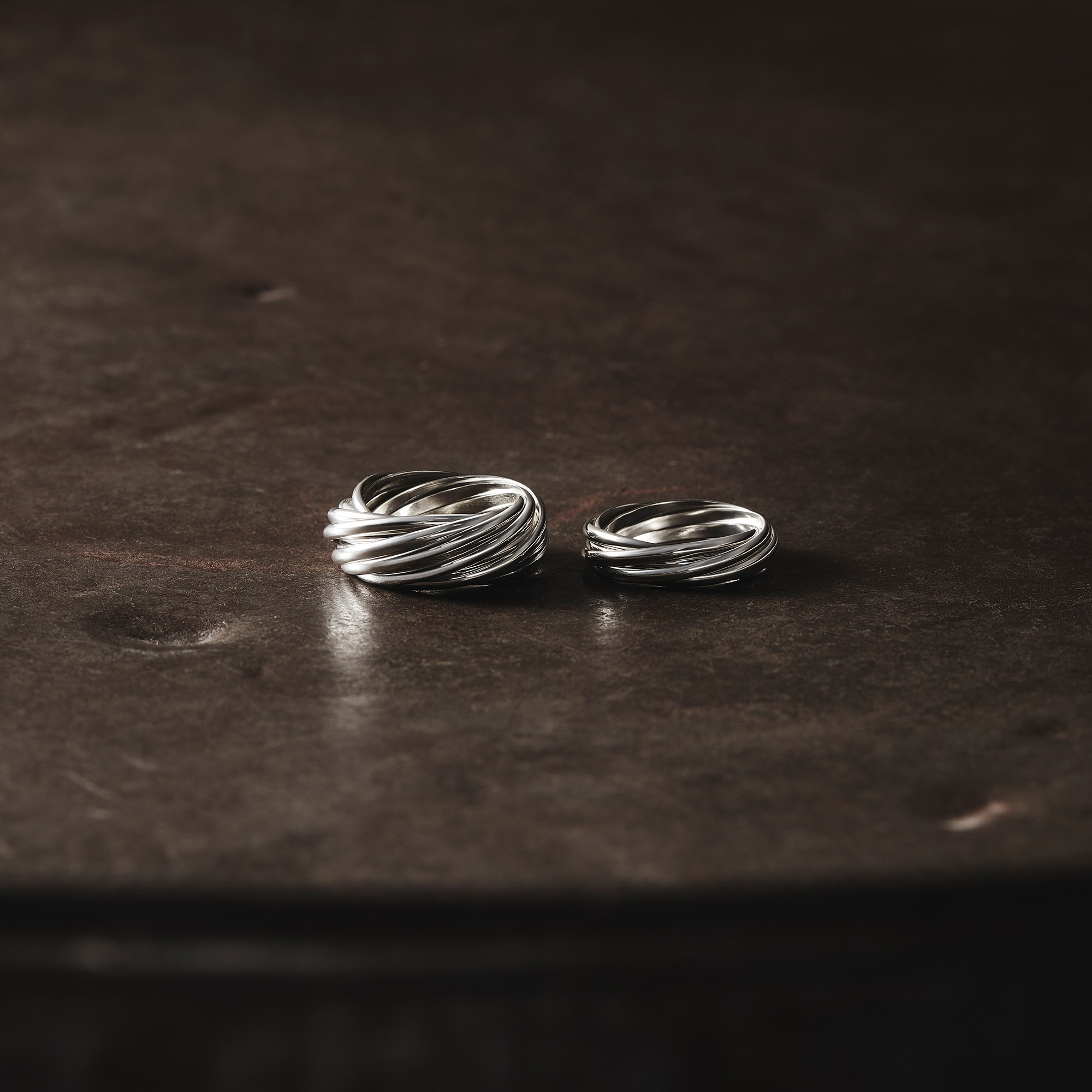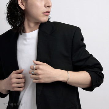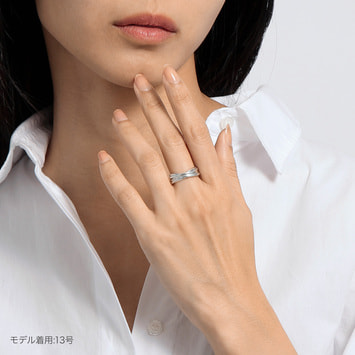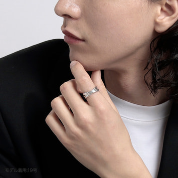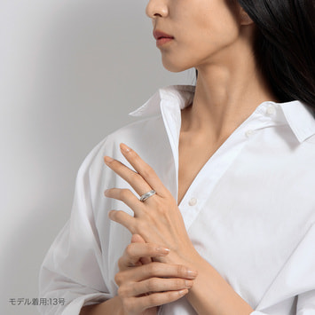 細身の甲丸線をリンクさせ重ねていく多連のリングは、規則性を持った凸凹のディティールがシンプルな中に潔い表情を生み出します。