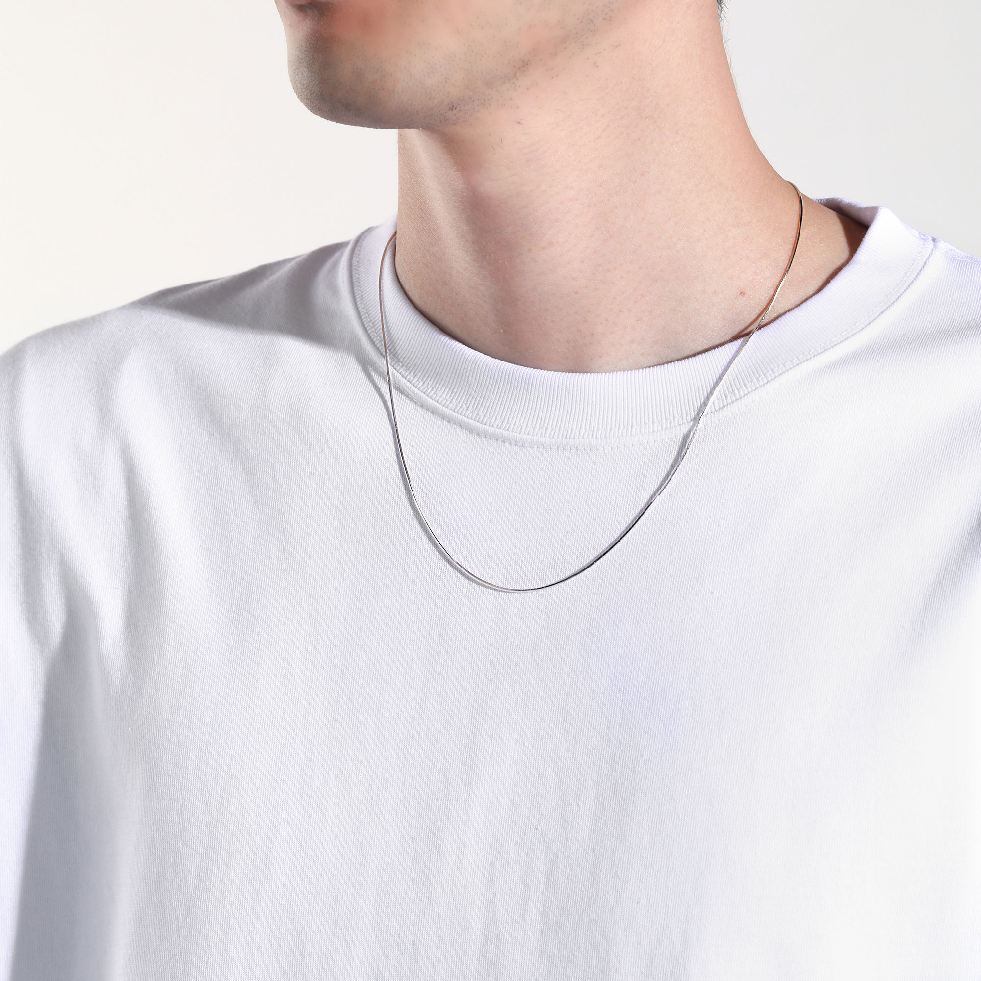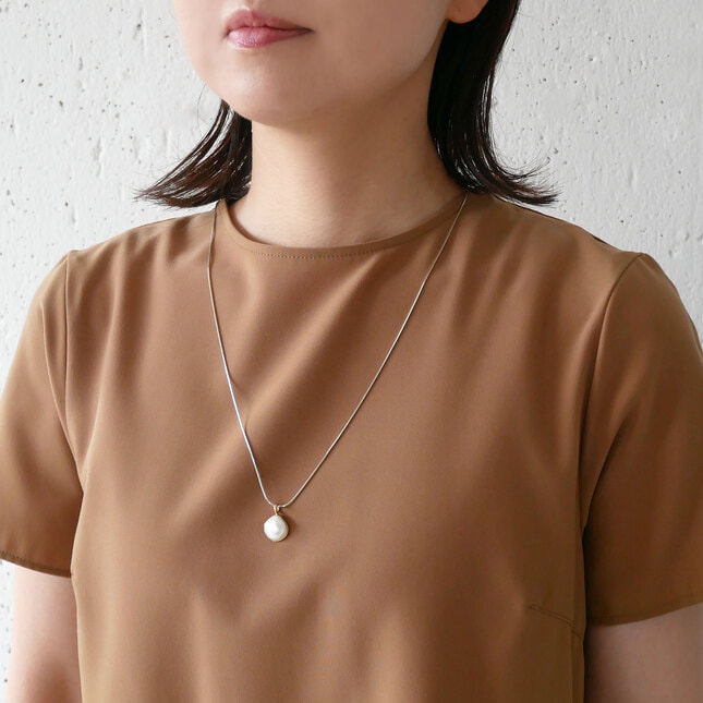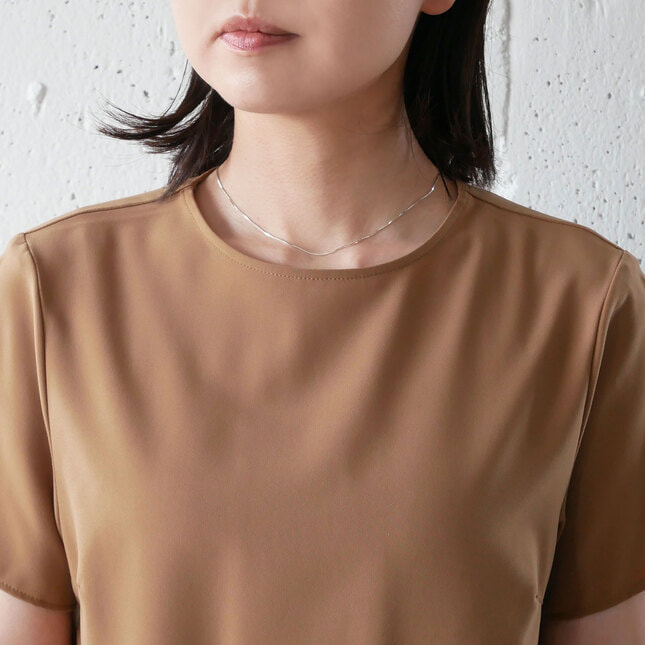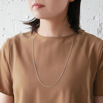 テロッとした表情が特徴的なチェーンを使用したネックレスは、NUDE SILVERの優しい輝きが存分に楽しめ、スタイリッシュな印象をプラス。