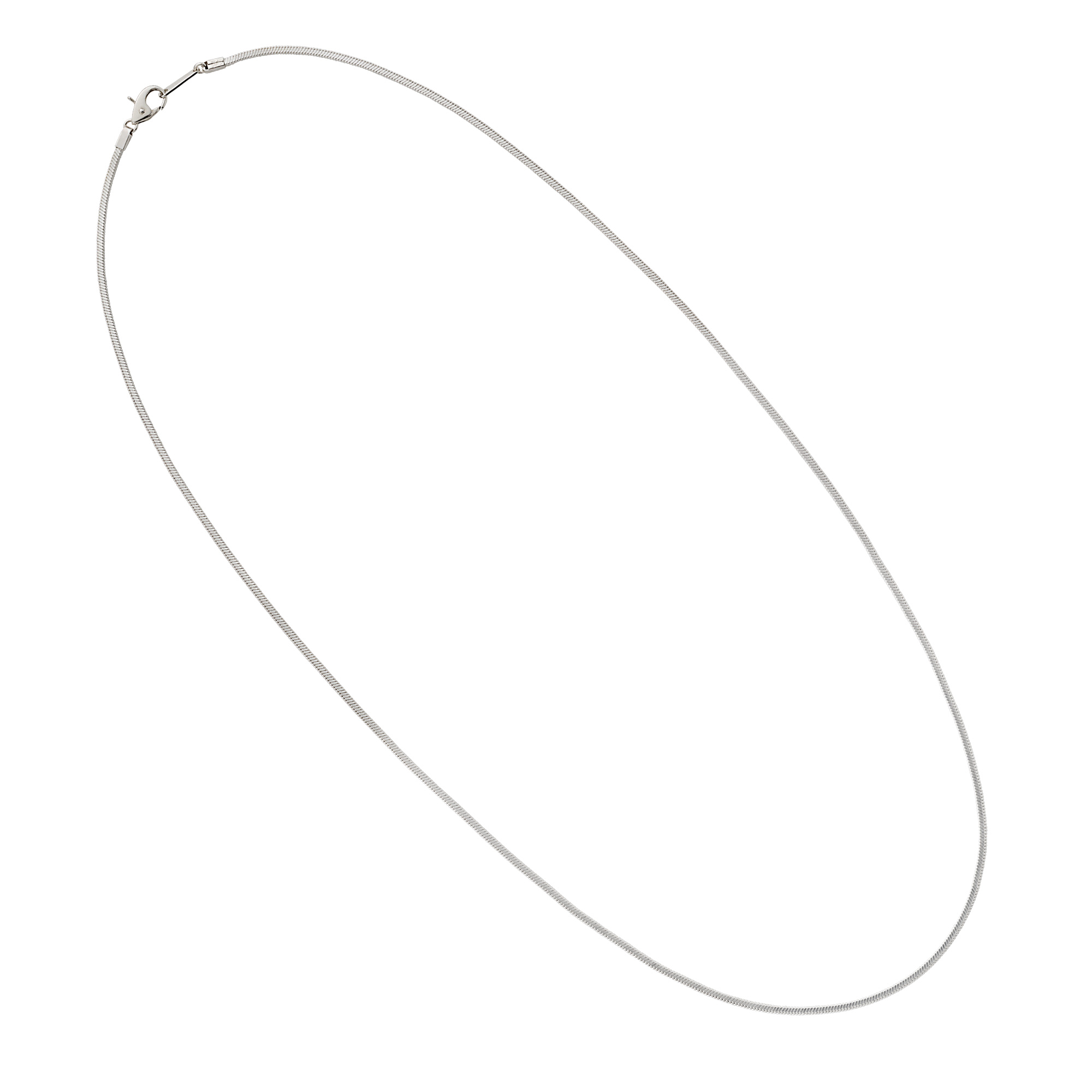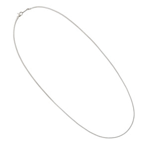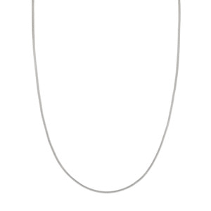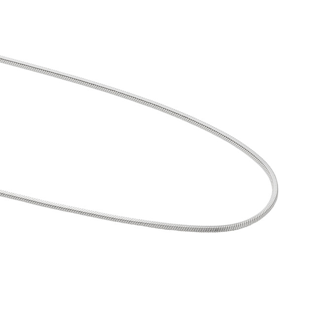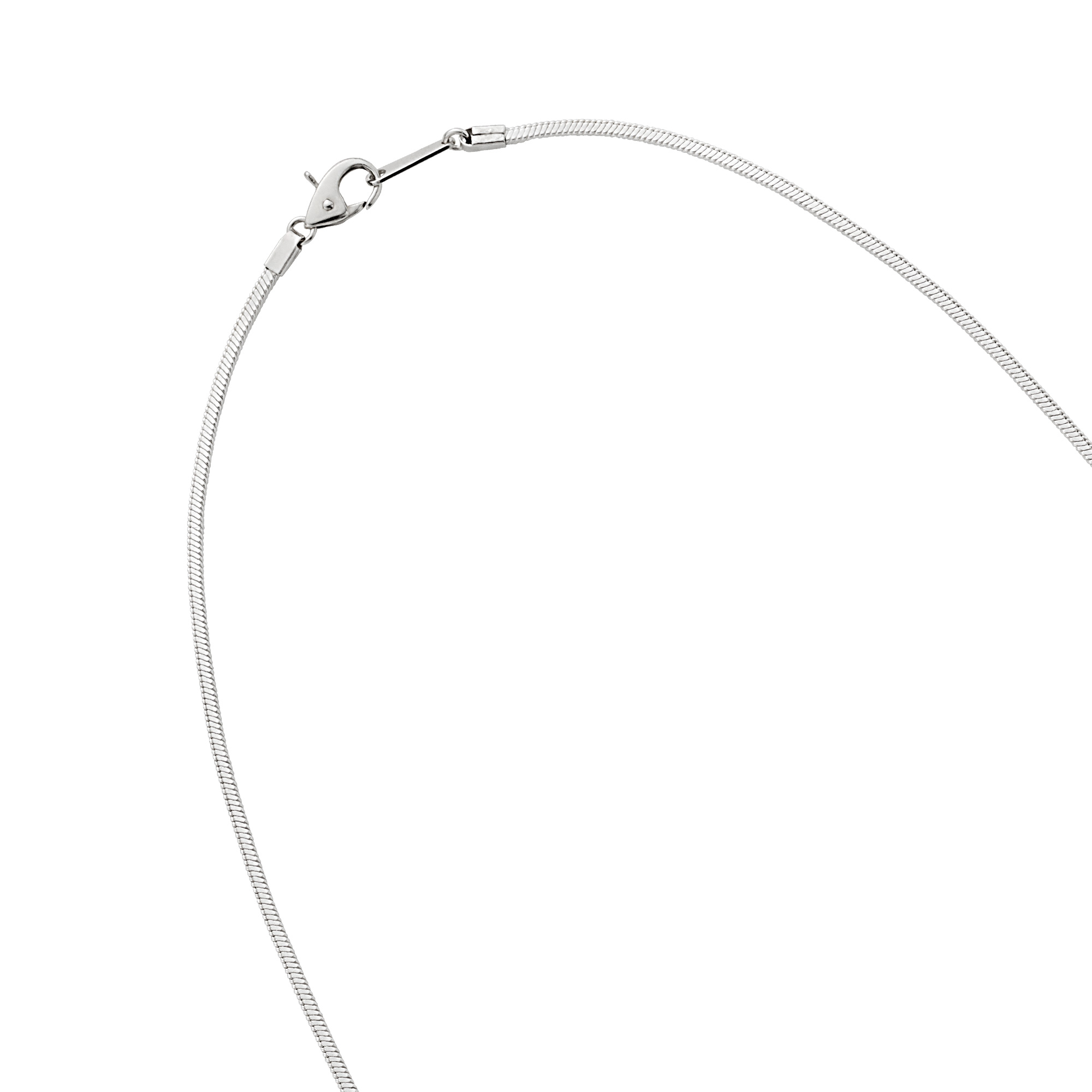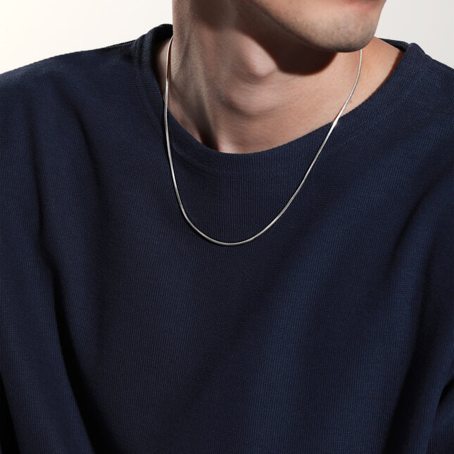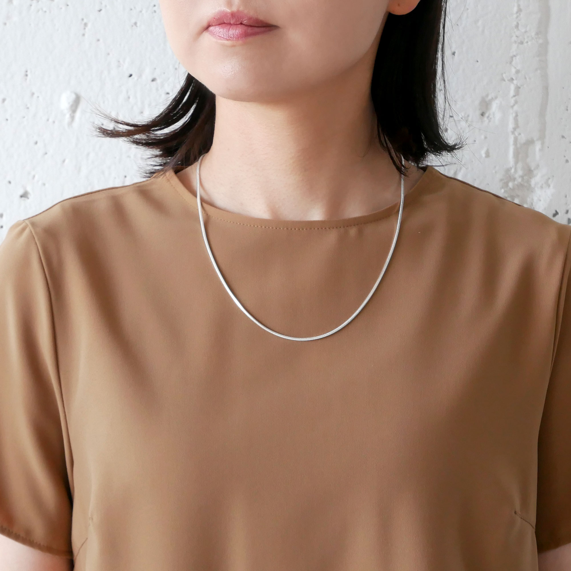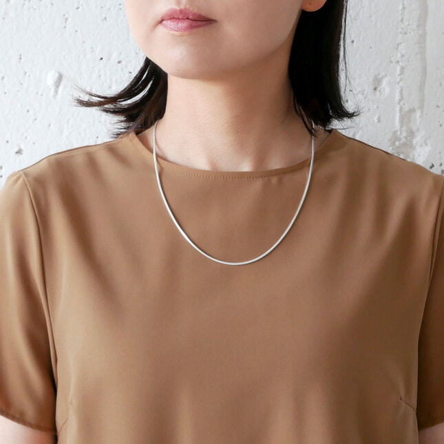 NUDE SILVERならではの滑らかな光で首まわりに線を描くスクエアスネークチェーンはコーディネートのアクセントに。