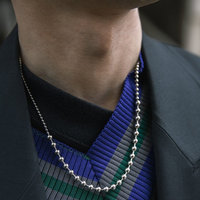 普通のボールチェーンだとストリートスタイルになりすぎ。でもこれは大きさの違う3種のボールチェーンがデザインされているので、やや繊細な印象。トラッドなジャケットスタイルにもマッチします。少し回して見える部分を変えると表情が変わるのもいいですね。
