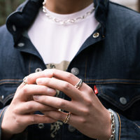デニムスタイルはジュエリーとの相性が良いと思い、中にグラフィックTシャツでポイントを入れコーディネートしてみました。簡単に袖口も折れるタイプなので、ブレスレットやリングも美しく見せることができる点もポイントです。