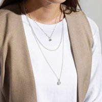 羽織るだけで秋らしいコーディネートにアップデートしてくれるジレに、ネックレスの重ねづけでリラックス感あるスタイルに。長さの異なるチェーンをレイヤードすることで、縦のラインが強調されすっきりと見えます。