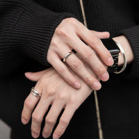 カジュアルな印象のスマートウォッチにシルバージュエリーが品よく、スタイリッシュにみせてくれます。