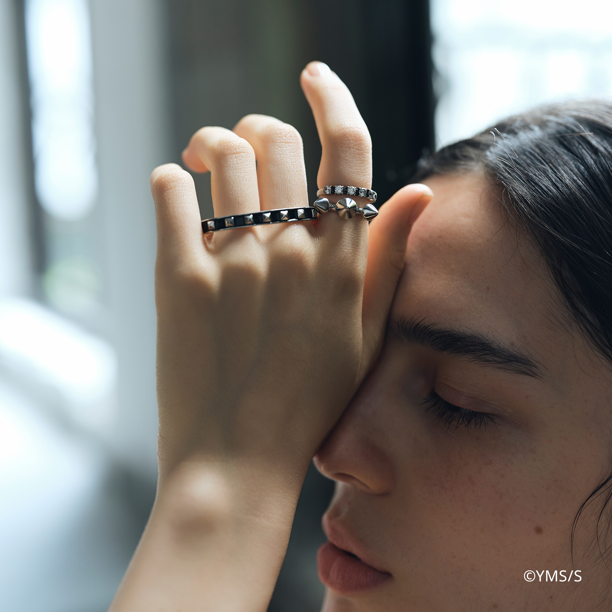 スタッズがあしらわれたレザーベルトをモチーフにした