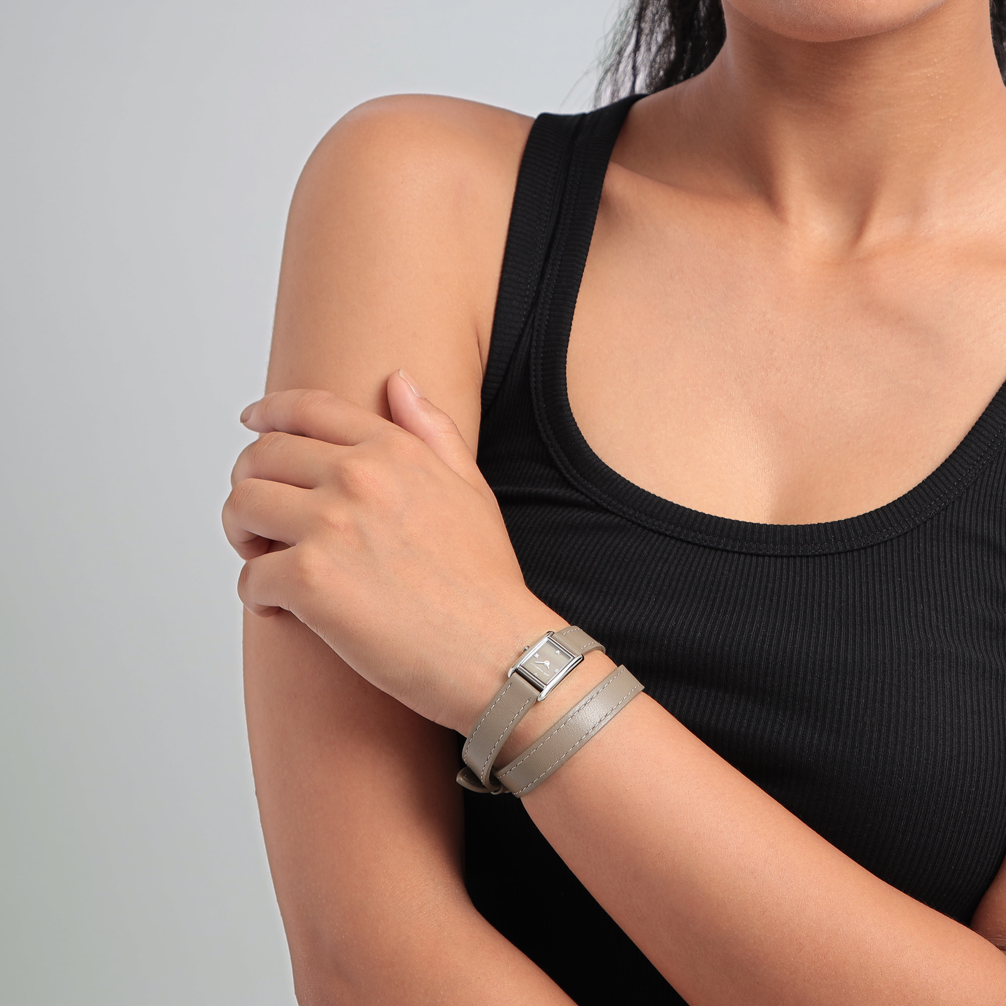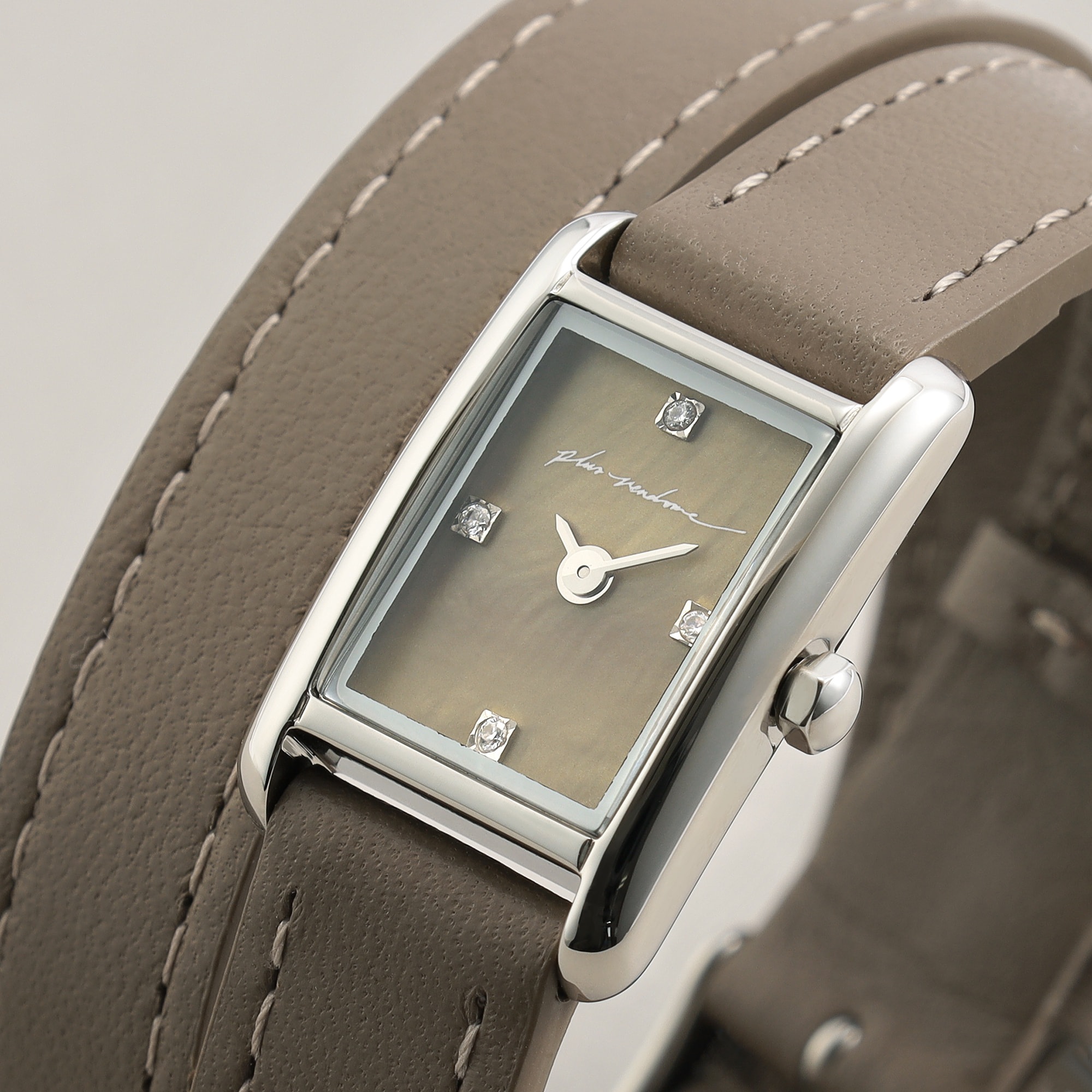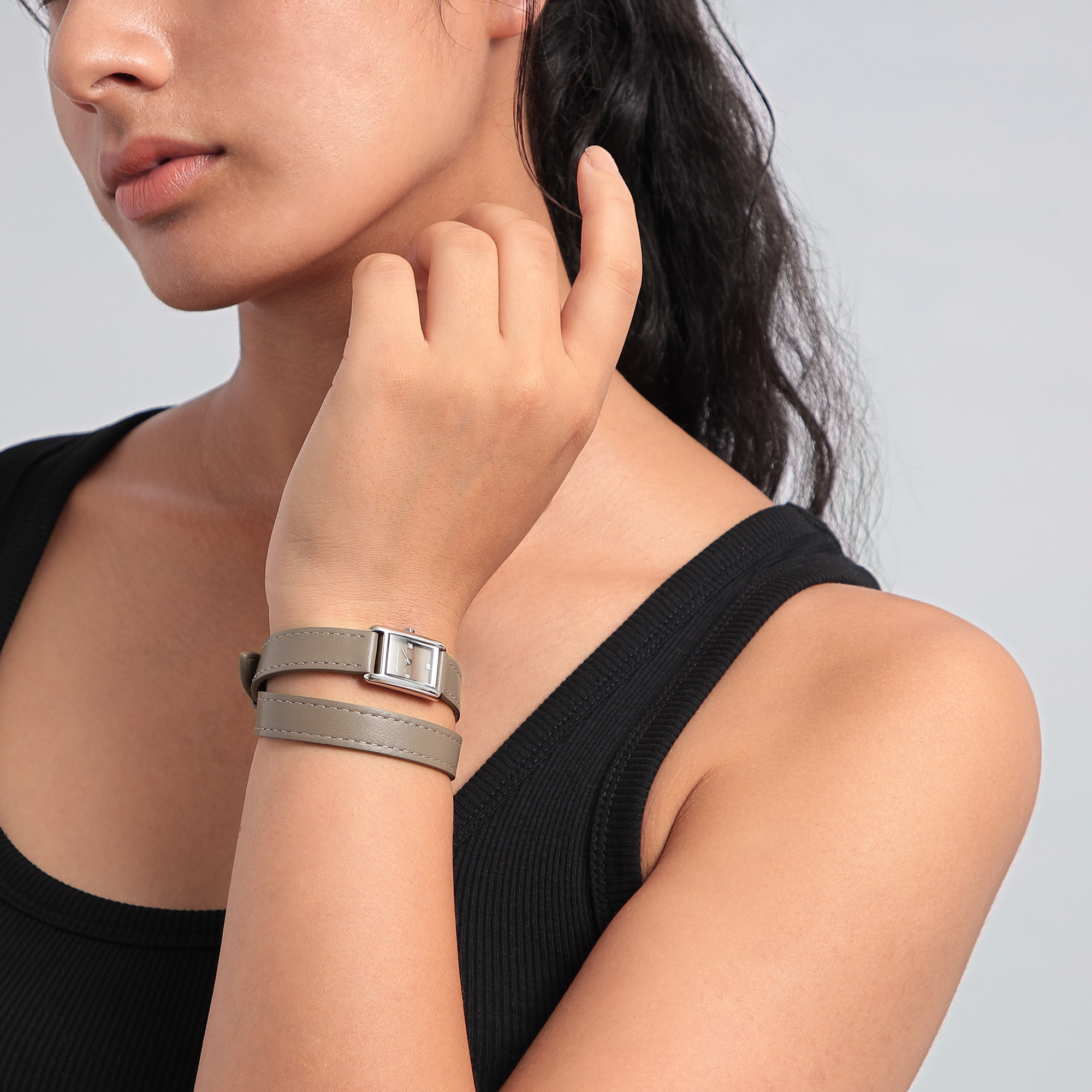 グレージュのイタリア製本牛革のダブルストラップを取り付け