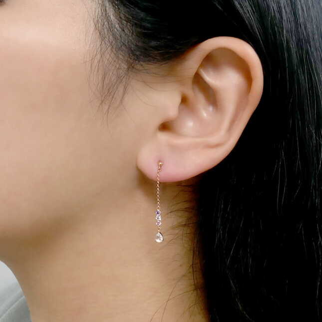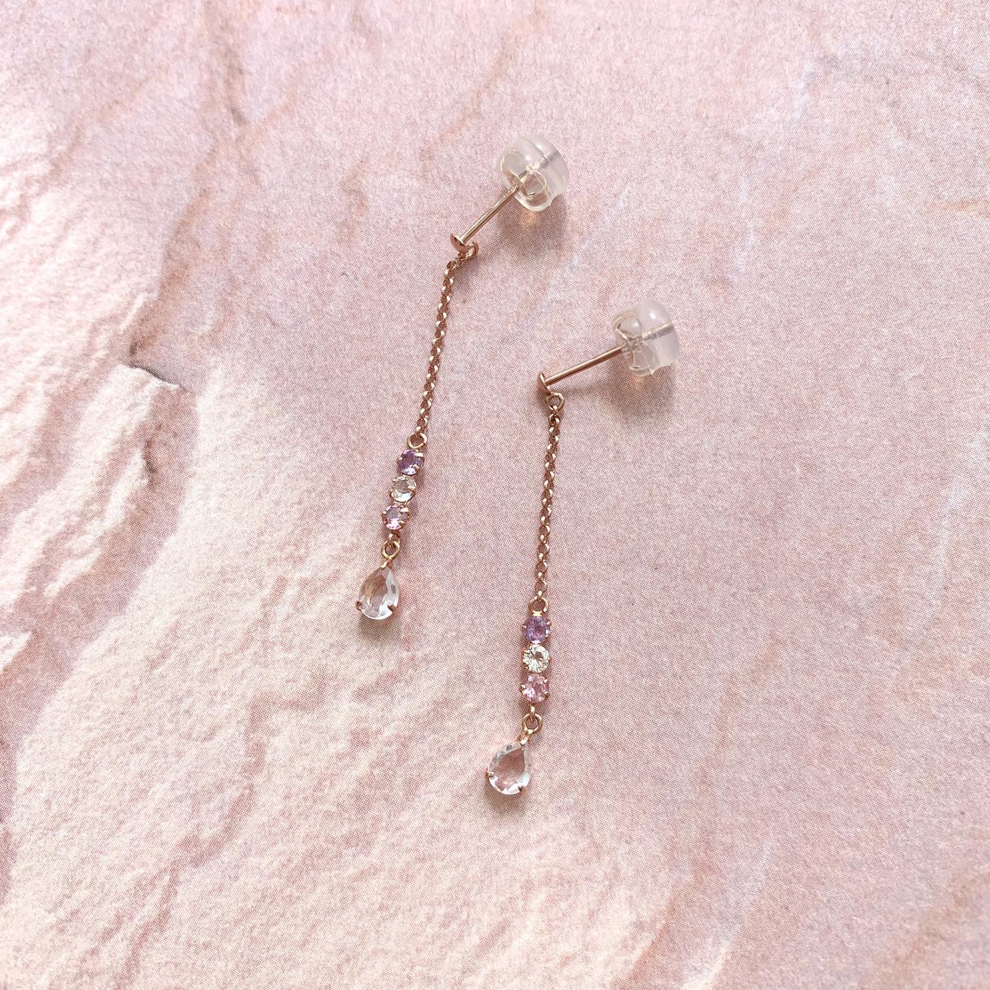 淡いピンクカラーのグラデーションが美しいピアス。 チェーンの先にライトアメシスト、ホワイトトパーズ、ピンクトルマリンとペアシェイプカットのローズクォーツが揺れるフェミニンなデザイン。 動きに合わせてしなやかに揺れる程よい長さと、女性らしいロマンティックな色合いが、横顔に優しいニュアンスを与えます。 ▼シリーズアイテムはこちらイヤリング▼ローズクォーツのアイテムはこちら▼2月の誕生石アメシストのアイテムはこちら▼10月の誕生石ピンクトルマリンのアイテムはこちら▼11月の誕生石 トパーズのアイテムはこちら