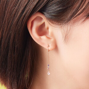 淡いピンクカラーのグラデーションが美しいイヤリング。 チェーンの先にライトアメシスト、ホワイトトパーズ、ピンクトルマリンとペアシェイプカットのローズクォーツが揺れるフェミニンなデザイン。 動きに合わせてしなやかに揺れる程よい長さと、女性らしいロマンティックな色合いが、横顔に優しいニュアンスを与えます。 耳たぶを挟み込むタイプのイヤークリップは華奢なパーツでピアスのように見えるのもポイントです。 ▼シリーズアイテムはこちらピアス▼ローズクォーツのアイテムはこちら▼2月の誕生石アメシストのアイテムはこちら▼10月の誕生石ピンクトルマリンのアイテムはこちら▼11月の誕生石 トパーズのアイテムはこちら