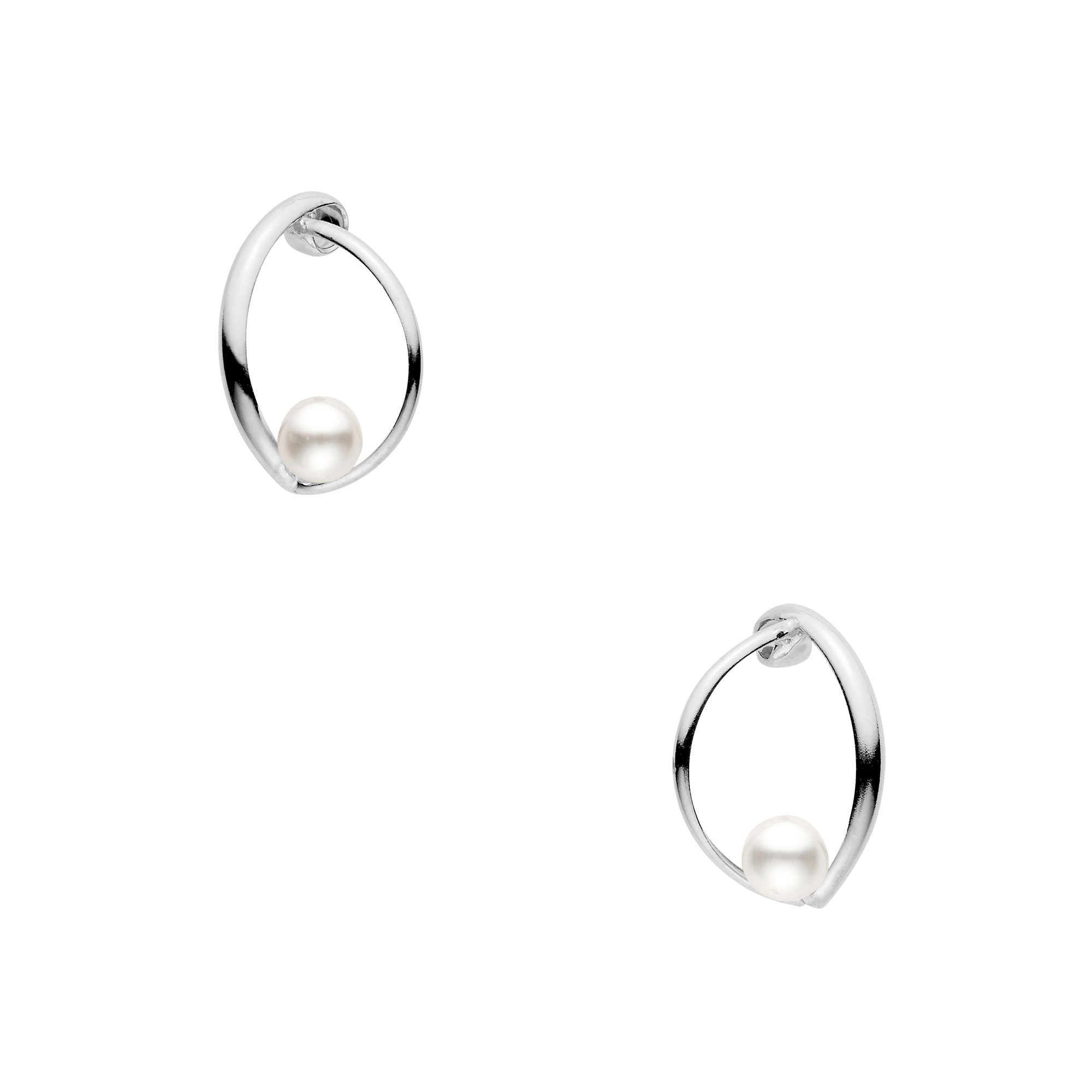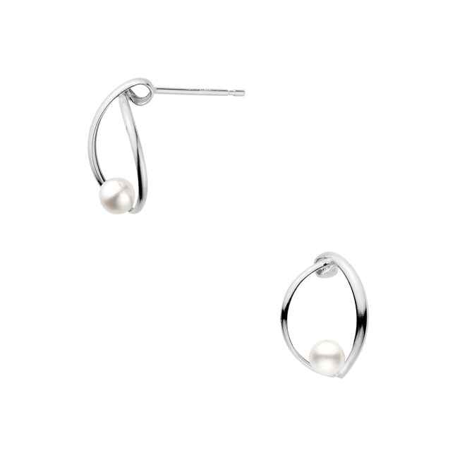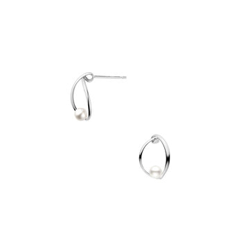 リーフをかたどったようなホワイトゴールドの地金のラインに淡水パールをあしらったデザインのスタッズピアス。