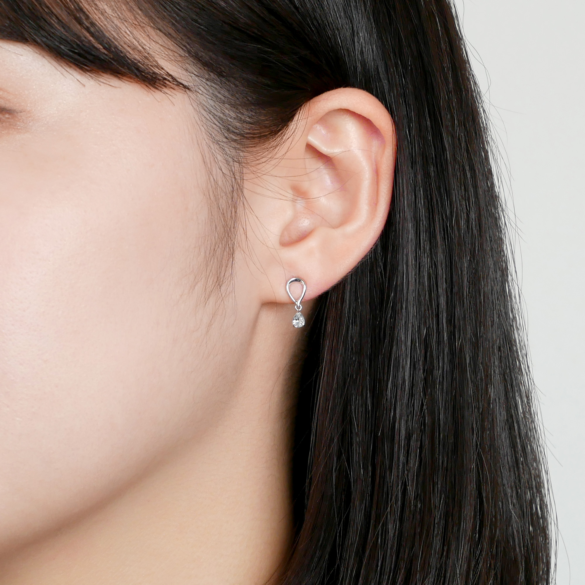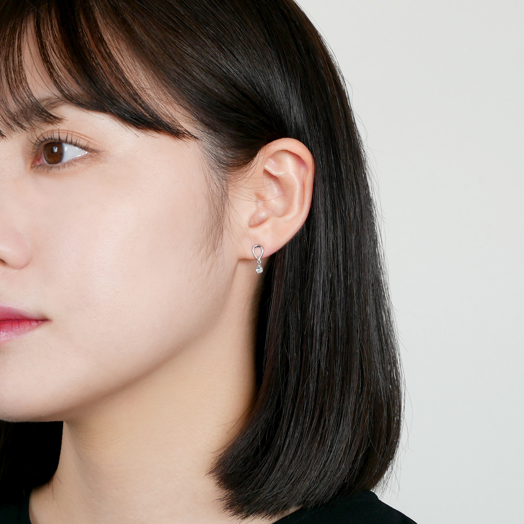 抜け感のあるトップからペアシェイプ型の石が下がり、動くたびに揺れて輝くので顔まわりがパッと明るくなります。
