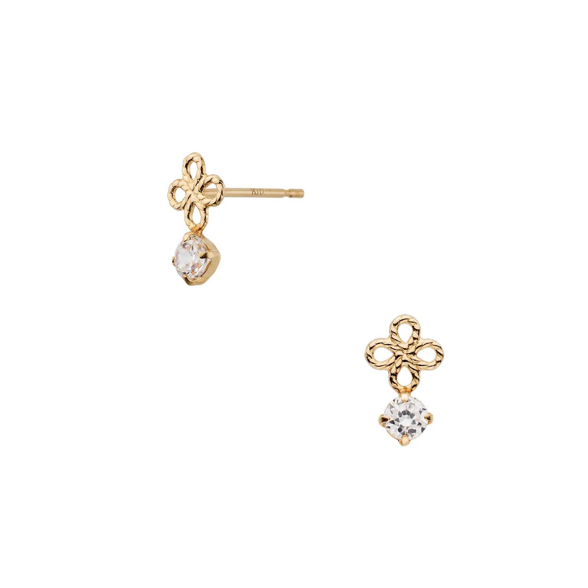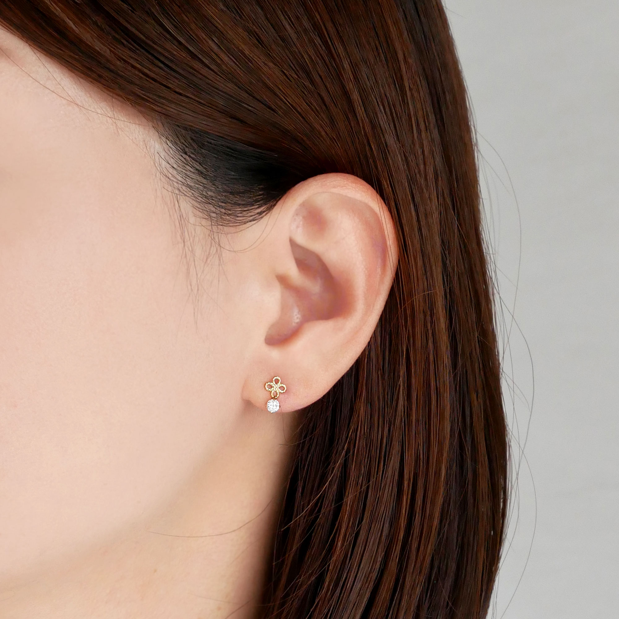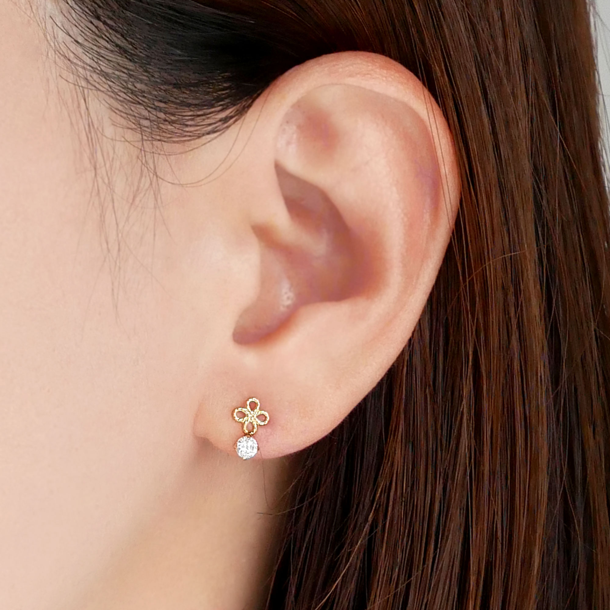 リボンのような細いラインで形取られたフラワーに、ころんと寄り添うキュービックジルコニアがきらりと光り、横顔に華やぎをプラスします。
