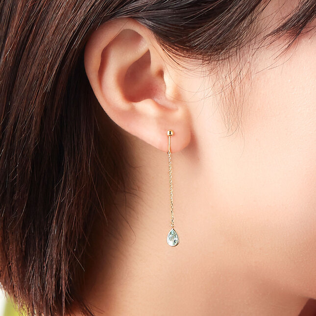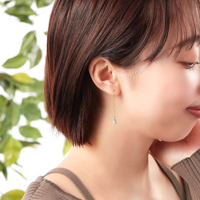 しずく型にカットされたブルートパーズは、イエローゴールドのラインに縁取られ端正な印象に。