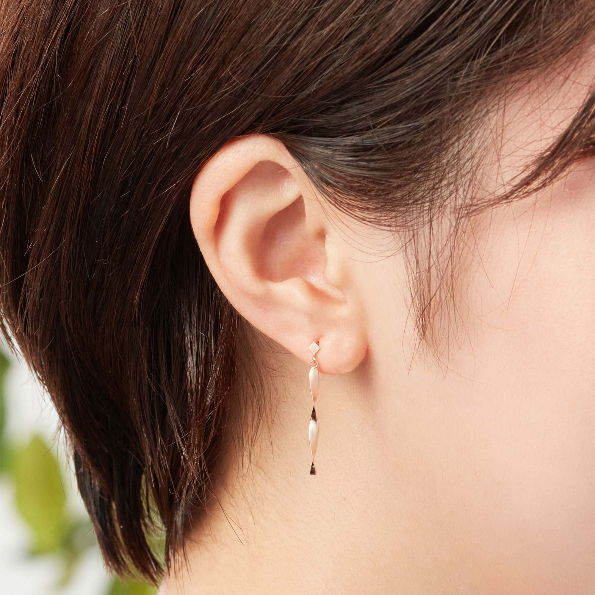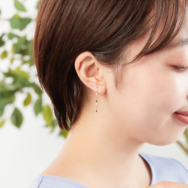動くたびにピンクゴールドの地金が揺れ、華やかな輝きを感じられるピアス。