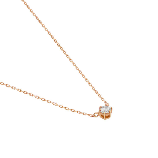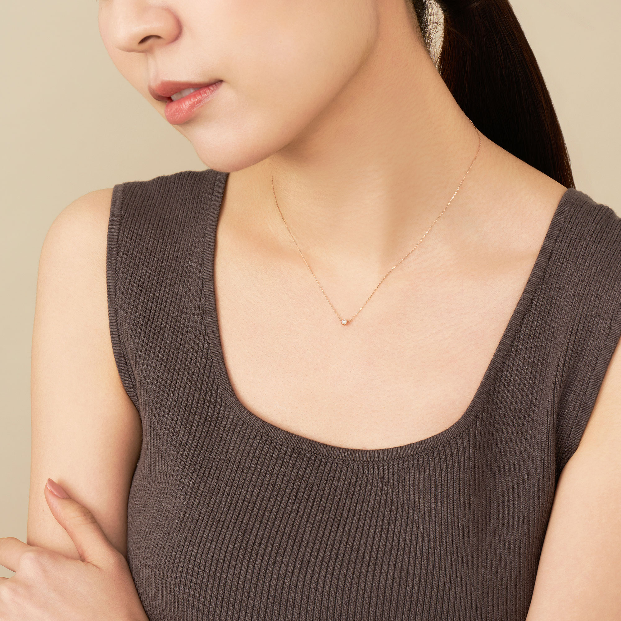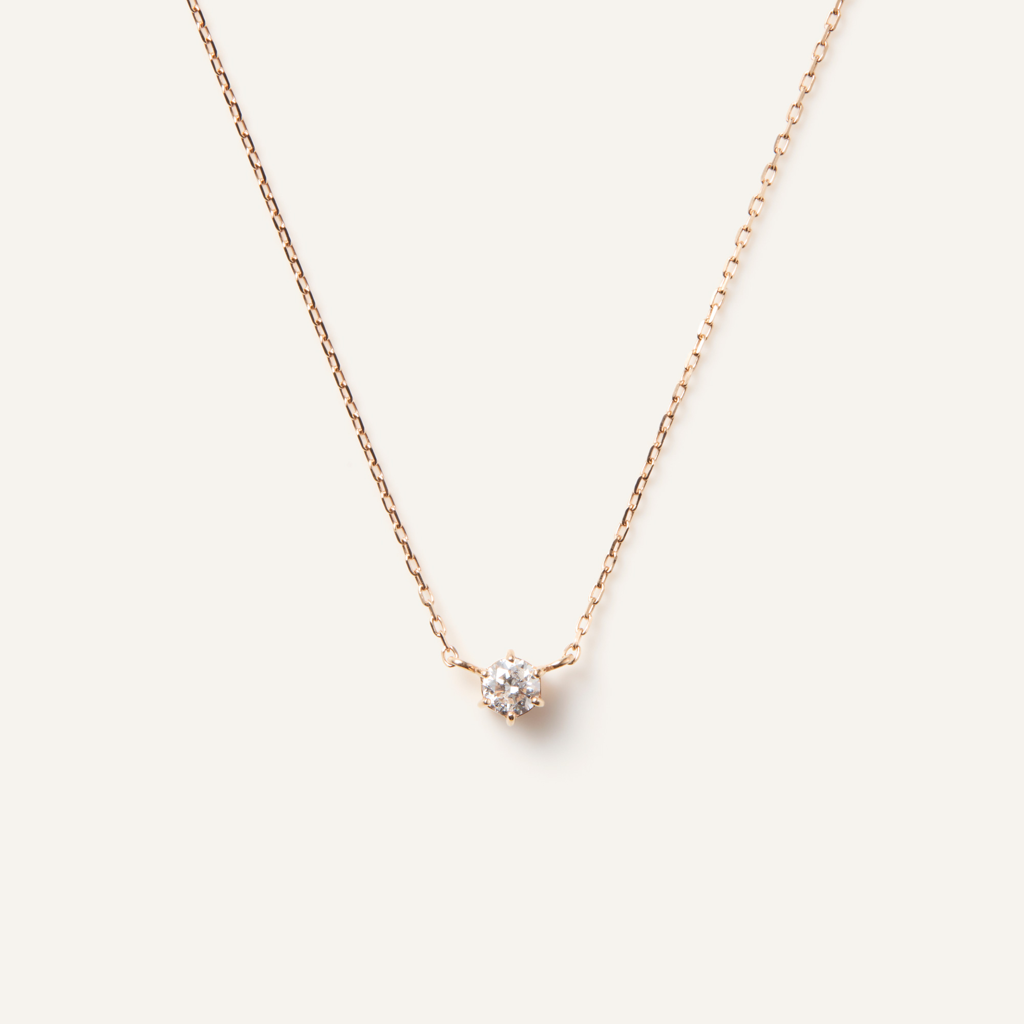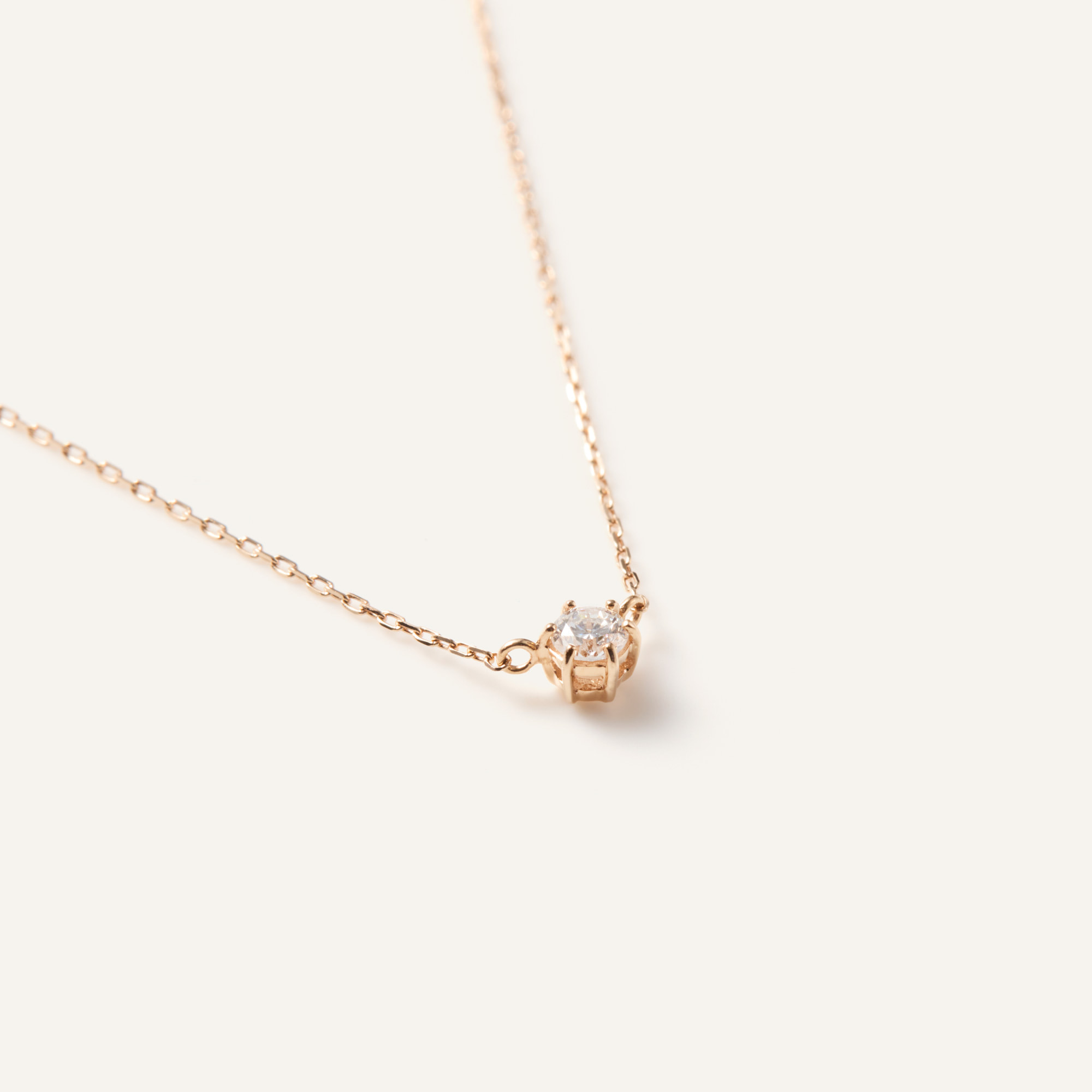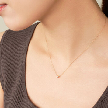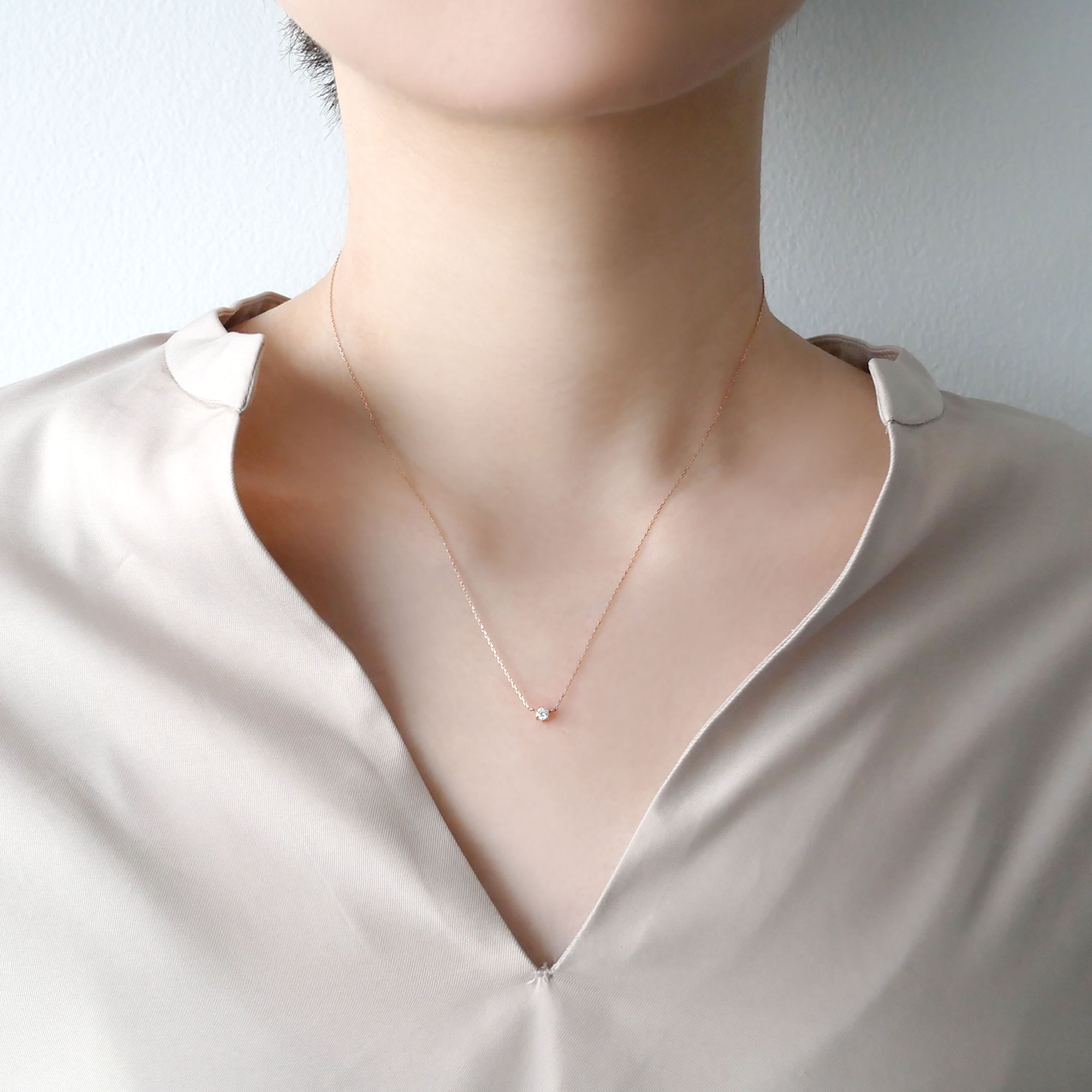 定番のシンプルなデザインで、ダイヤモンドの輝きを引き立てる繊細なセッティング。ピンクゴールドの柔らかな輝きは女性らしい印象をプラスして、胸元をエレガントに見せてくれます。