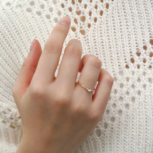 V字の谷間にダイヤモンドをセッティングすることで華奢なデザインながらしっかりとダイヤモンドの存在感を感じる事ができます。