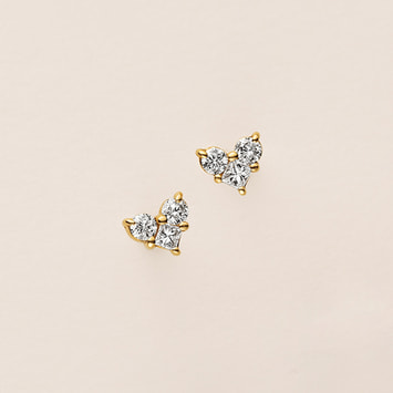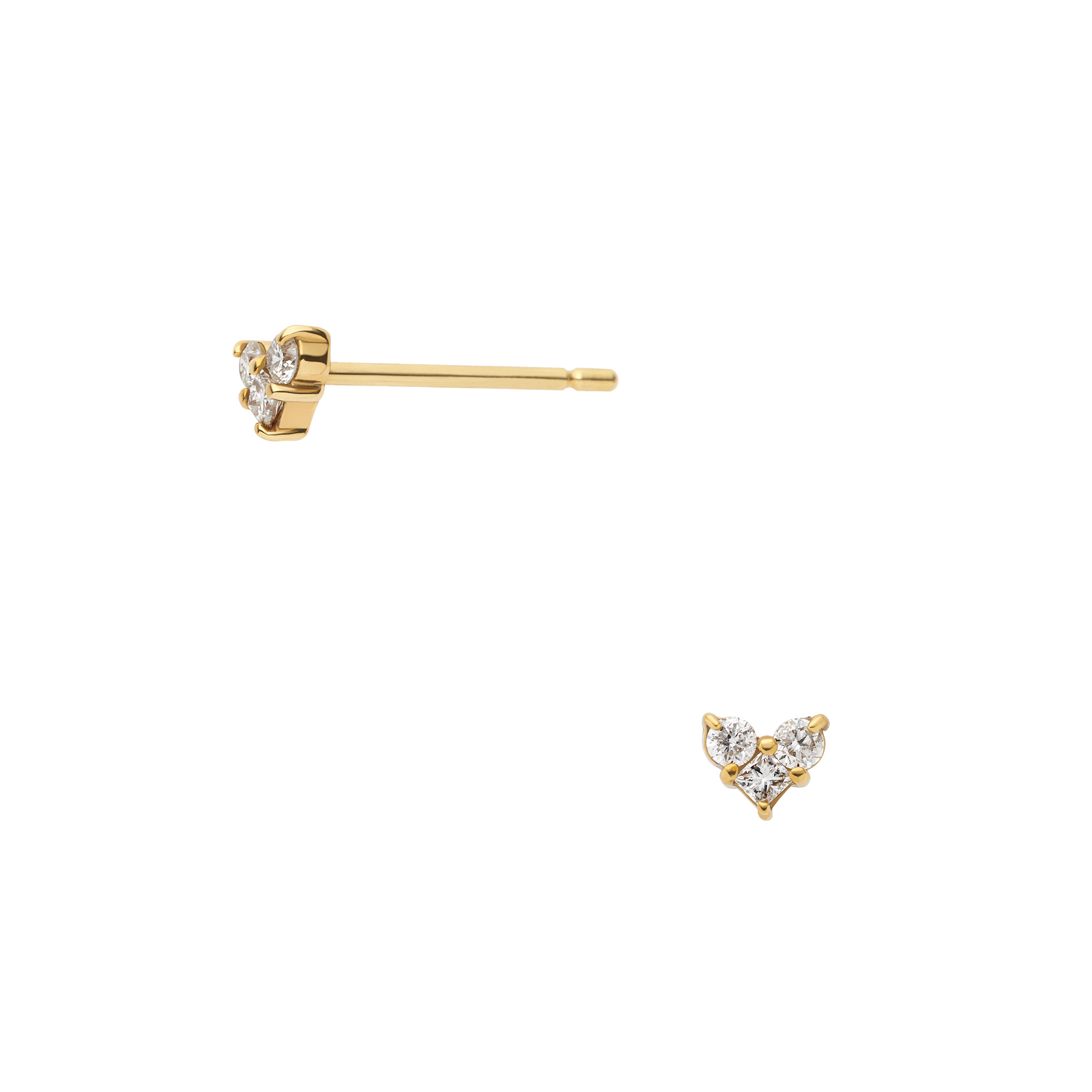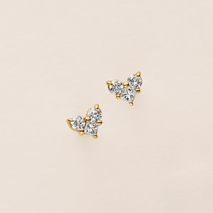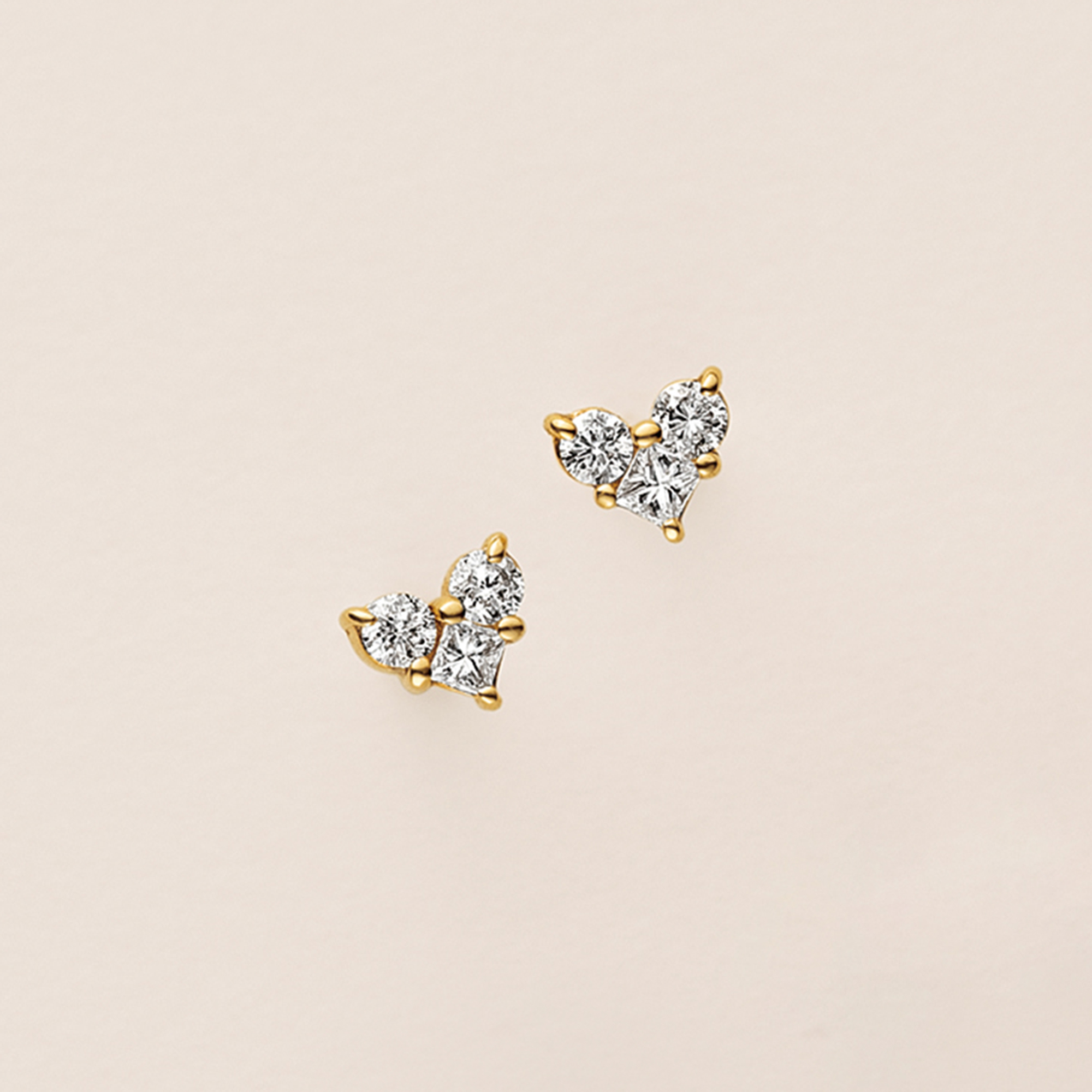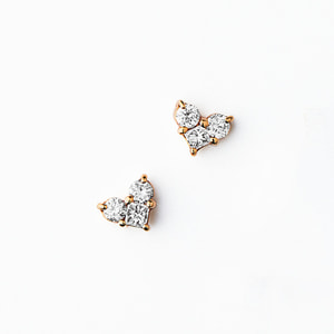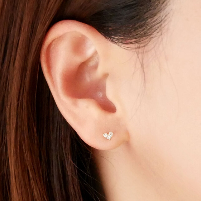 ラウンドカット2石、プリンセスカット1石のダイヤモンドを使ったシンプル&スウィートなハートピアス。