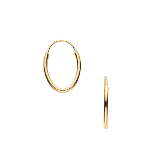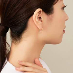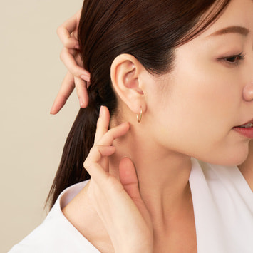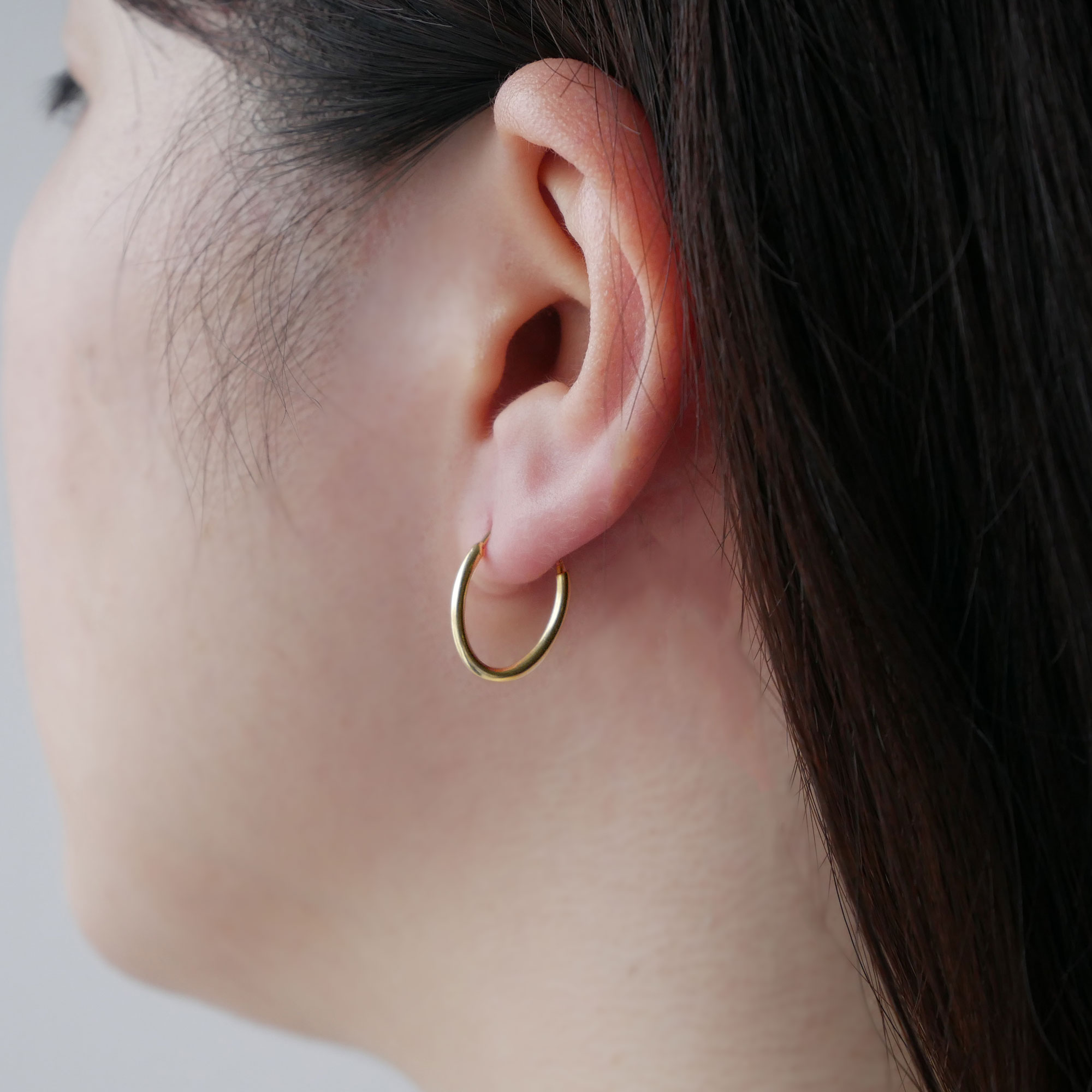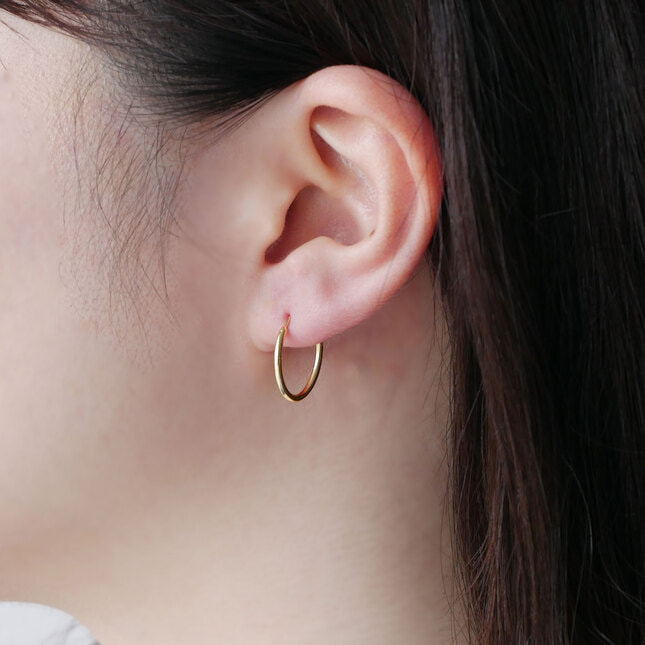 コーディネートをさりげなく華やかに見せてくれるイエローゴールドのフープピアス。