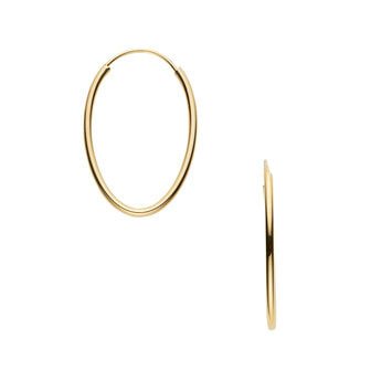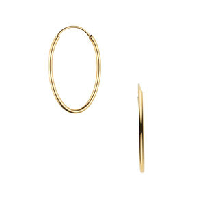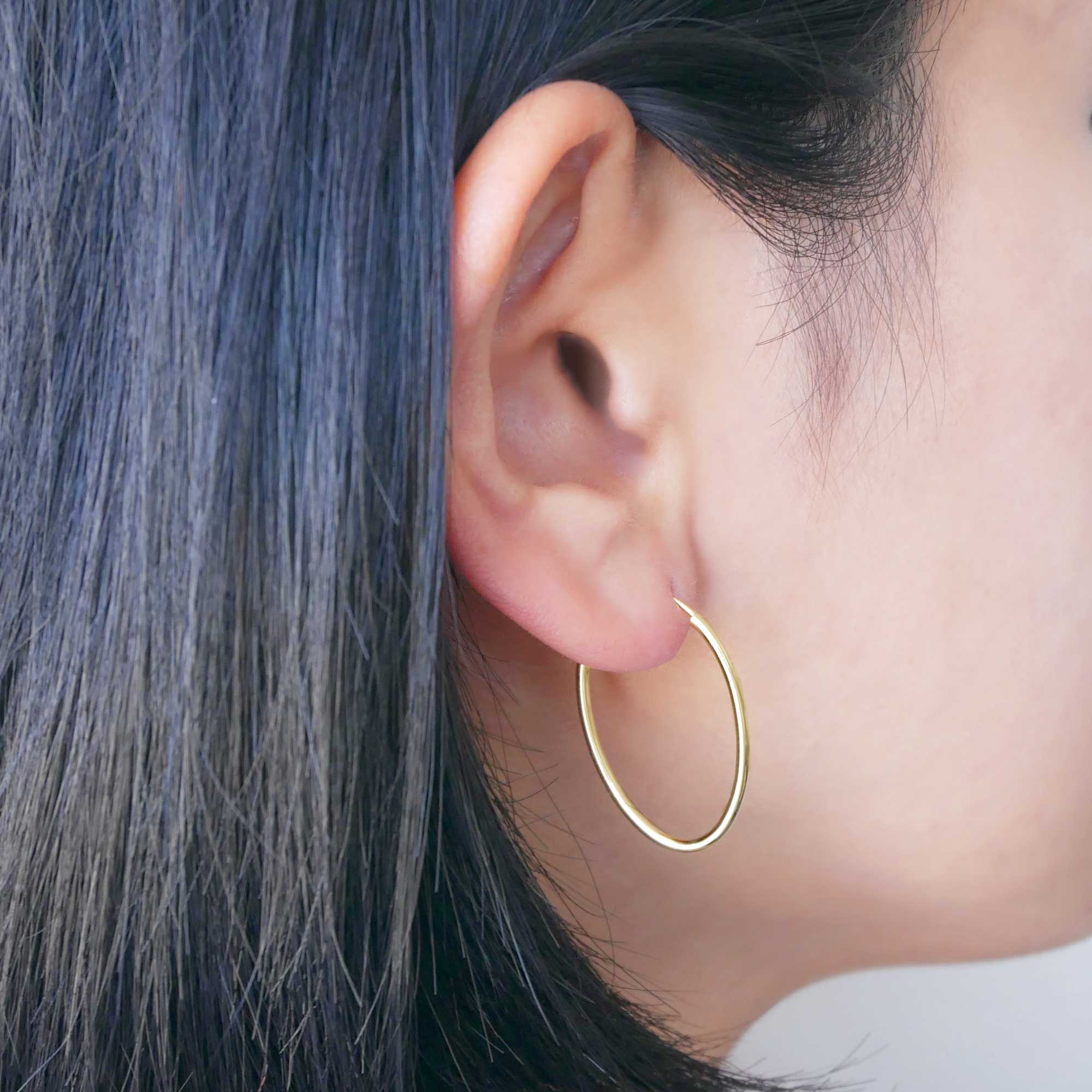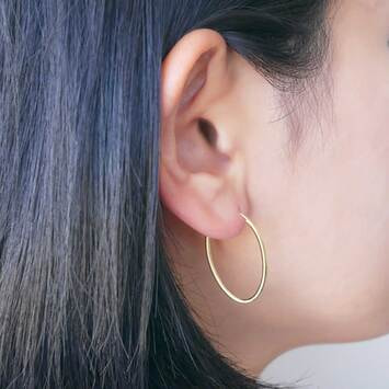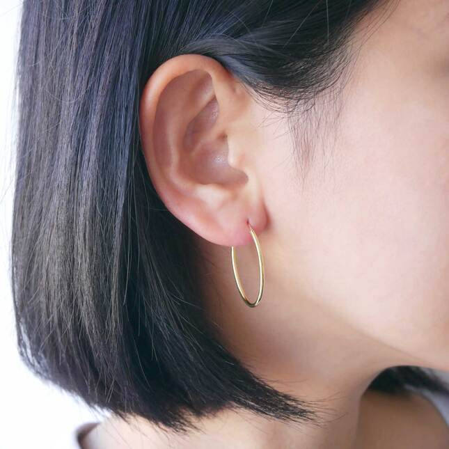 コーディネートをさりげなく華やかに見せてくれるイエローゴールドのフープピアス。