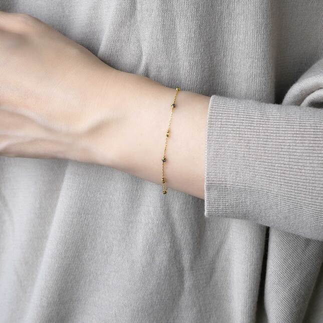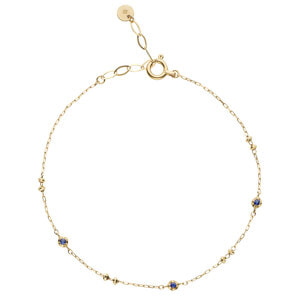 身に着ける人の動きに合わせて輝きを放つ、イエローゴールドのパーツとサファイアがリズミカルに並んだステーションタイプのブレスレット。
