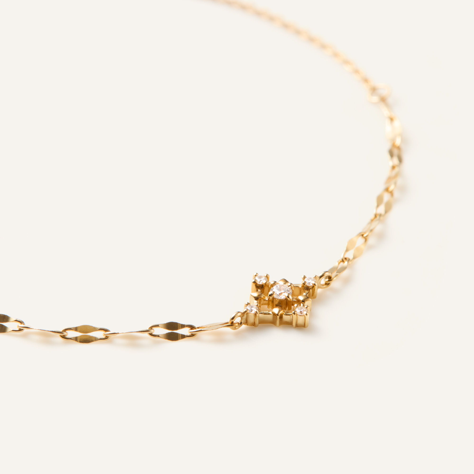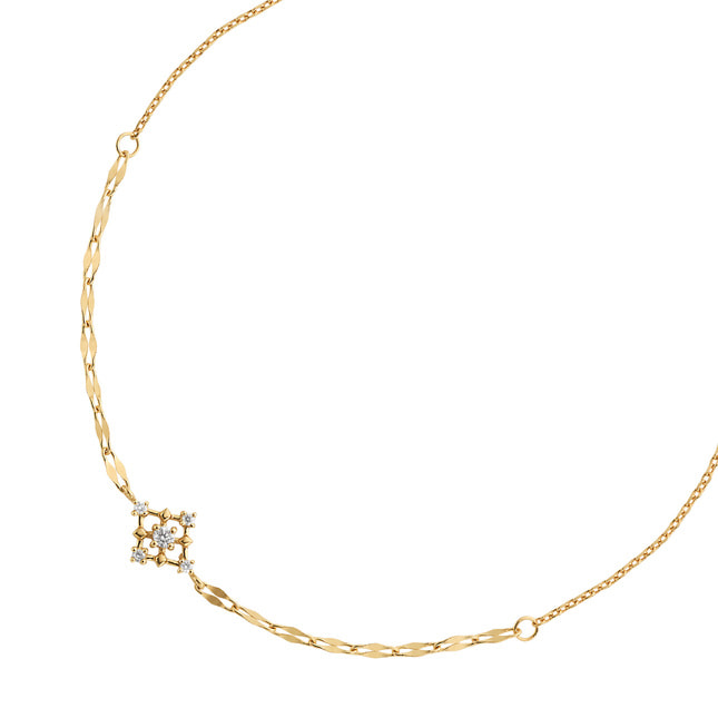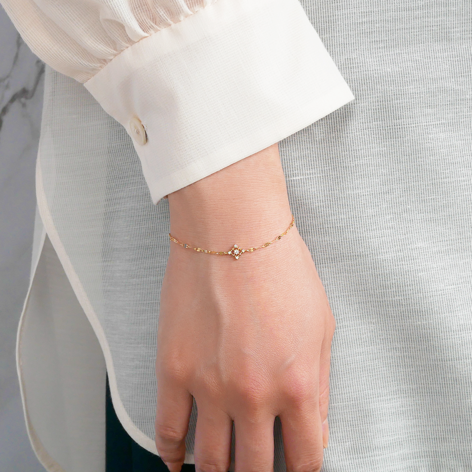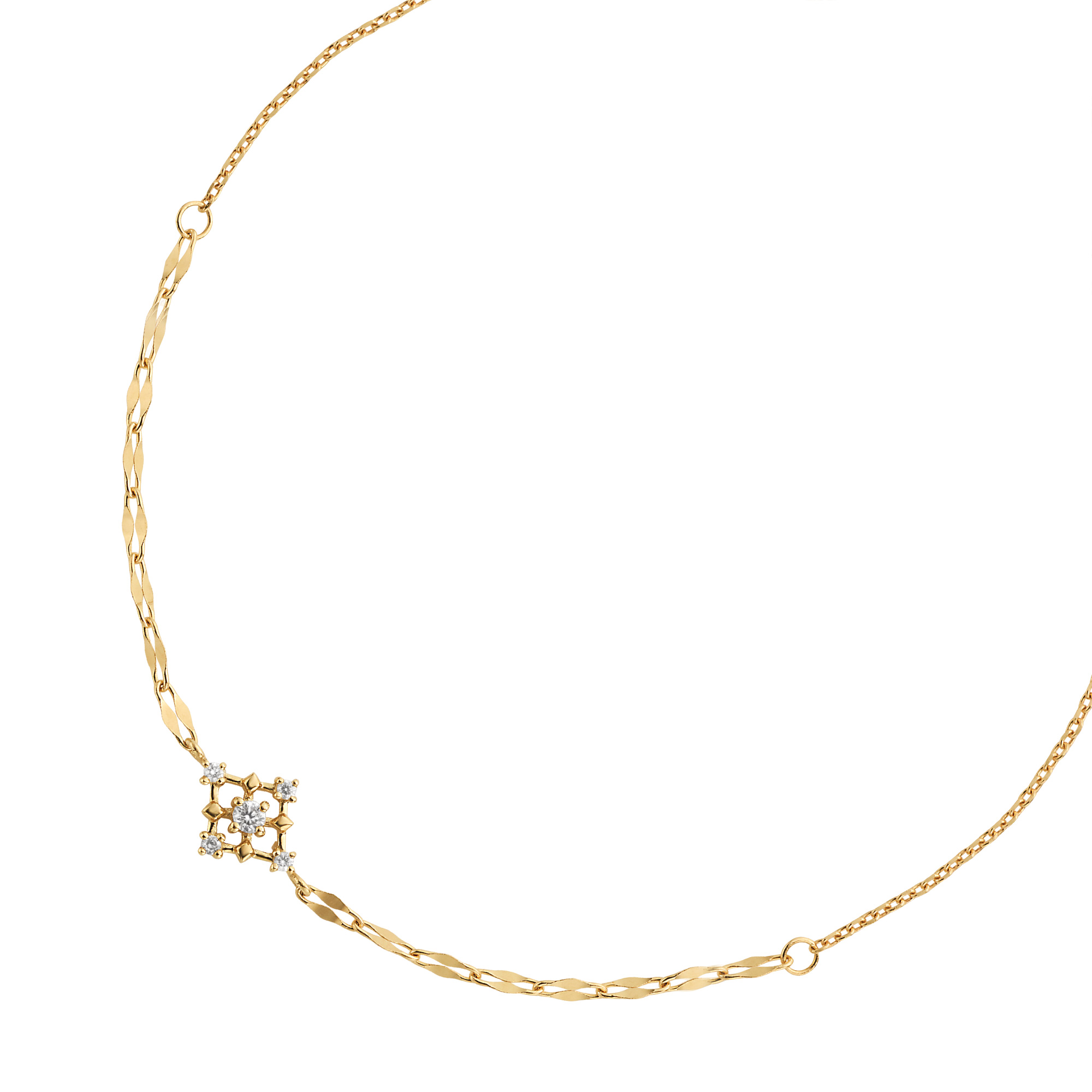 繊細に光り輝くエクラレースシリーズ。 星のきらめきのようなロマンチックなブレスレット。 レースのように繊細な印象を醸し出し、ちりばめられたダイヤモンドがきらめきます。 花びらのようなペタルチェーンが煌めきを放ち、華やぎを添えます。 日常のコーディネートにプラスするだけで一気に手元を華やかにするおすすめアイテムです。▼シリーズアイテムはこちら▼エクラレースシリーズはこちら▼4月の誕生石ダイヤモンドのアイテムはこちら