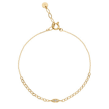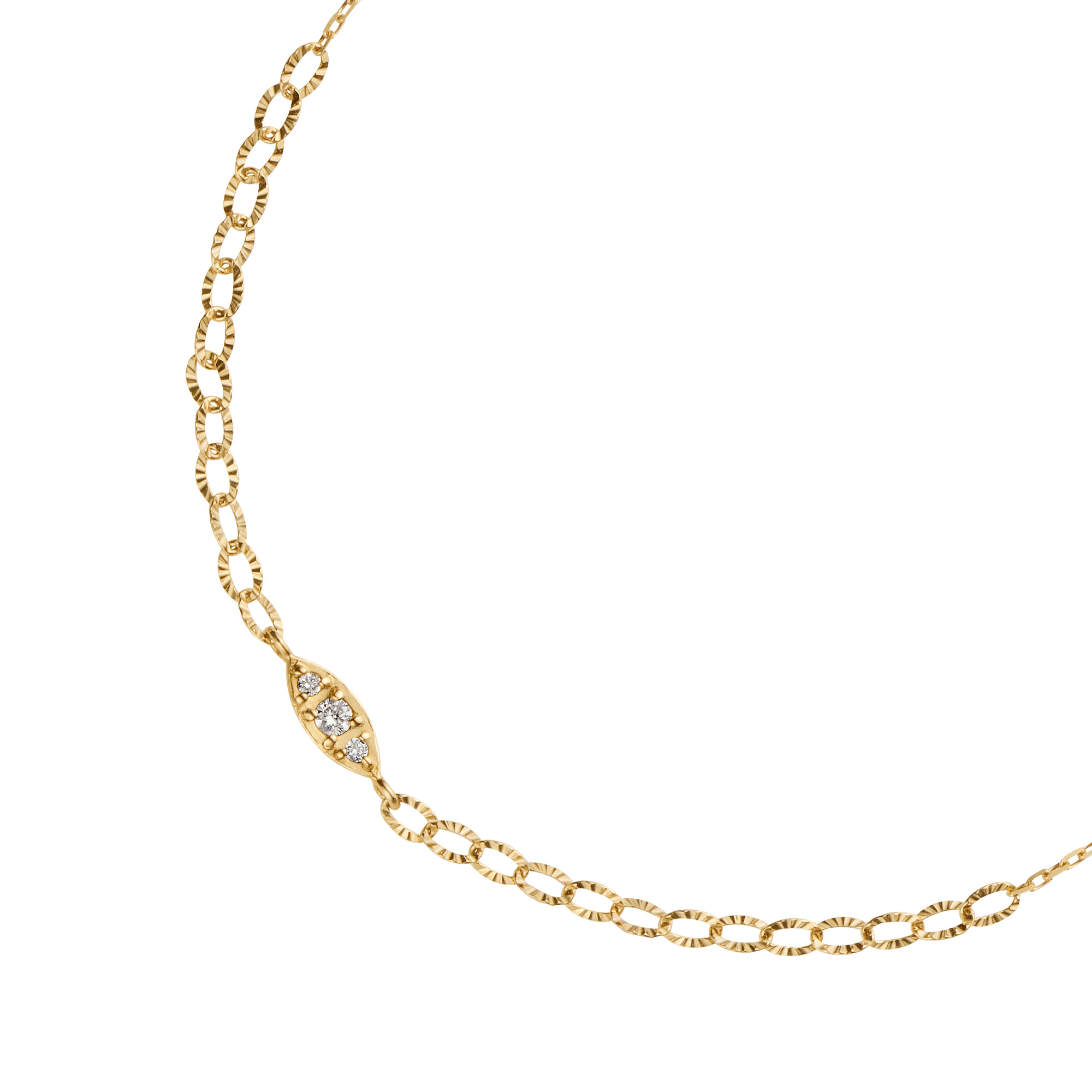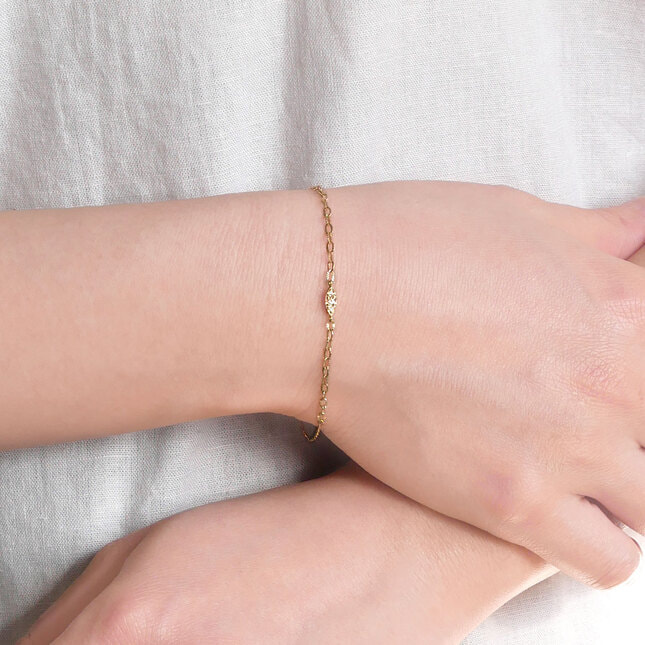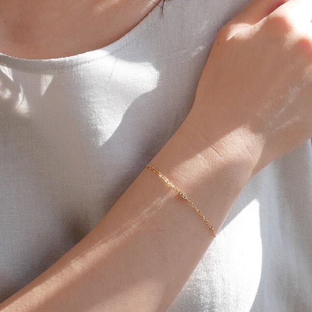 1コマずつに細かなテクスチャーが入ったレースのようなチェーンが輝きを放ち、手元に華やかさを添えます。