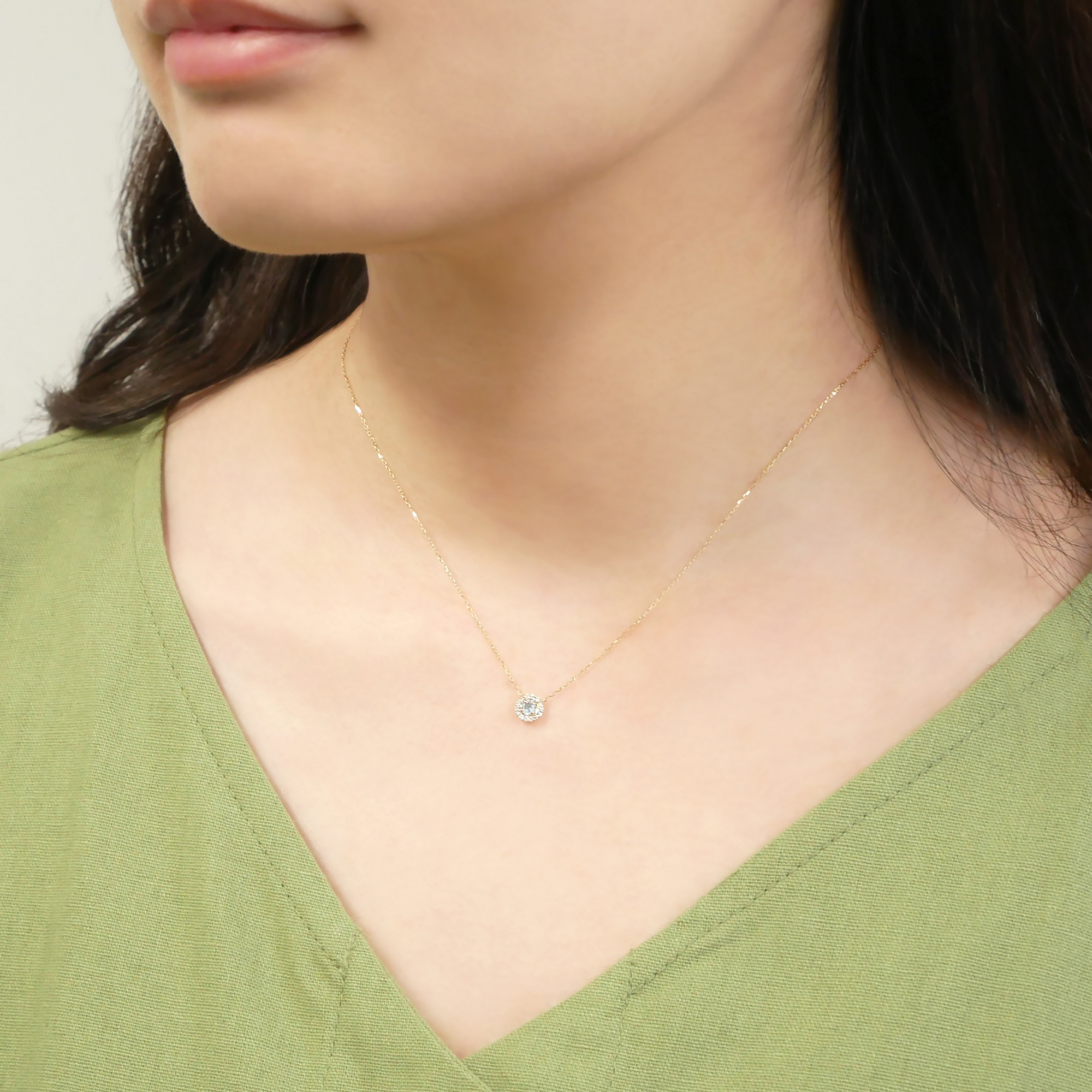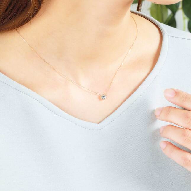 3月の誕生石であるアクアマリンをダイヤモンドで取り巻いたネックレス。