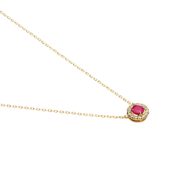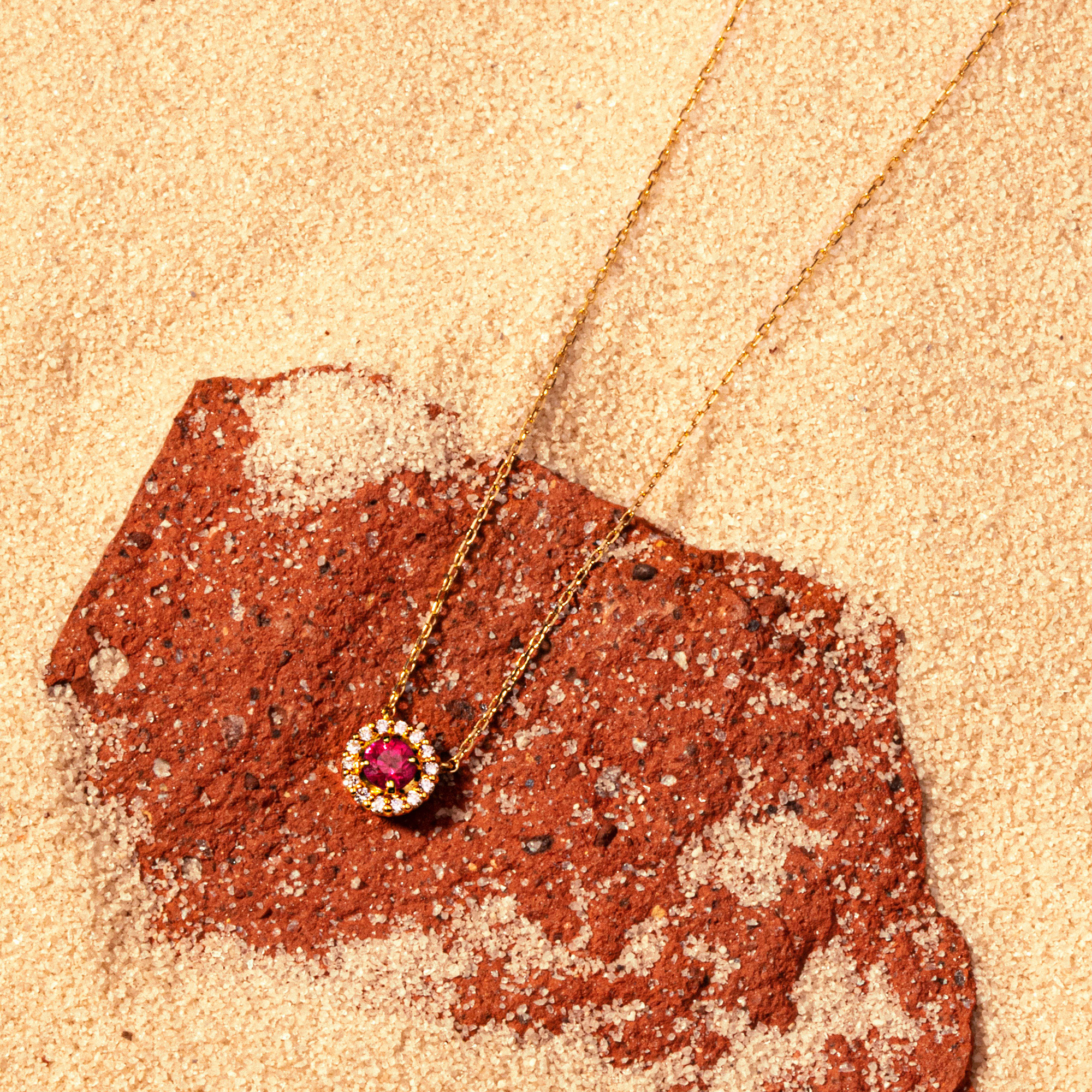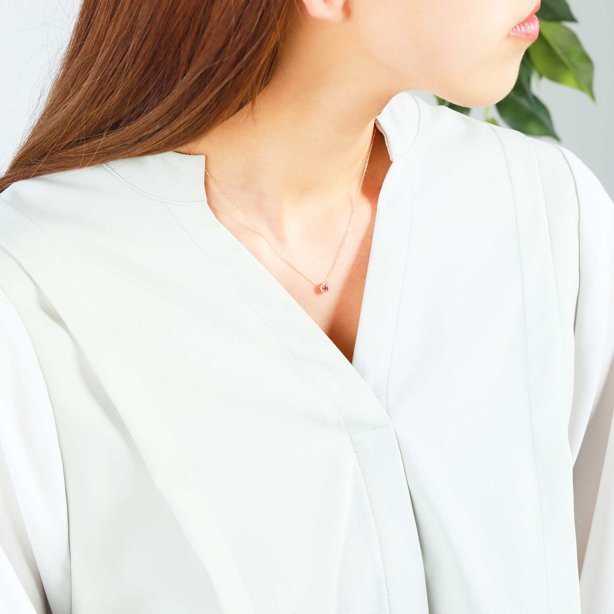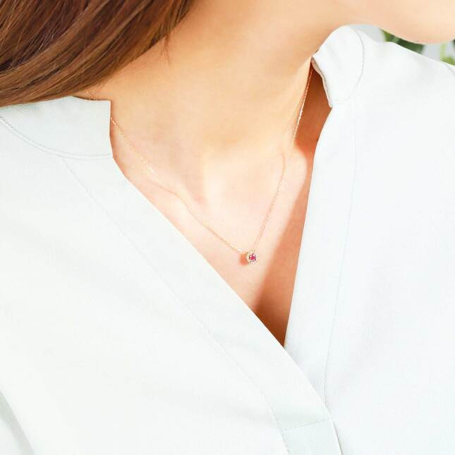 大人の可愛らしさを感じさせるルビーをダイヤモンドのきらめきで取り巻いたネックレス。