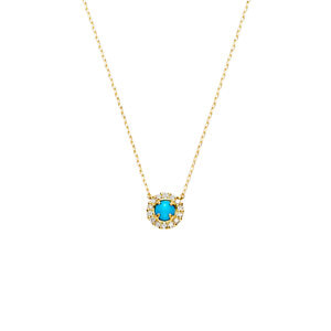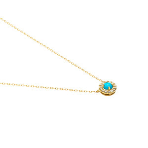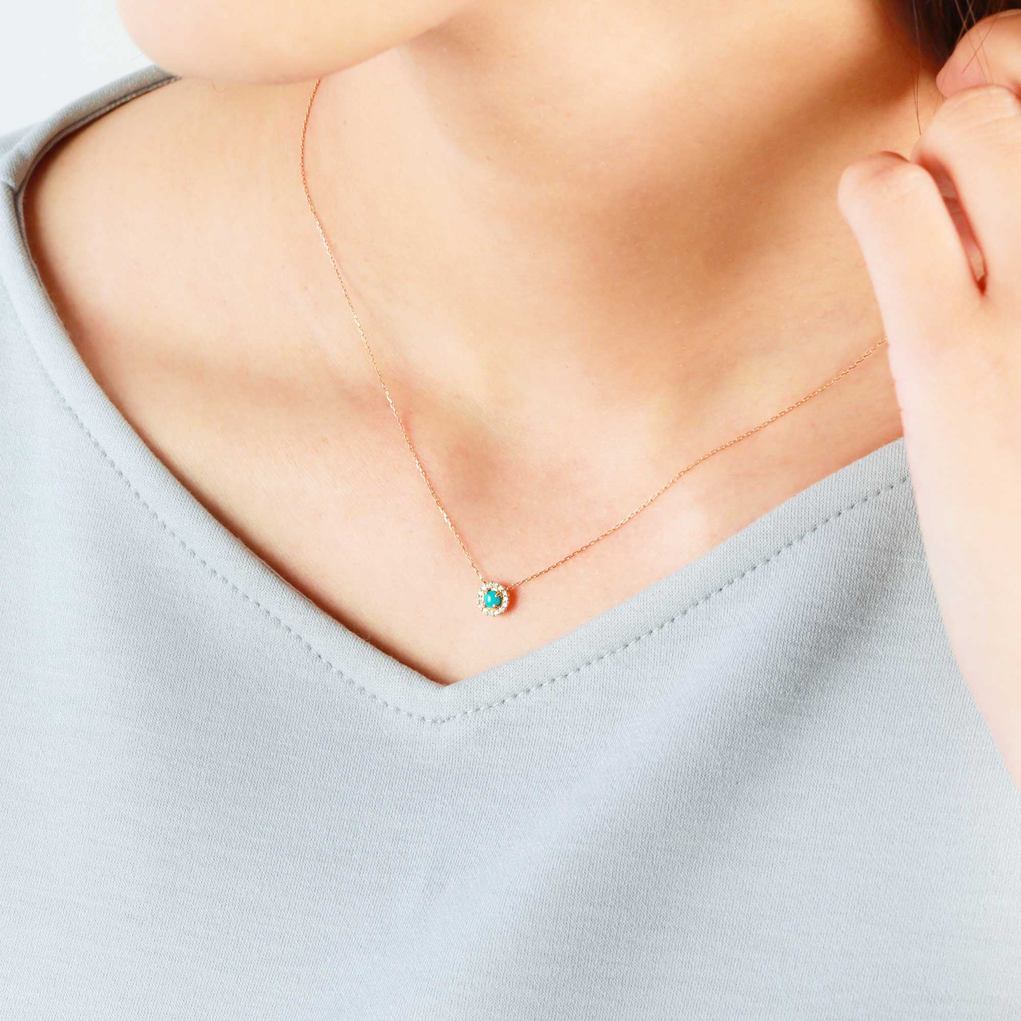 鮮やかなターコイズをダイヤモンドで縁取った、クラシカルで華やかなデザインのネックレス。